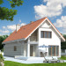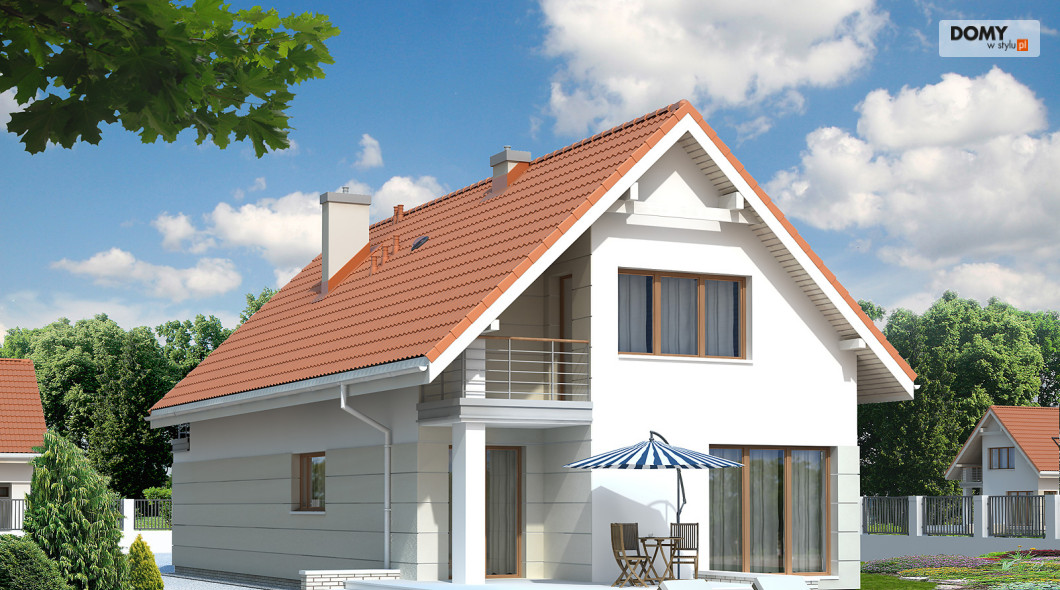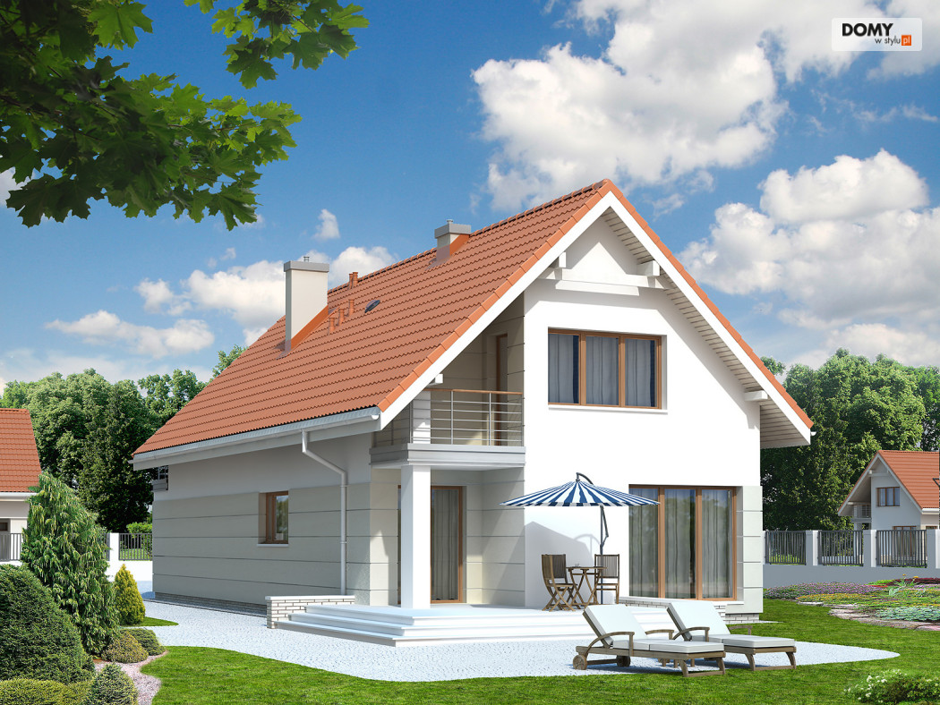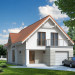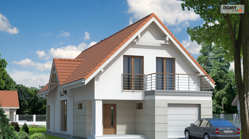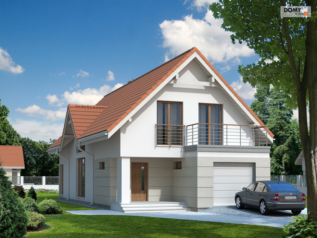 Dom na wąską działkę, z garażem od frontu. Na parterze zaprojektowano część dzienną z salonem, kuchnią i jadalnią. Na poddaszu znajdują się trzy sypialnie, garderoba i łazienka z pralnią.