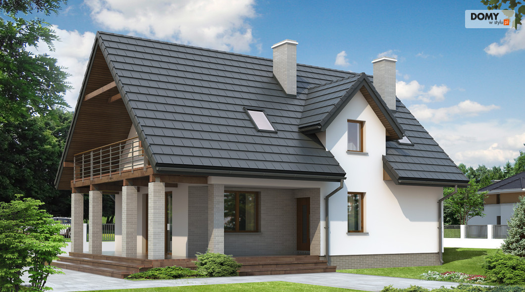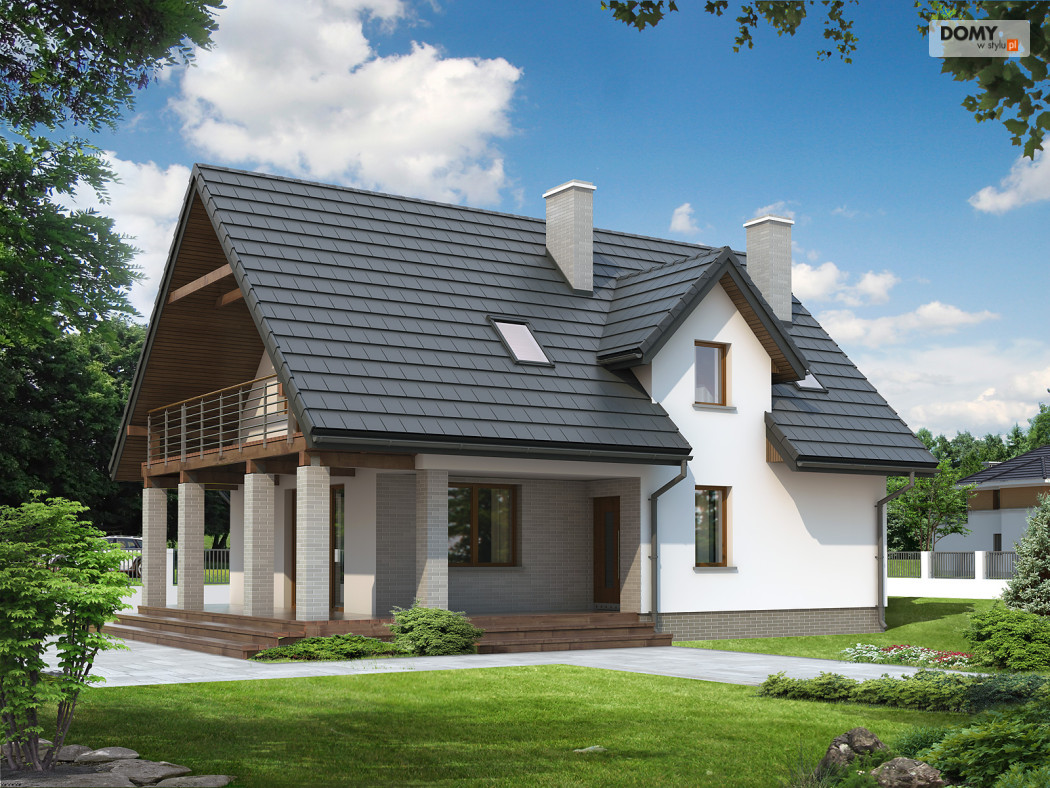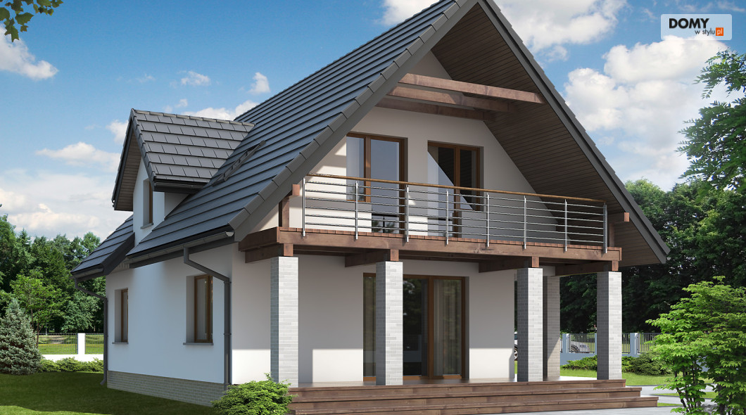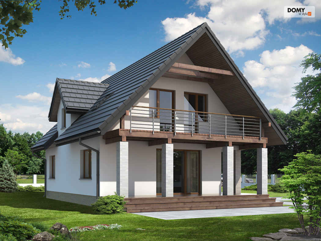 Nieduży dom jednorodzinny, przeznaczony dla 4-osobowej rodziny. Na parterze zaprojektowano pomieszczenia strefy dziennej: salon z jadalnią i kuchnię oraz pomieszczenia gospodarcze: spiżarnię i kotłownię. Na poddaszu zlokalizowano pomieszczenia strefy nocnej: trzy sypialnie, łazienkę i garderobę. Do domu przylega zadaszony taras, a dwie sypialnie wzbogacone są zadaszonym, dużym balkonem.