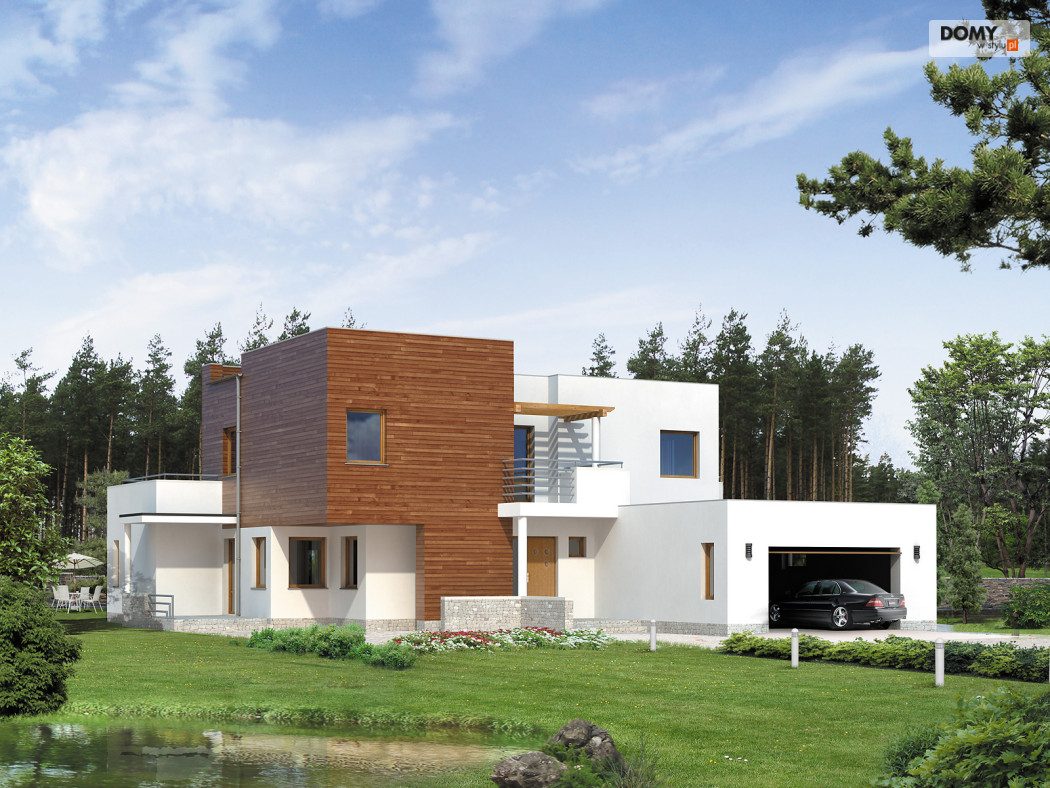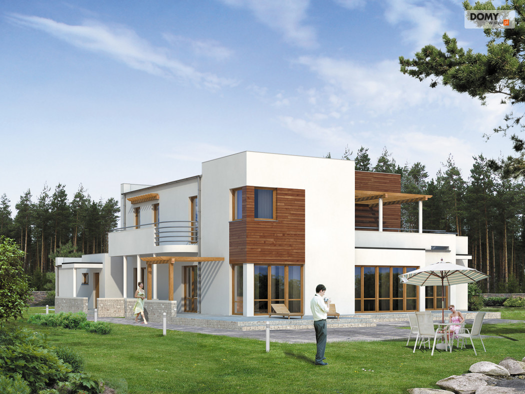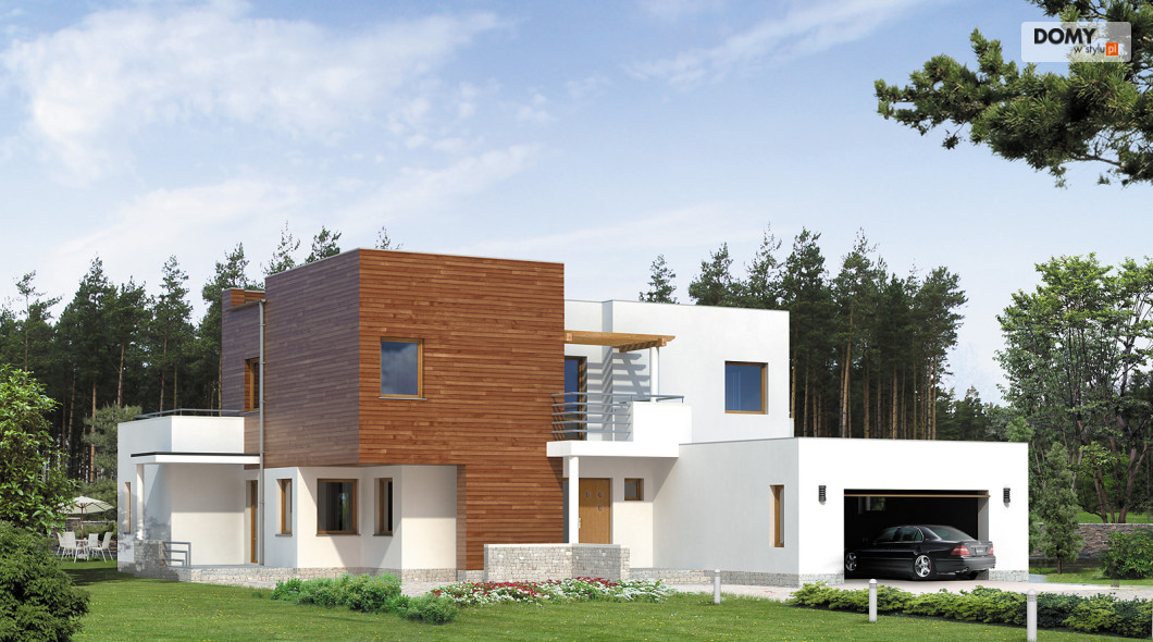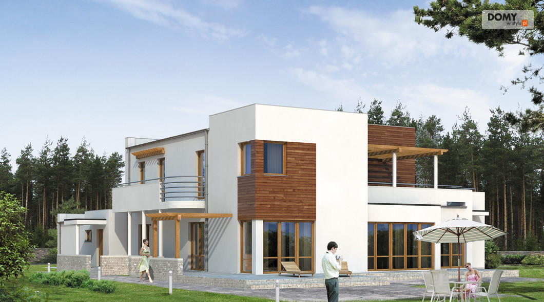 Dom jednorodzinny z piwnicą i dwustanowiskowym garażem przewidziany dla wieloosobowej rodziny. Nowoczesna bryła z płaskimi dachami. Na parterze zaprojektowano pokój dzienny, bibliotekę, kuchnię z jadalnią i spiżarnią, oranżerię i gabinet. Na piętrze znajdują się trzy sypialnie, trzy łazienki, pralnia oraz dwa obszerne tarasy i balkon.