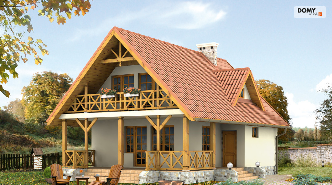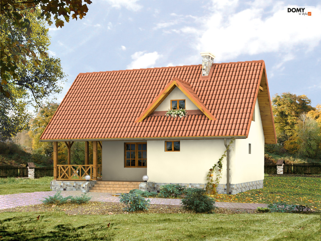 Mały dom jednorodzinny z użytkowym poddaszem i podpiwniczeniem. Prosty, funkcjonalny układ. Duży zadaszony taras. Istnieje wersja domu letniskowego.