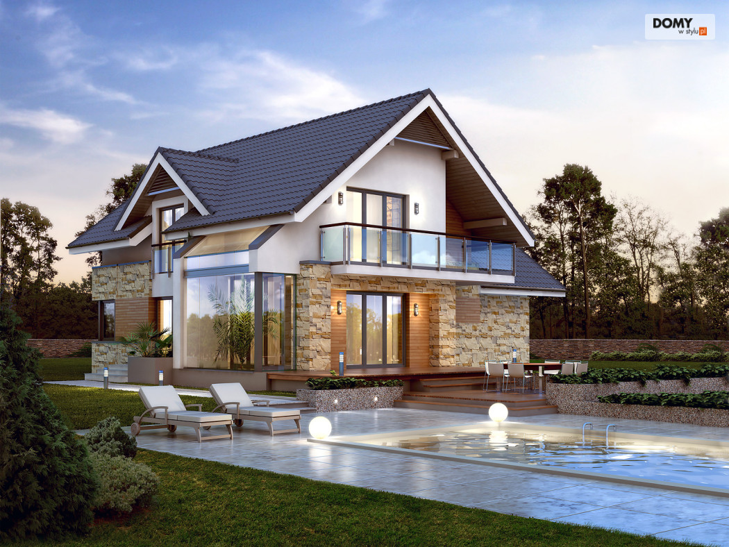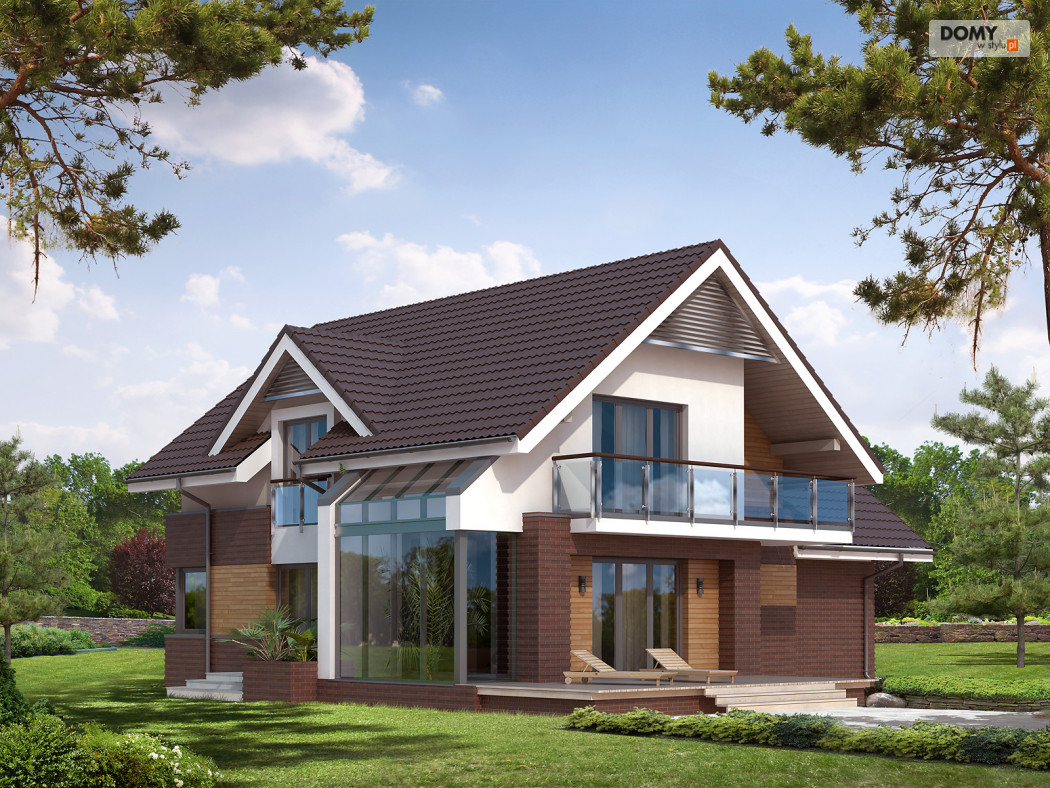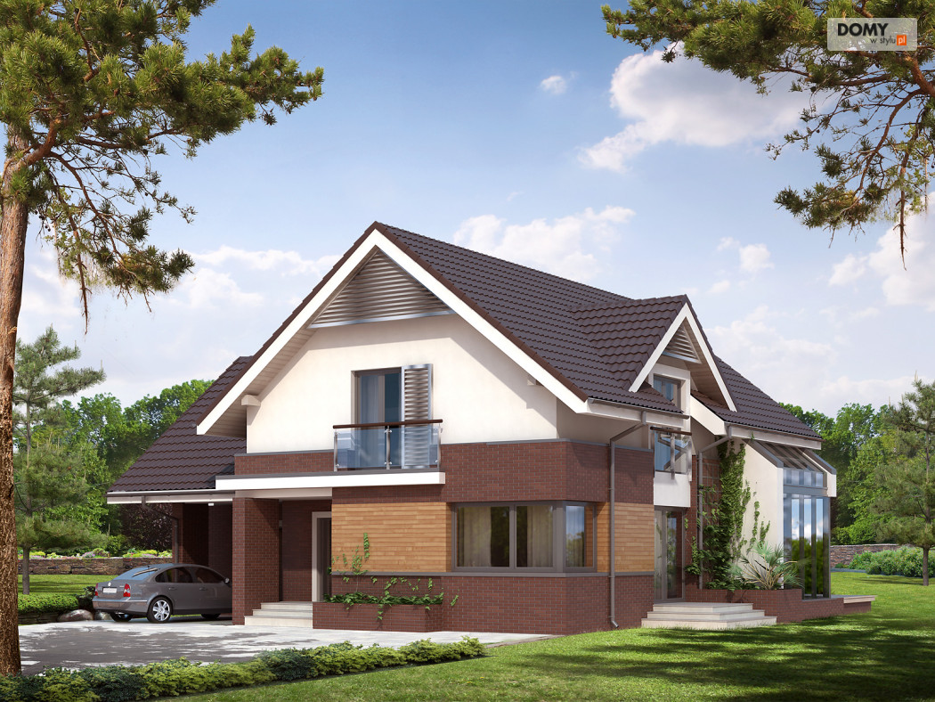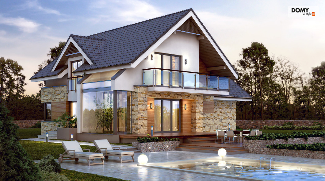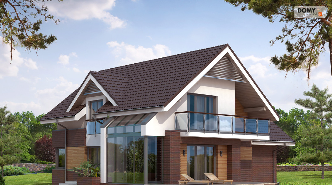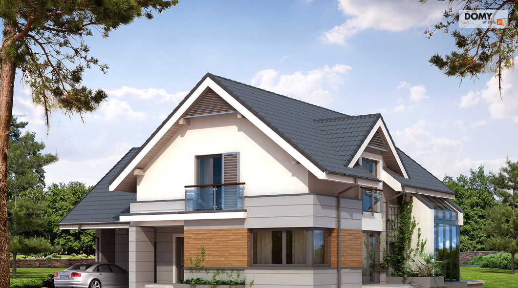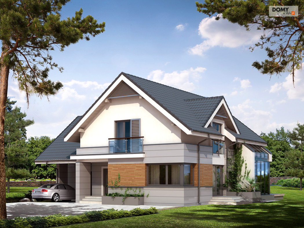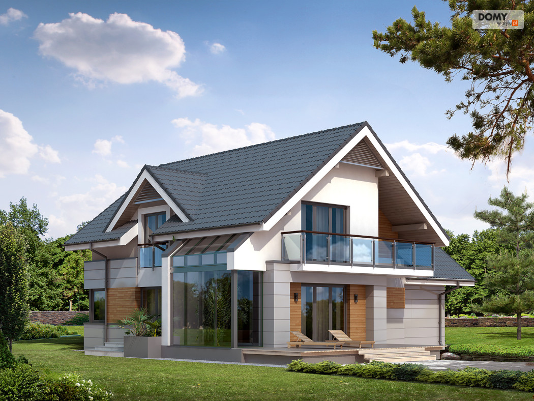 Nowoczesny dom mieszkalny projektowany według standardów przyjętych w domach energooszczędnych. W dużych przestronnych wnętrzach parteru zaprojektowano oranżerię. Na poddaszu zaprojektowano trzy sypialnie oraz pokój zabaw lub hobby nad garażem. Projekt może być spełnieniem marzeń o mieszkaniu w nowoczesnym wnętrzu rodzinnego domu.