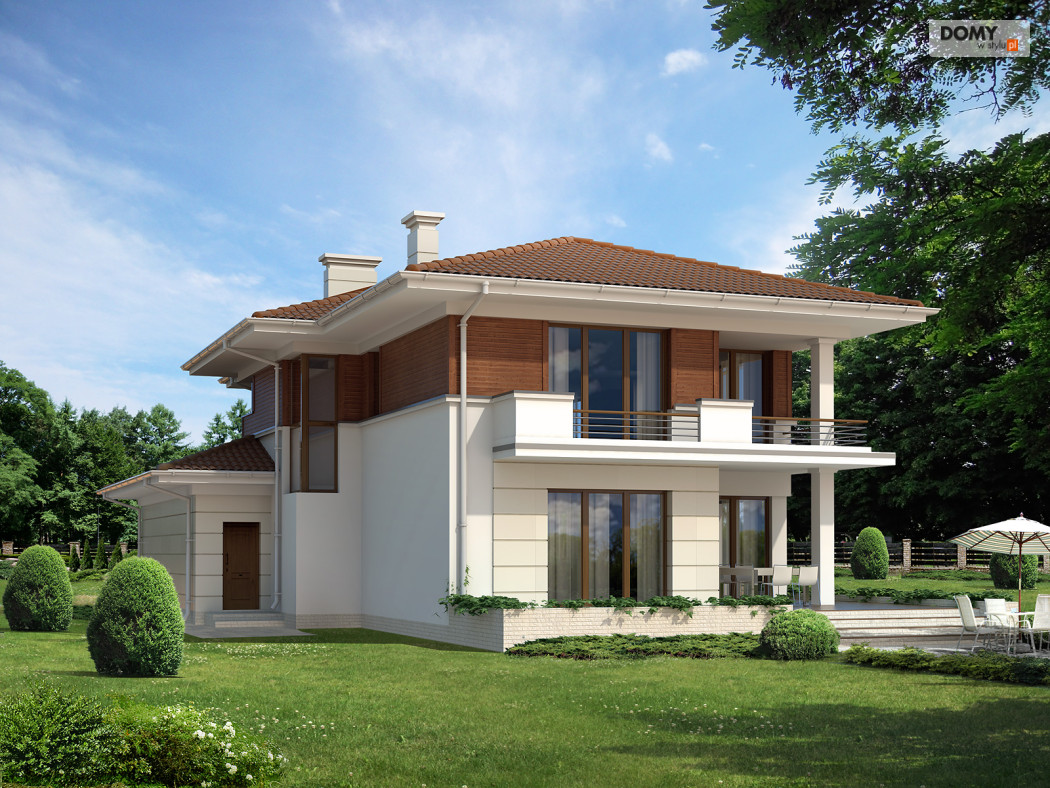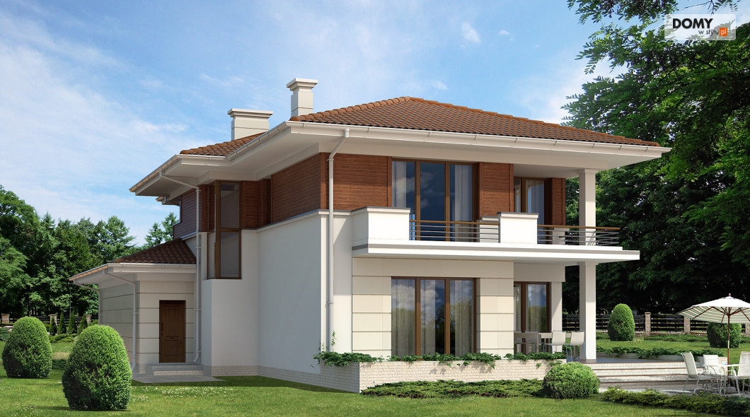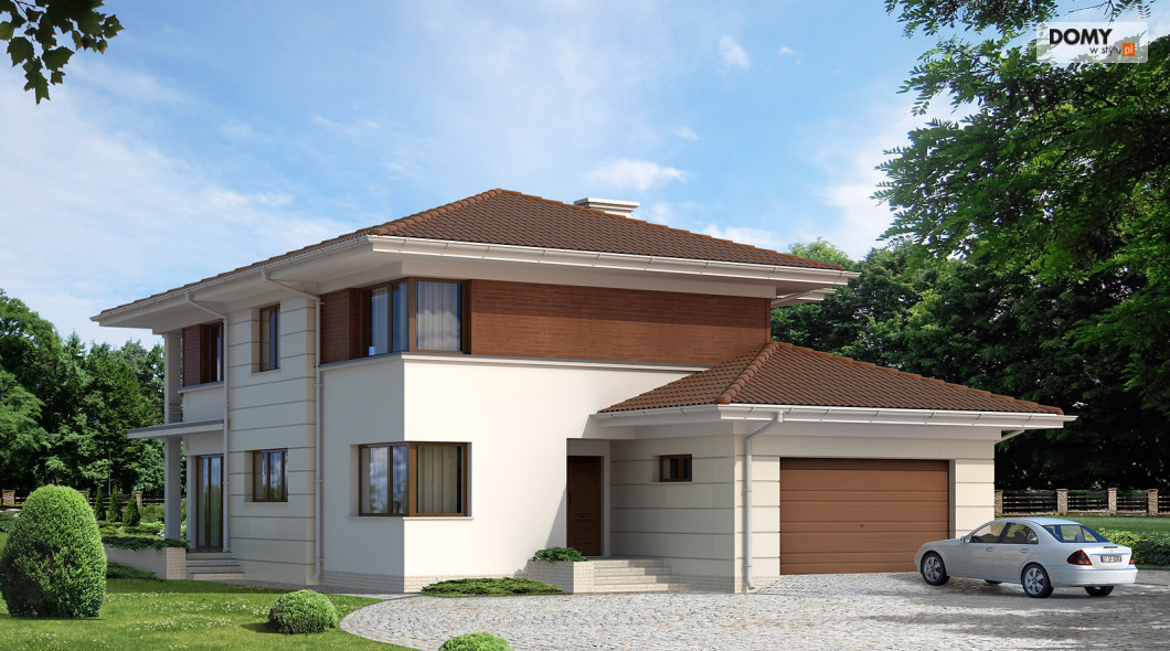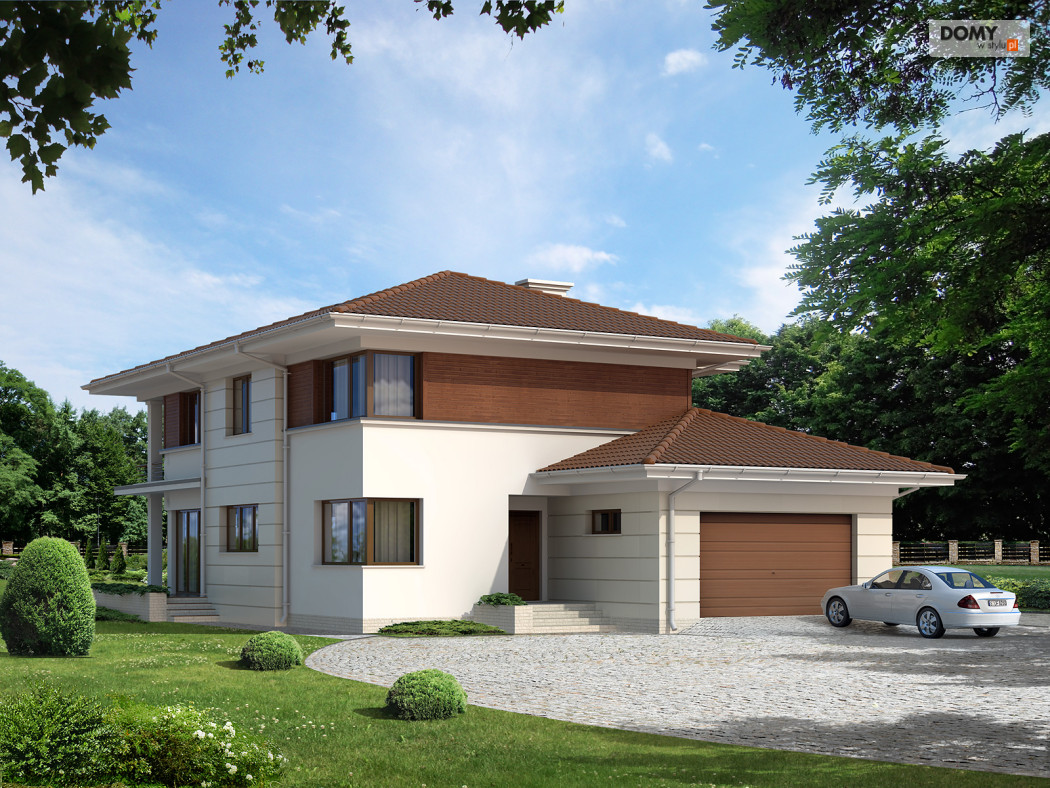 Dom jednorodzinny, piętrowy, niepodpiwniczony, z garażem dwustanowiskowym. Przeznaczony dla 5-osobowej rodziny. Posiada zadaszony taras. Na parterze, oprócz pokoju dziennego, kuchni i jadalni, zaprojektowano dodatkowy pokój.
