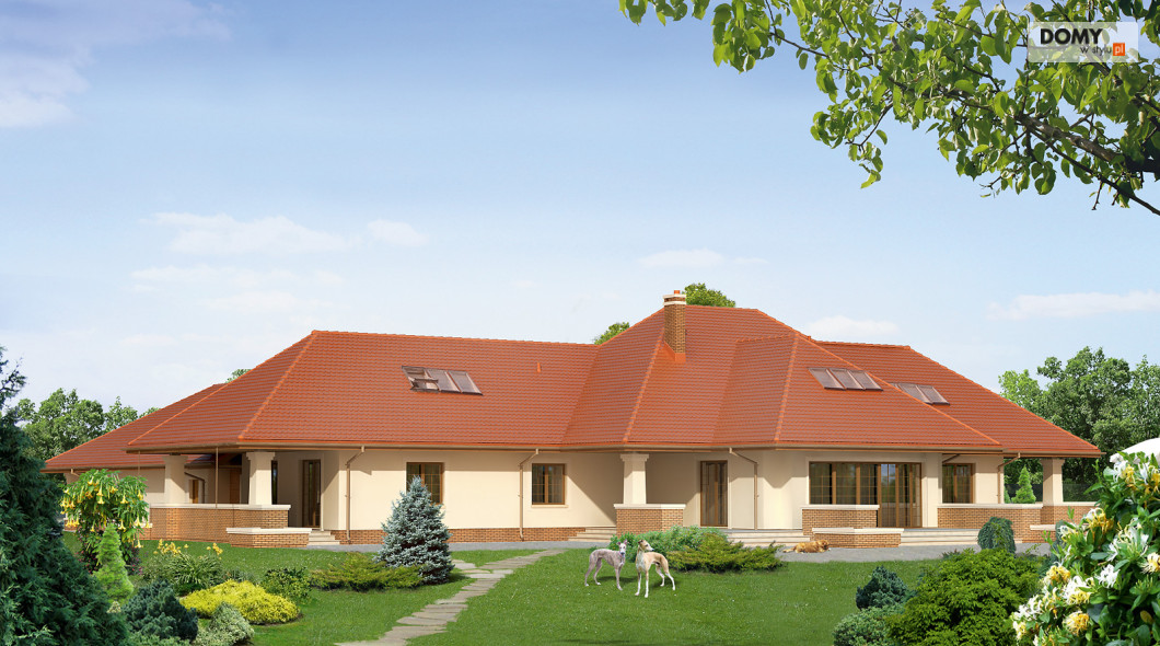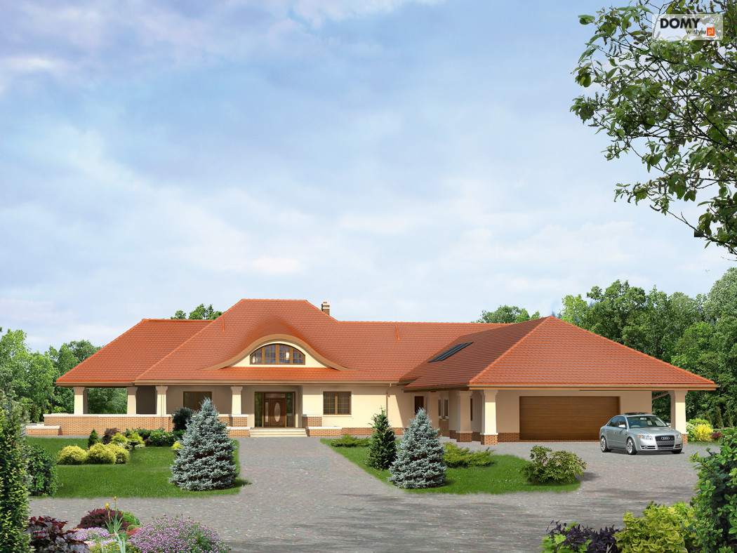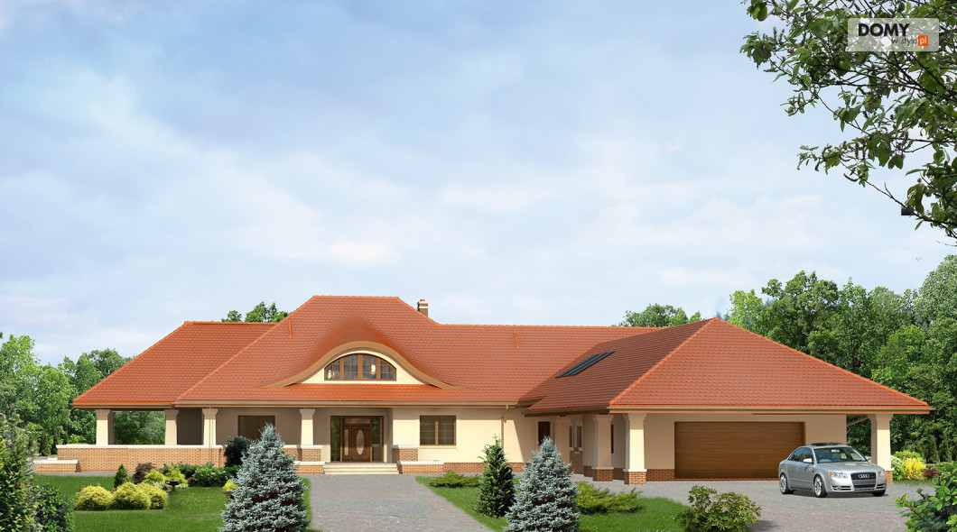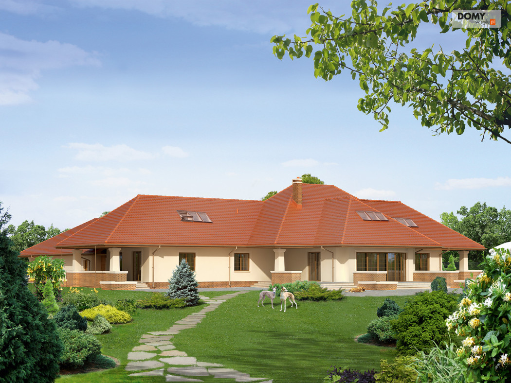 Reprezentacyjny, parterowy dom z użytkowym poddaszem i obszernym gabinetem. W ciekawej bryle, bogatej w detale, zaprojektowano szereg pomieszczeń, które pozwolą na wygodne użytkowanie domu przez wieloosobową rodzinę.