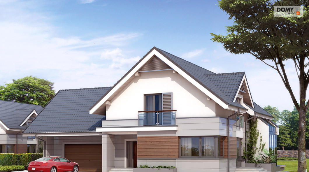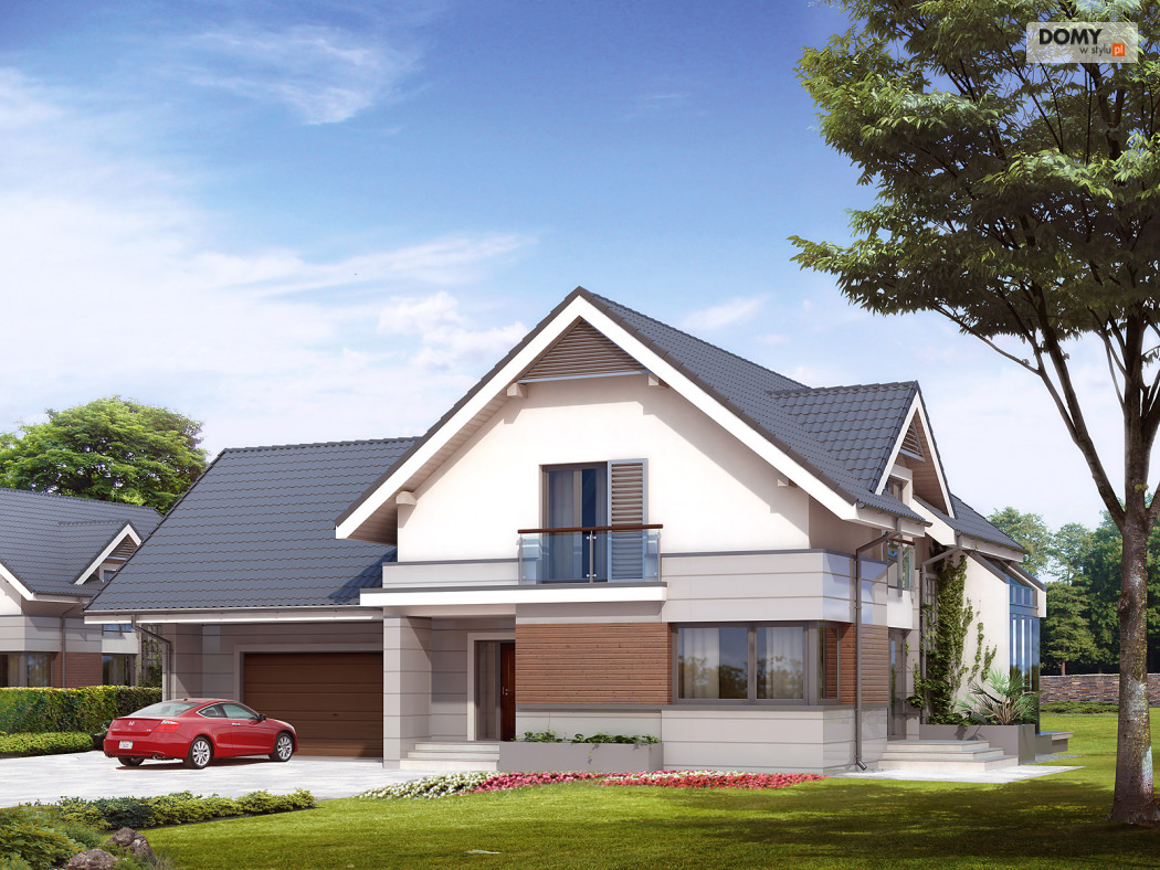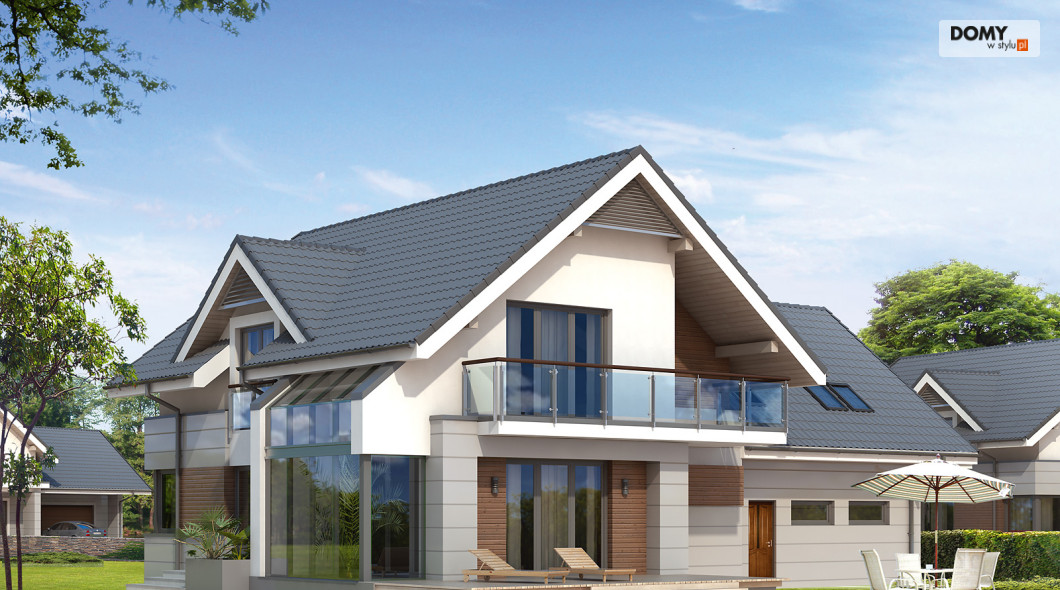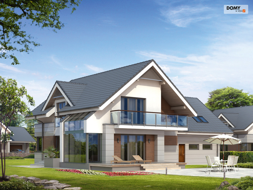 Nowoczesny dom mieszkalny projektowany według standardów przyjętych w domach energooszczędnych. W dużych przestronnych wnętrzach parteru zaprojektowano oranżerię. Na poddaszu zaprojektowano trzy sypialnie oraz pokój zabaw lub hobby nad garażem.