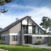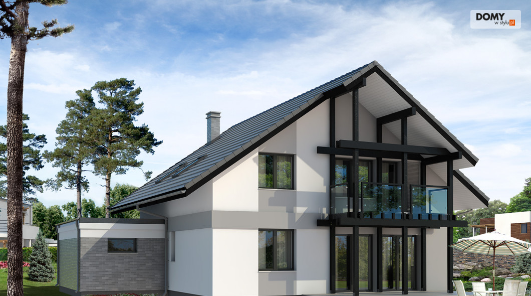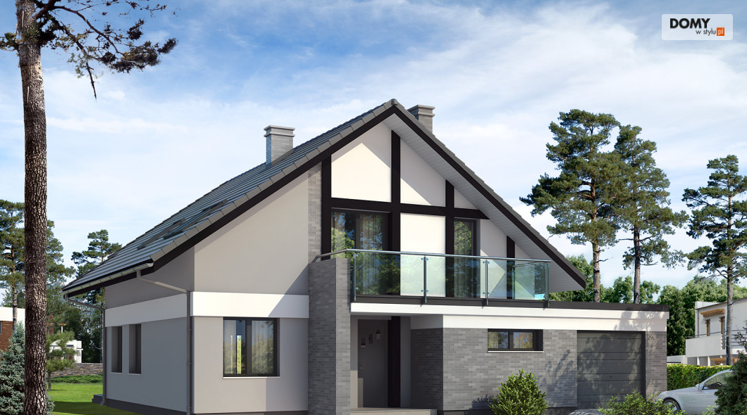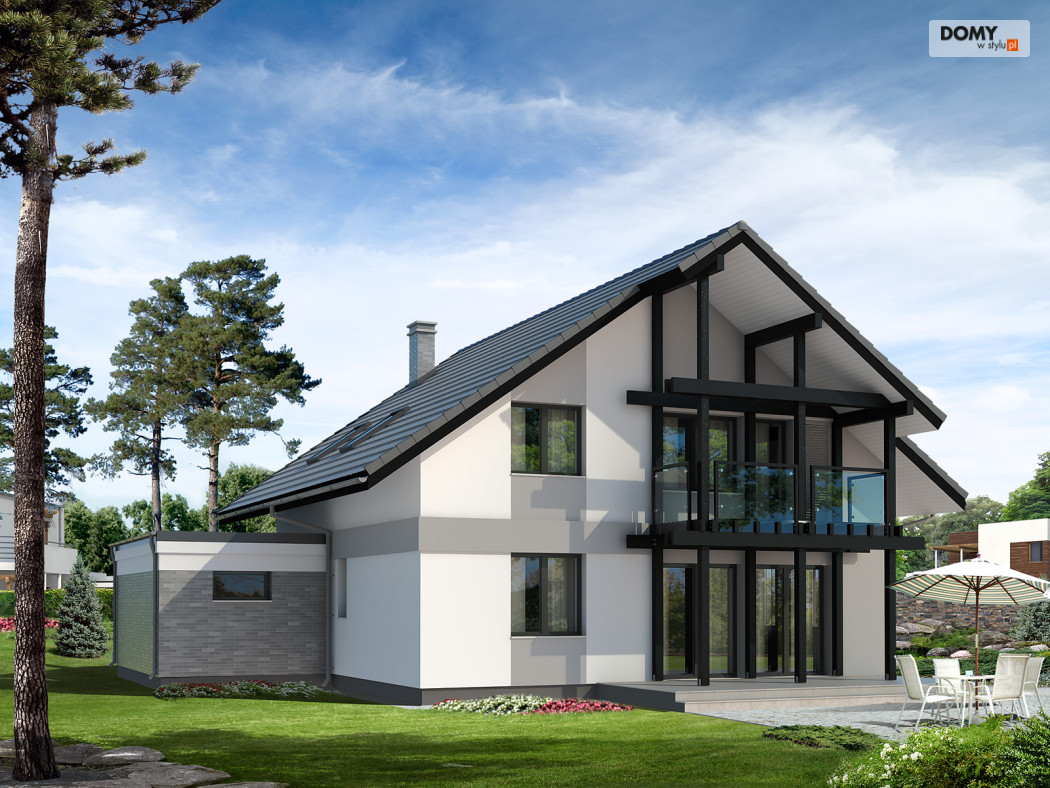 Budynek jednorodzinny przeznaczony dla rodziny 4 – 5-osobowej. Zwarta bryła domu oparta na kwadracie wzbogacona została dostawioną bryłą garażu i konstrukcją balkonu zadaszającego wejście główne. Ażurowa drewniana konstrukcja balkonu od strony ogrodowej decyduje o charakterze domu, a prosty dwuspadowy dach nabiera lekkości dzięki wysuniecu jego połaci nad tę konstrukcję. Wygodę użytkowania gwarantują liczne pomieszczenia dodatkowe: na parterze dwa pomieszczenia gospodarcze i spiżarnia, na poddaszu odrębna pralnia i garderoba.