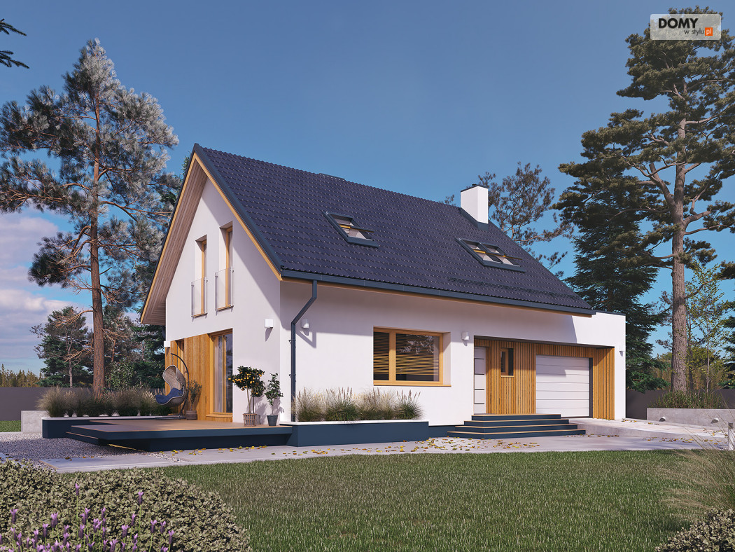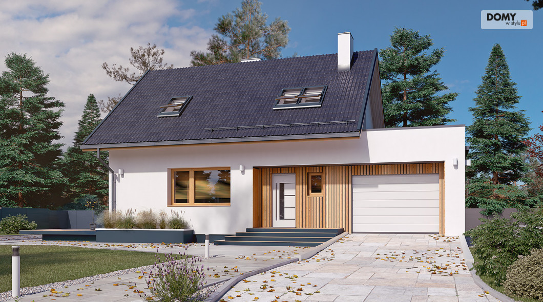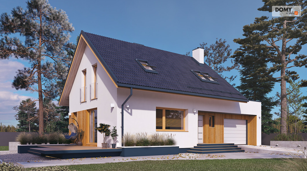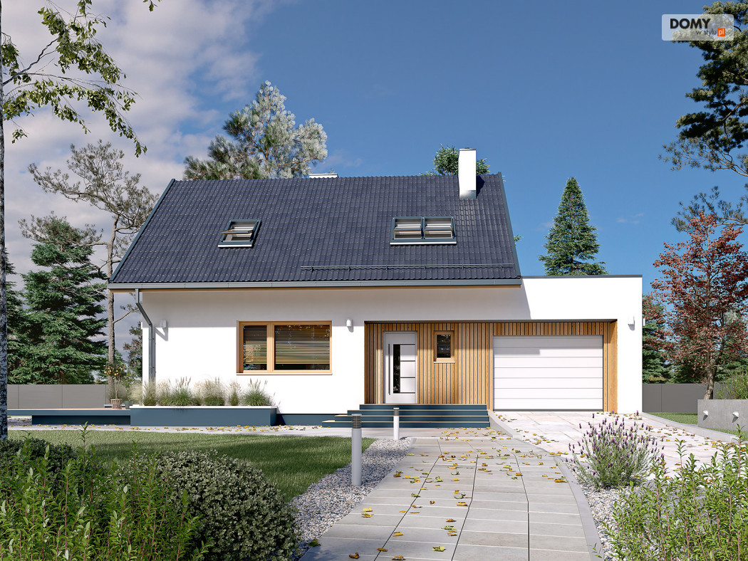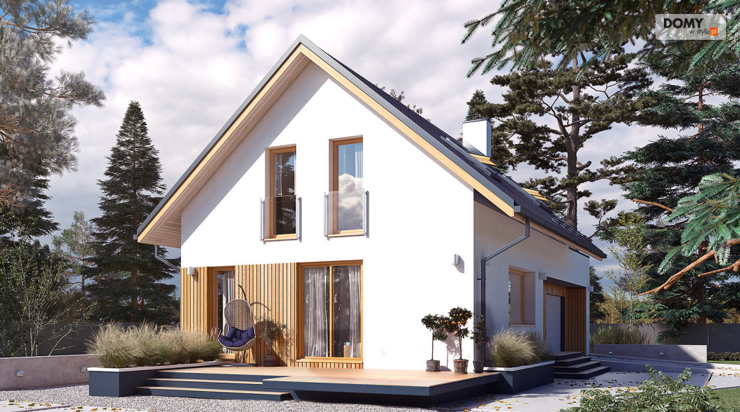 Jagoda 3 to projekt nowoczesnego domu przeznaczony na działkę z wjazdem od południa. Do bryły domu przykrytej dwuspadowym dachem dostawiony został jednostanowiskowy garaż. Program funkcjonalny domu podzielono na dwie strefy użytkowe. Strefę dzienną tworzy przestronny salon z jadalnią oraz otwarta kuchnia. Układ funkcjonalny parteru dopełnia wiatrołap, kotłownia oraz WC. Na poddaszu tradycyjnie znalazła się część nocna. Zaprojektowano tu trzy sypialnie oraz rodzinną łazienkę. Elewacje budynku wykończono białym tynkiem, płytkami ceramicznymi oraz szalówką. Projekt domu Jagoda 3 to propozycja ekonomicznego, niewielkiego domu przeznaczonego dla 4-osobowej rodziny.