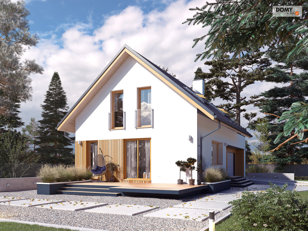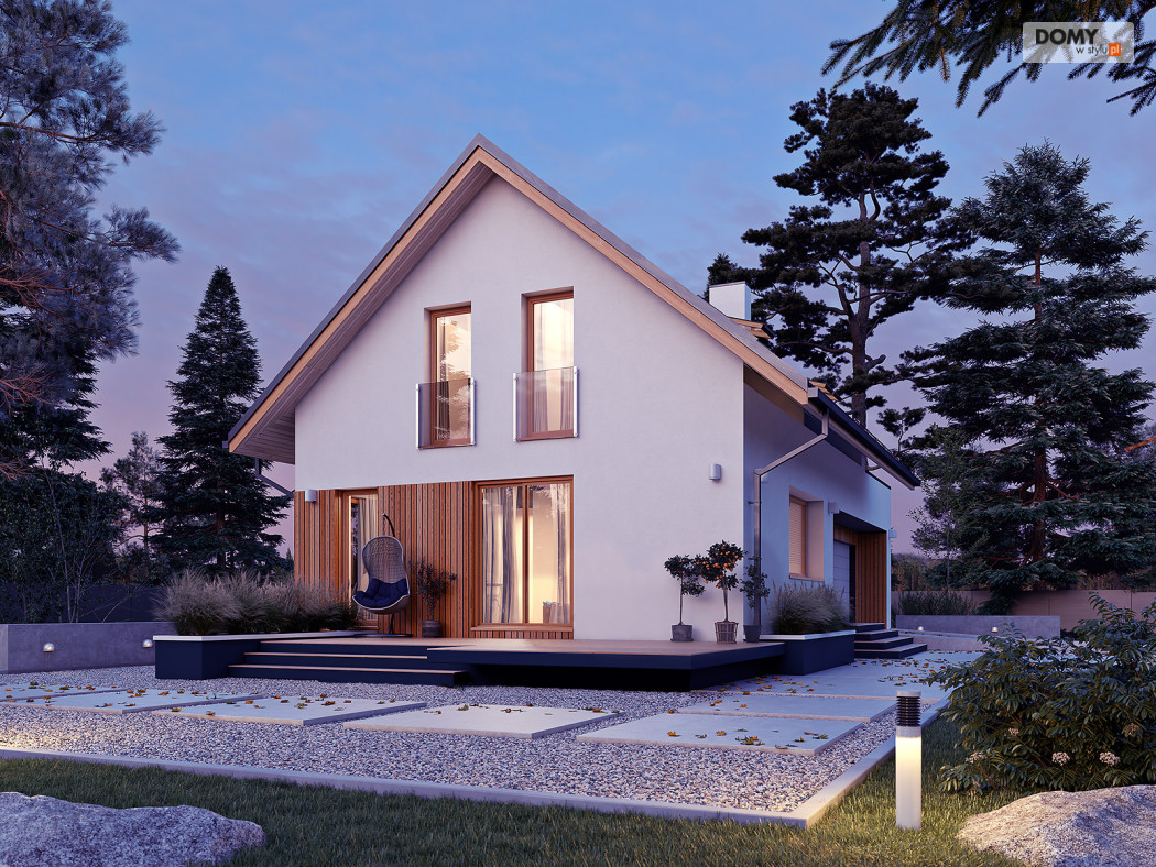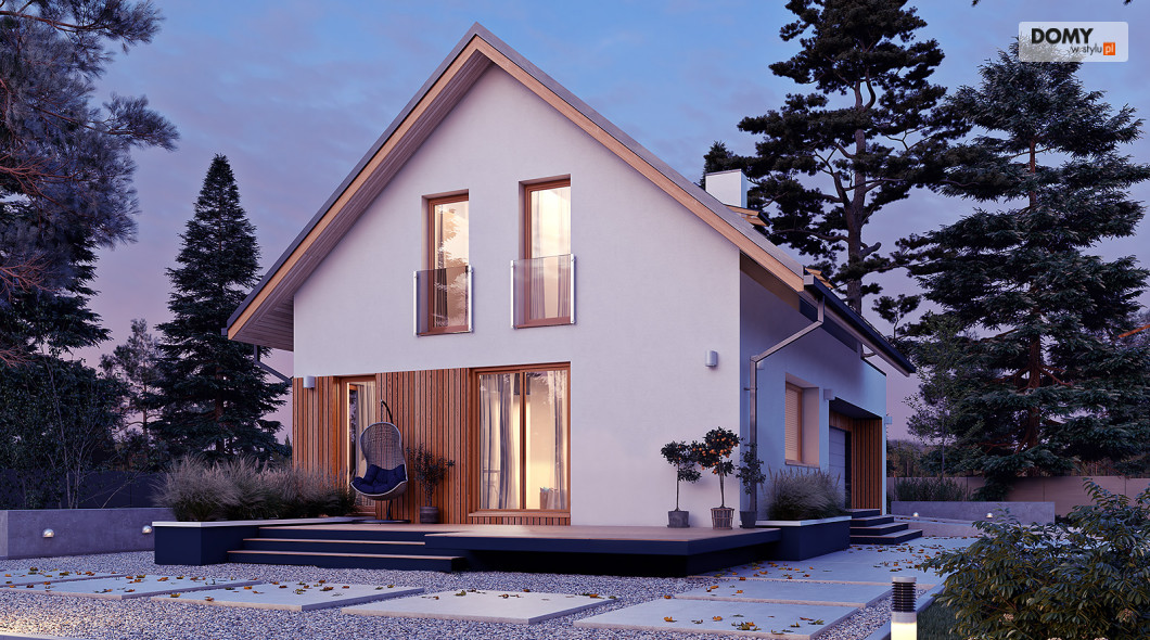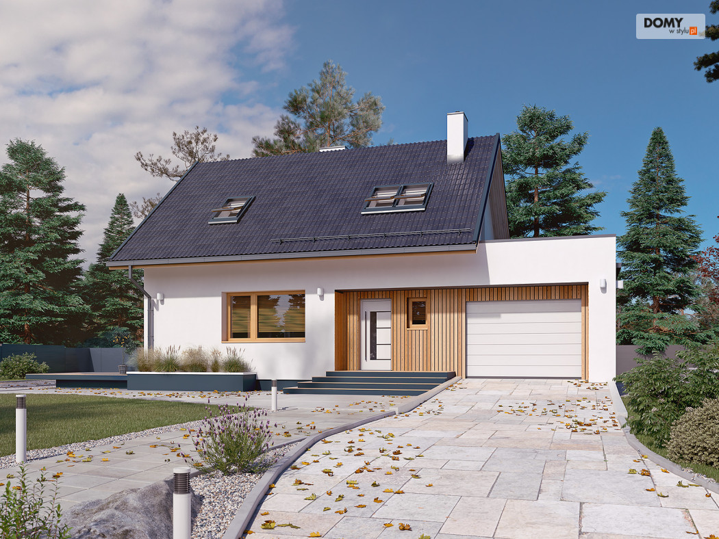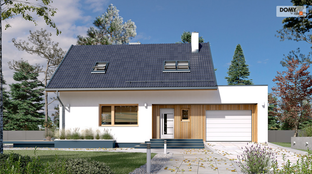 Jagoda 3 to projekt nowoczesnego domu przeznaczony na działkę z wjazdem od południa. Do bryły domu przykrytej dwuspadowym dachem dostawiony został jednostanowiskowy garaż. Program funkcjonalny domu podzielono na dwie strefy użytkowe. Strefę dzienną tworzy przestronny salon z jadalnią oraz otwarta kuchnia. Układ funkcjonalny parteru dopełnia wiatrołap, kotłownia oraz WC. Na poddaszu tradycyjnie znalazła się część nocna. Zaprojektowano tu trzy sypialnie oraz rodzinną łazienkę. Elewacje budynku wykończono białym tynkiem, płytkami ceramicznymi oraz szalówką. Projekt domu Jagoda 3 to propozycja ekonomicznego, niewielkiego domu przeznaczonego dla 4-osobowej rodziny.