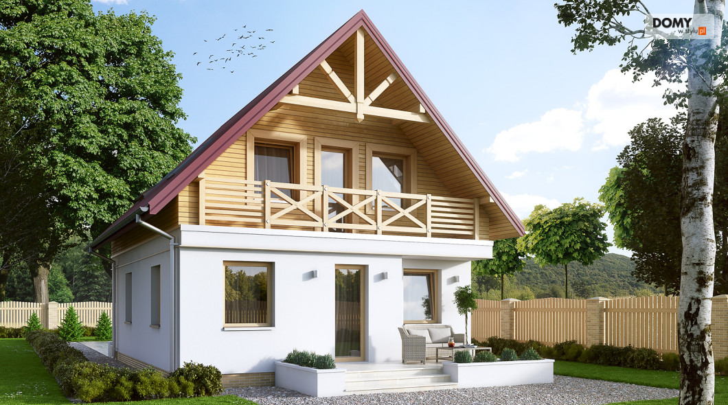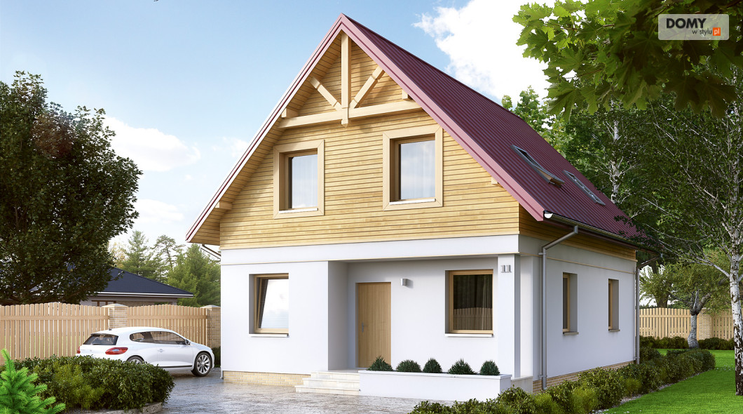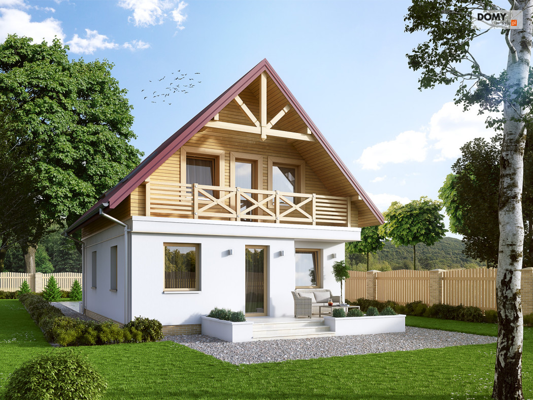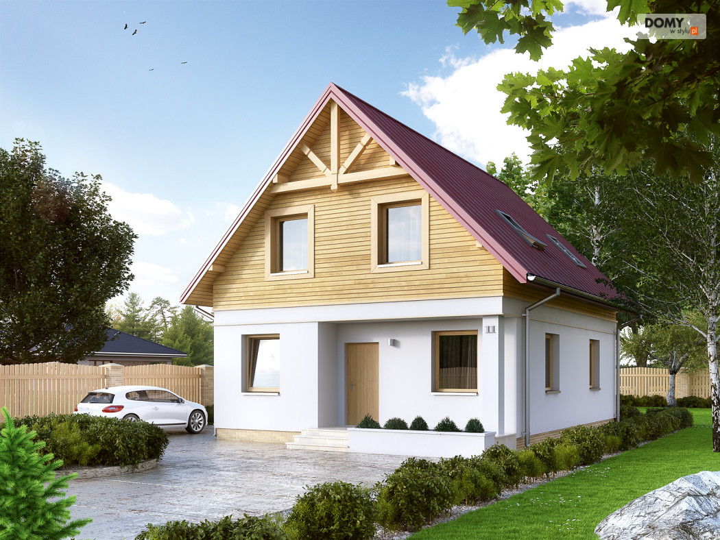 Mały dom jednorodzinny z poddaszem użytkowym dla 3 – 4-osobowej rodziny. Na parterze dodatkowy pokój z możliwością wykorzystania na gabinet. Na poddaszu trzy sypialnie, łazienka oraz mała garderoba.
