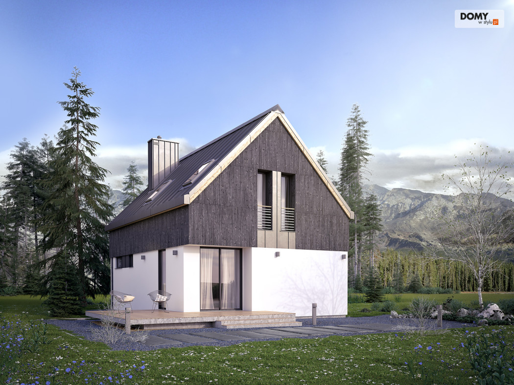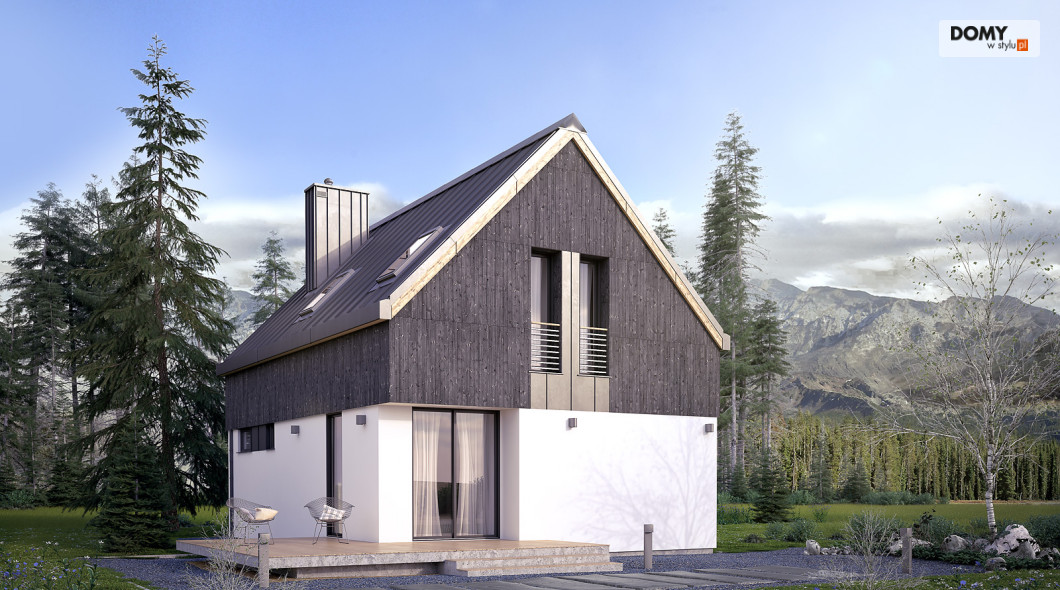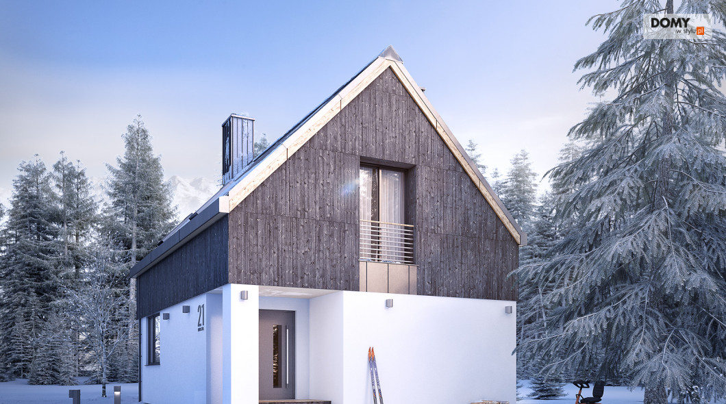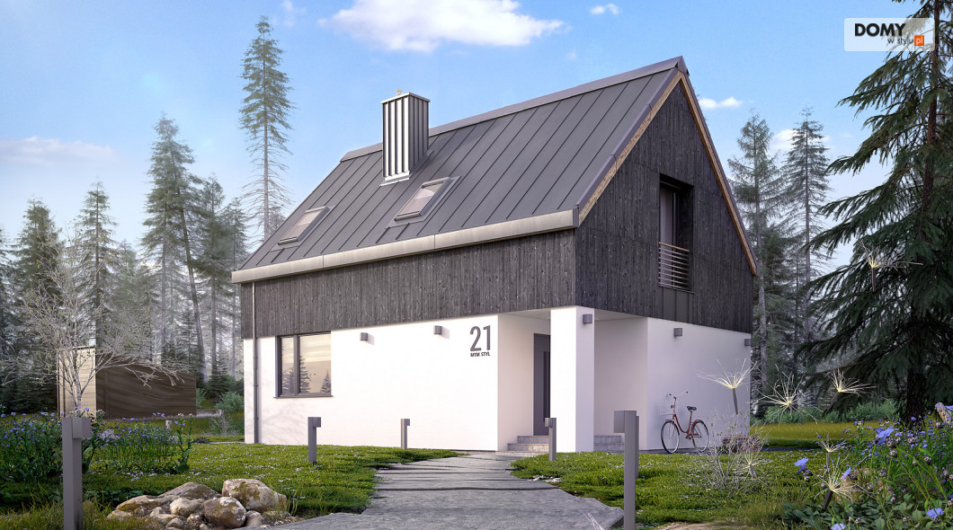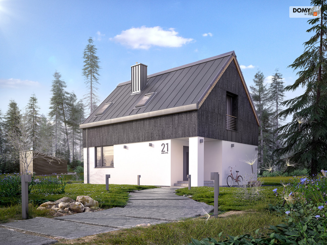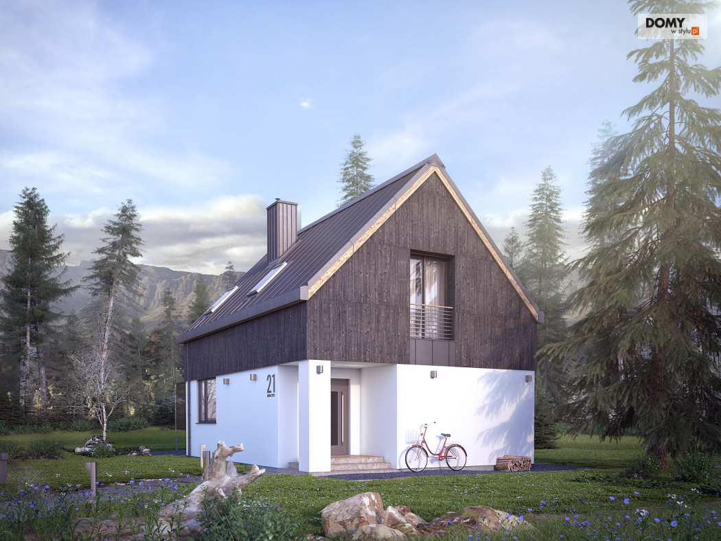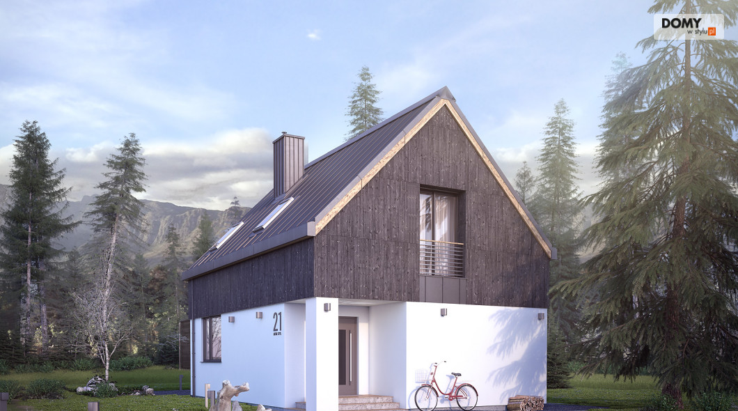 Przytulny dom dla 4-osobowej rodziny. Współczesna bryła budynku nawiązuje do budownictwa tradycyjnego. Wejście zostało podkreślone zapraszającym podcieniem. Na parterze znajduje się przestronna strefa dzienna z kominkiem, otwartą kuchnią i jadalnią. Strefa prywatna została zlokalizowana na poddaszu. Komfort użytkowania domu podnosi dodatkowa garderoba dostępna z głównej sypialni.