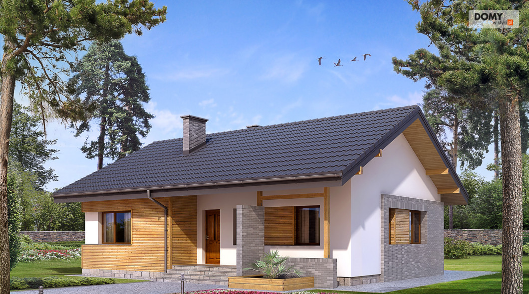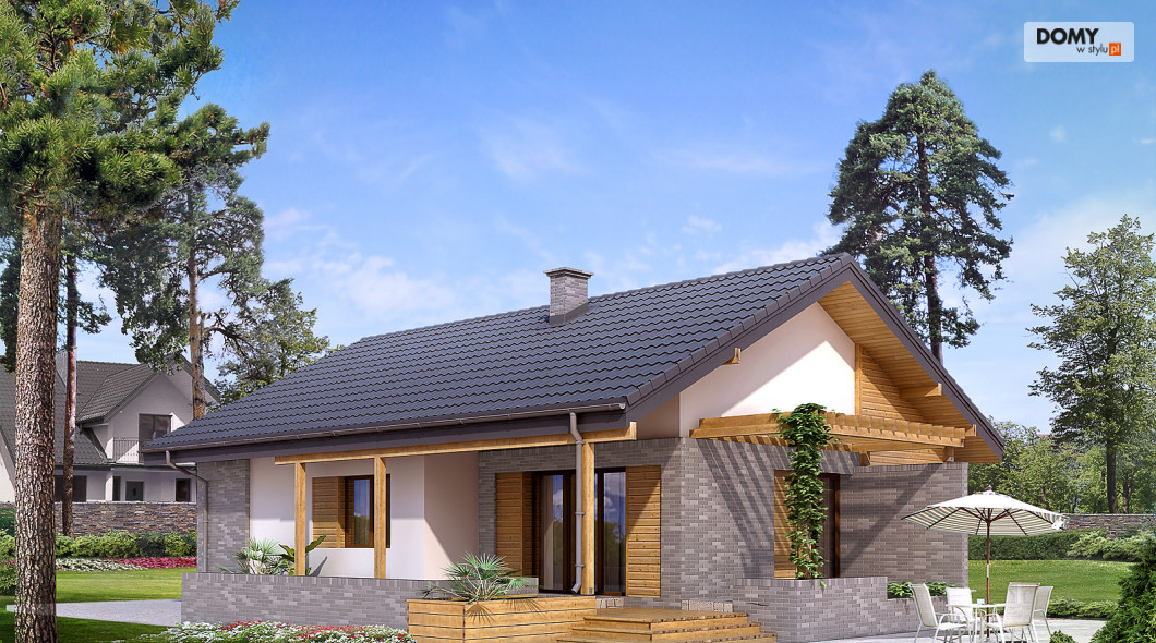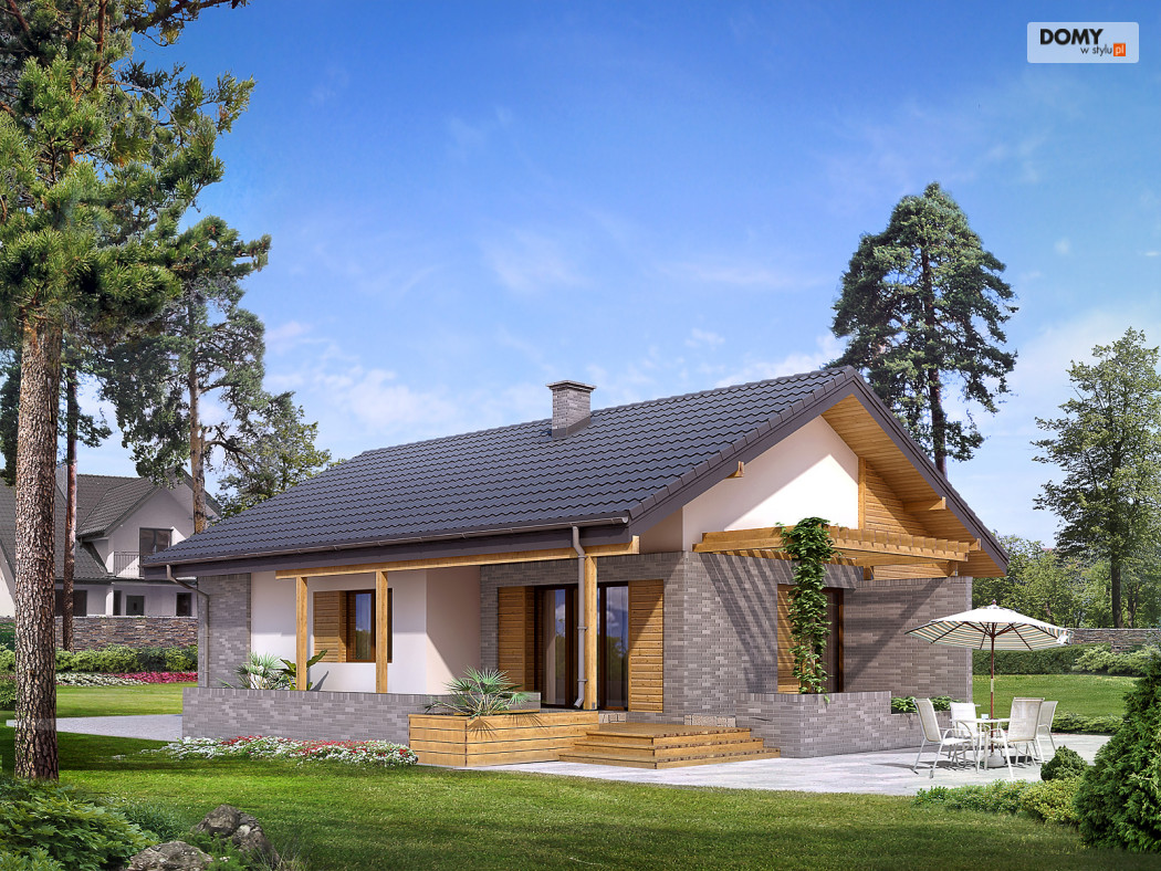 Parterowy dom jednorodzinny. Przy niewielkim metrażu zapewnia pełen komfort dla 4-osobowej rodziny. Przestronna część dzienna z szeregiem przeszkleń umożliwia kontakt z otaczającą zielenią. Funkcjonalny układ pomieszczeń z wyraźnym podziałem na część dzienną i nocną, przy zachowaniu minimum komunikacji. Wygodne, częściowo zadaszone tarasy.