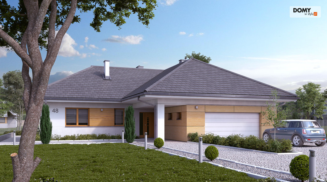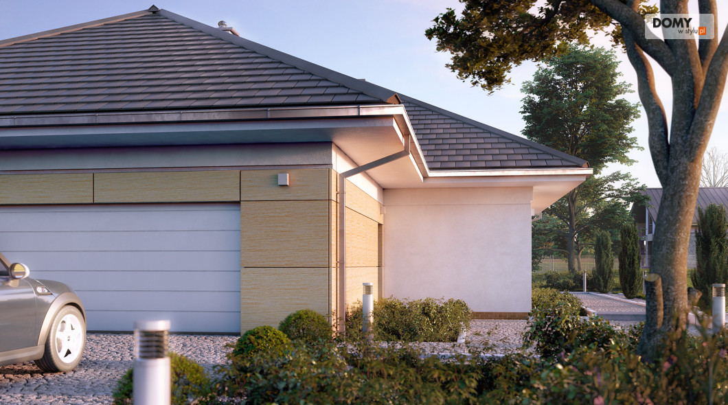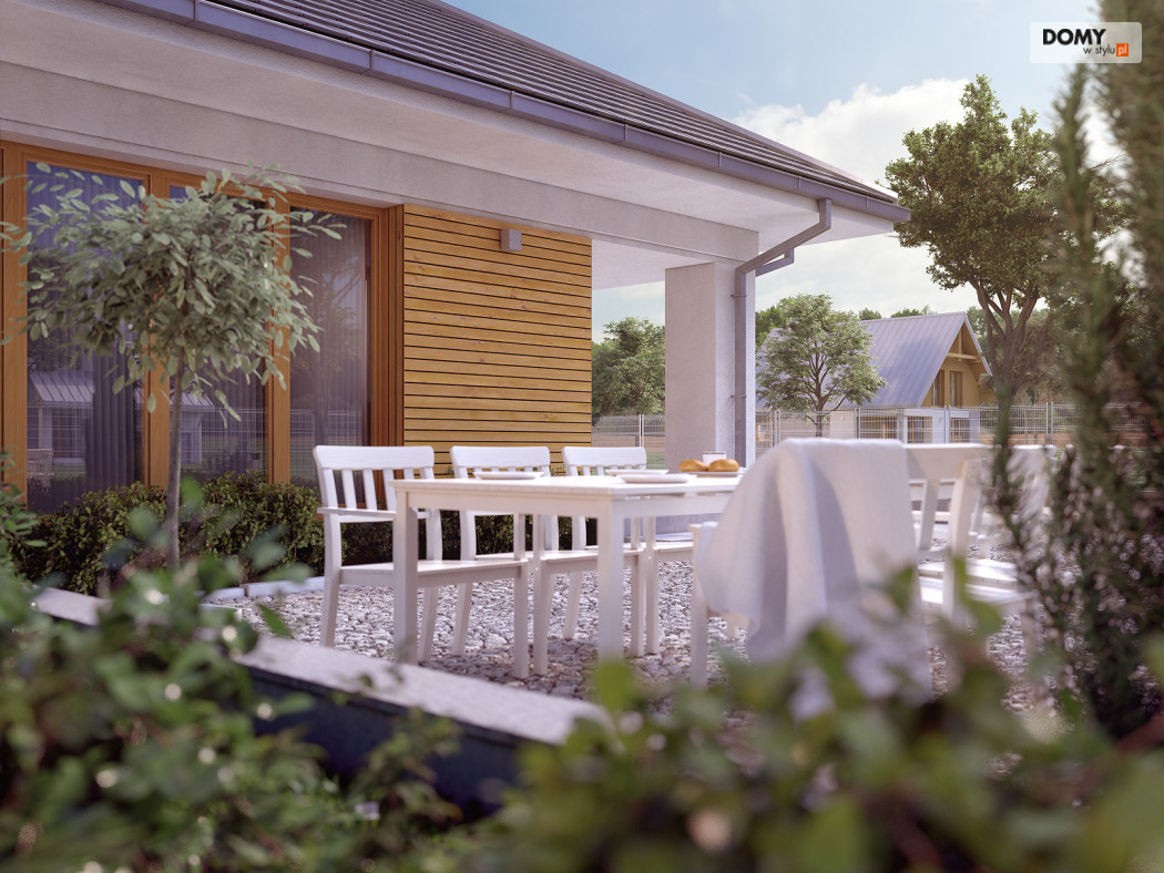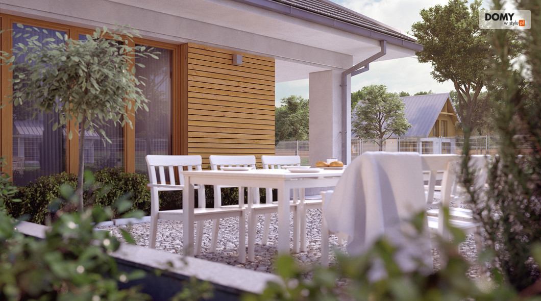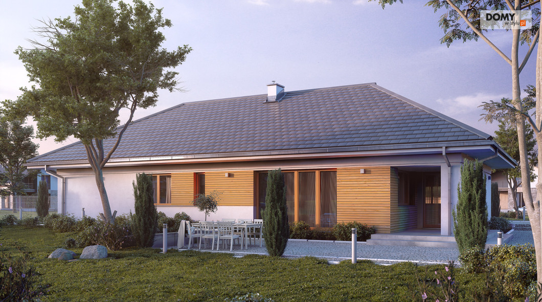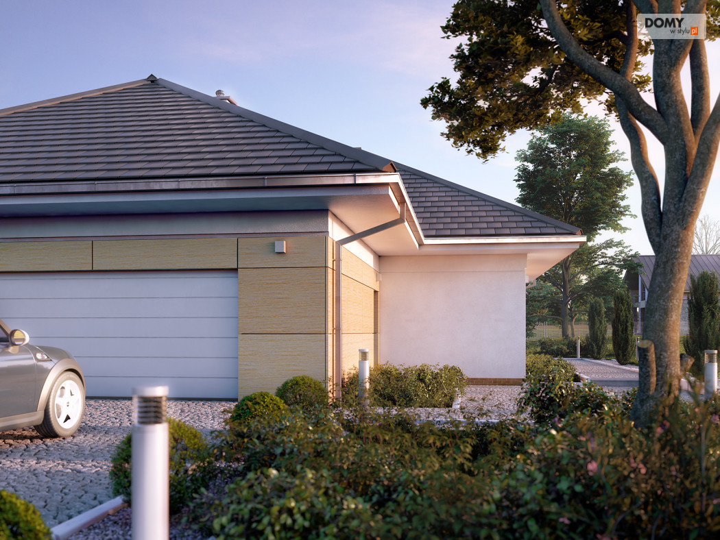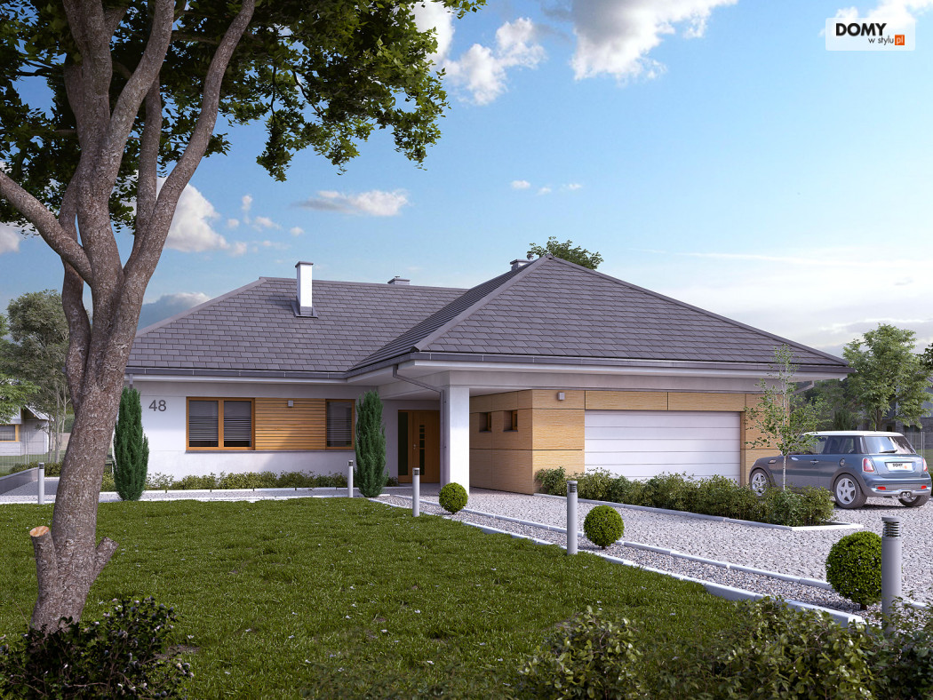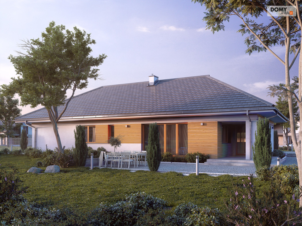 Orchidea to projekt domu parterowego z dwustanowiskowym garażem w bryle budynku. Program funkcjonalny budynku podzielono na trzy strefy. Część dzienną tworzy przestronny salon z jadalnią, którego cechą charakterystyczną są liczne przeszklenia oraz otwarta kuchnia z barkiem śniadaniowym i spiżarnią. Zarówno z jadalni jak i z kuchni prowadzi wyjście na zadaszony taras od strony ogrodu. Część nocną domu tworzą trzy sypialnie, garderoba, rodzinna łazienka oraz oddzielne WC. Główna sypialnia gospodarzy posiada prywatną garderobę oraz łazienkę. W projekcie wyodrębniono również strefę gospodarczą, składającą się z dwustanowiskowego garażu oraz kotłowni z wejściem przez wiatrołap.