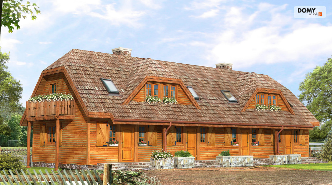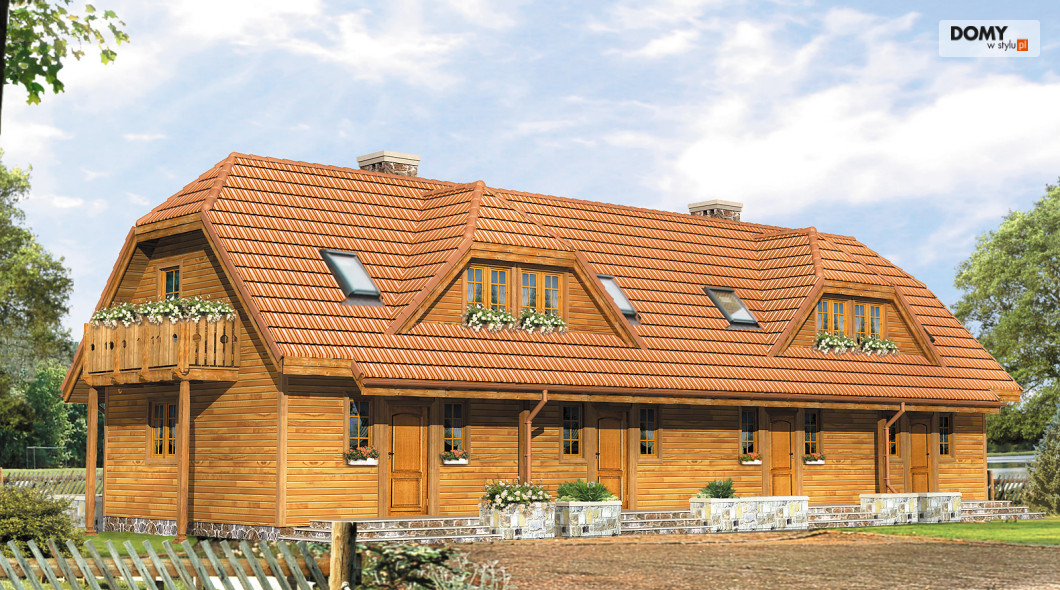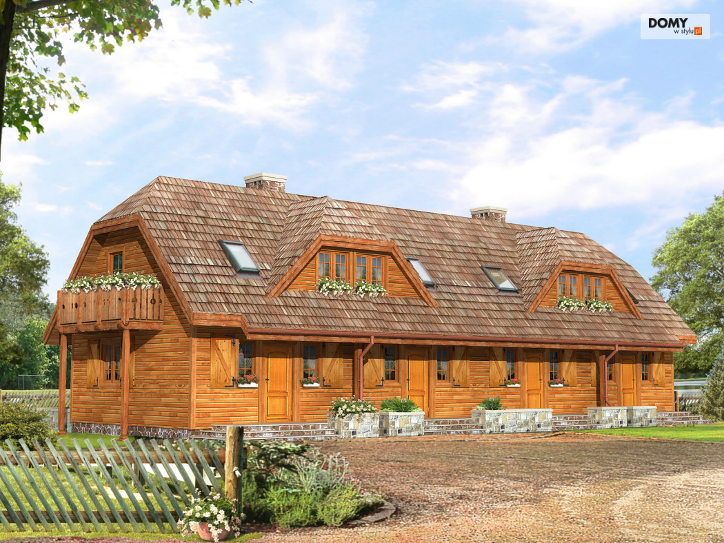 Budynek rekreacyjny złożony z czterech segmentów odpowiedni do budowy na działkach wypoczynkowych. Istnieje możliwość wynajęcia każdego z segmentów. Na parterze zaprojektowano pokój dzienny z kominkiem i aneksem kuchennym oraz łazienkę. Na poddaszu zaprojektowano dwie sypialnie.