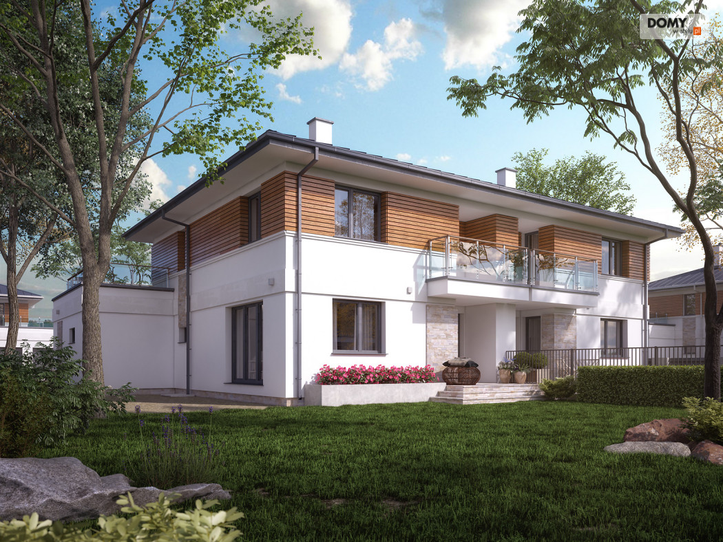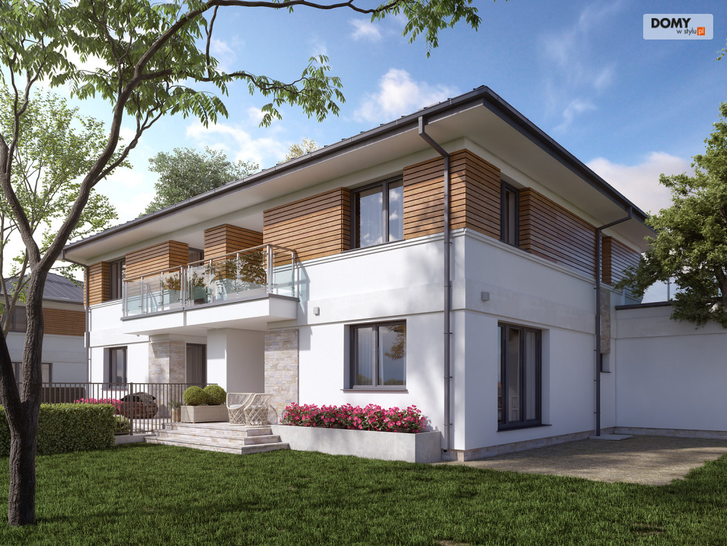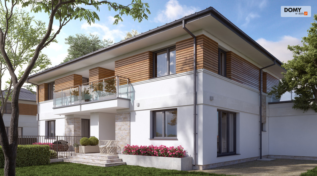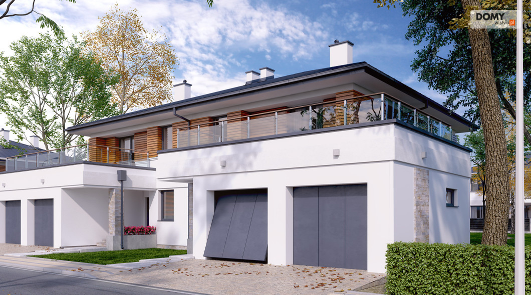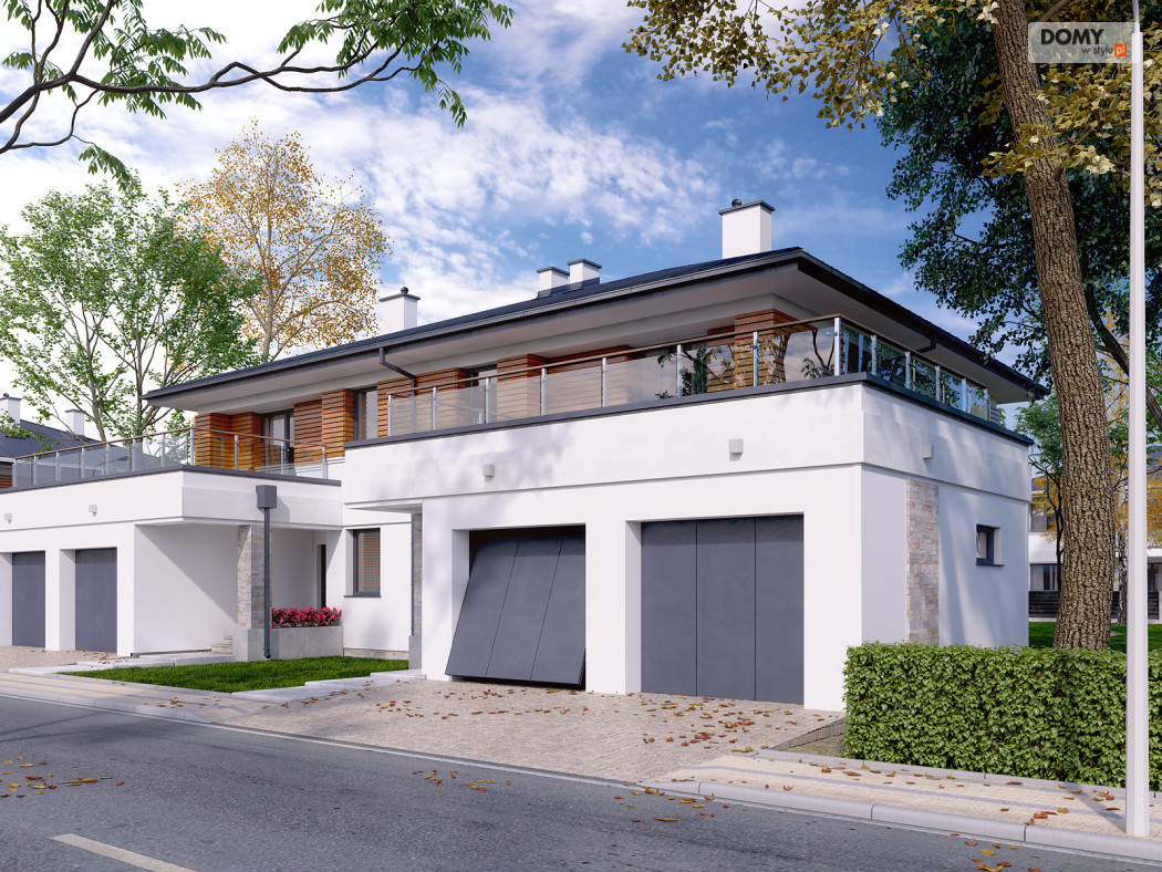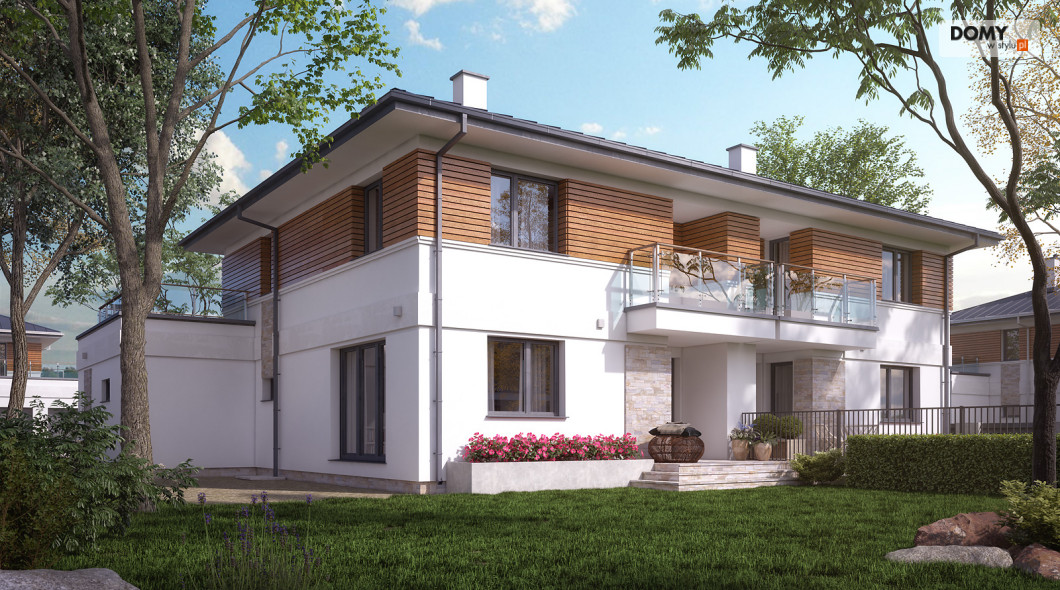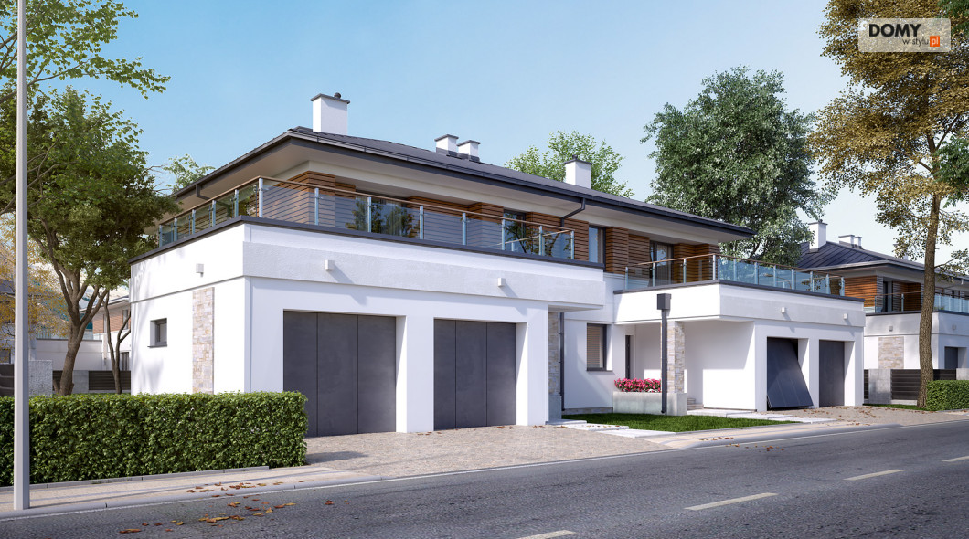 Waniliowy to projekt domu jednorodzinnego w zabudowie bliźniaczej, który wyróżnia się niebanalną stylistyką. Charakterystycznym elementem budynku są garaże, wysunięte od frontu, nad którymi zaprojektowano rozległe tarasy. Program funkcjonalny budynku został podzielony na strefę dzienną i nocną. Na parterze znajduje się strefa dzienna z salonem, jadalnią, kuchnia z praktyczna spiżarnią oraz WC. Piętro tworzy strefę nocną, na którą składają się trzy sypialnie oraz rodzinna łazienka. Główna sypialnia gospodarzy posiada prywatną garderobę oraz balkon od strony ogrodu.