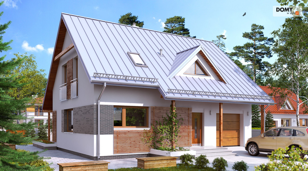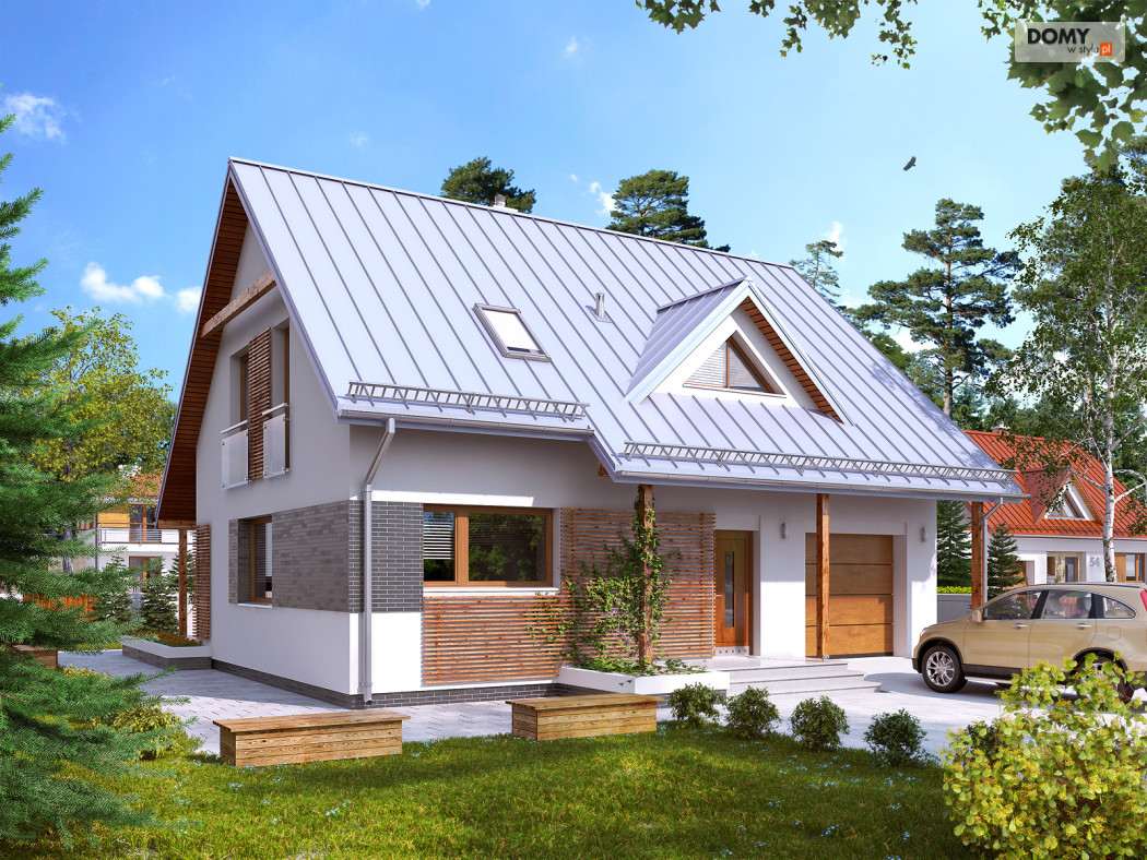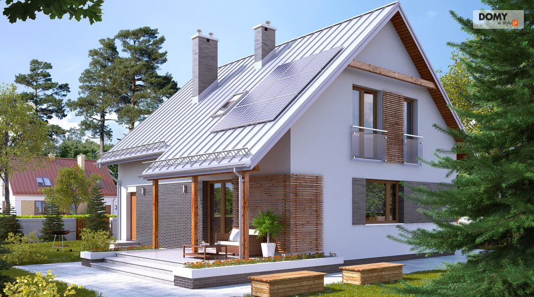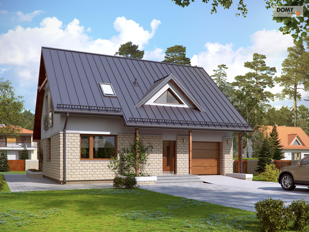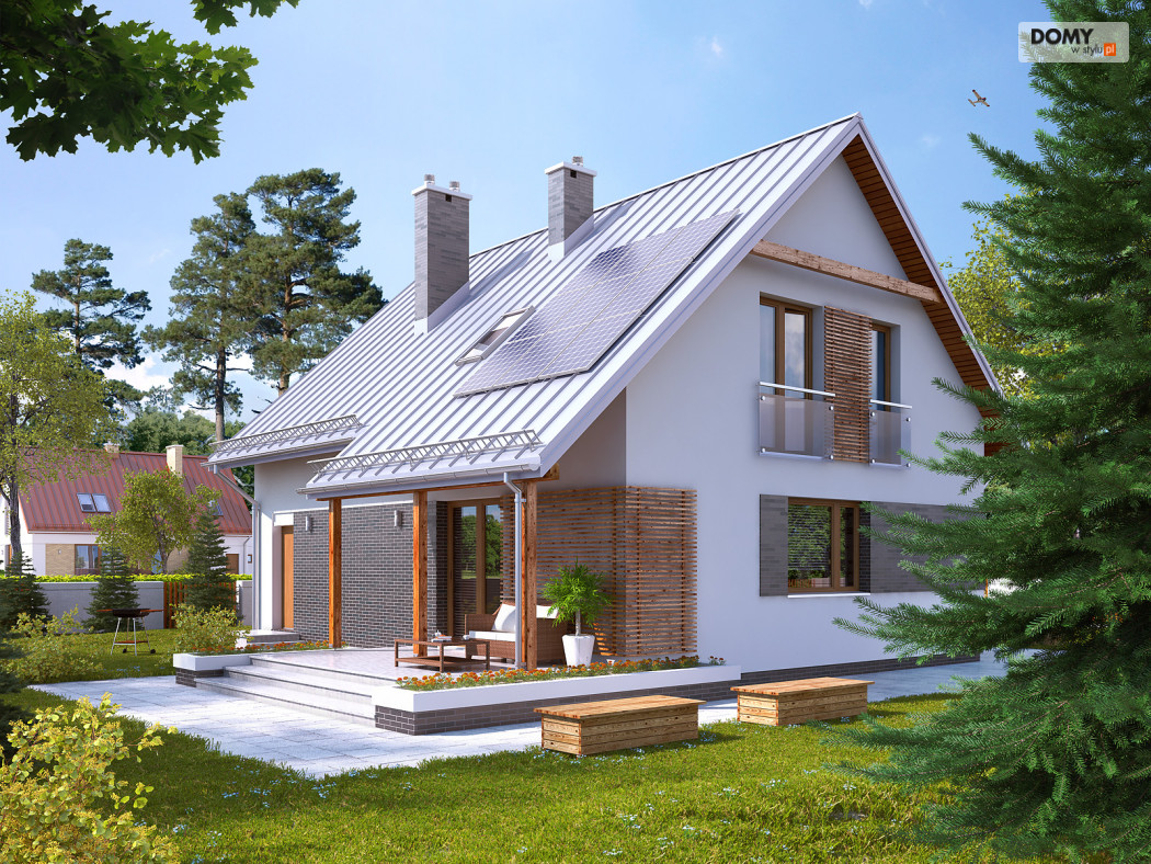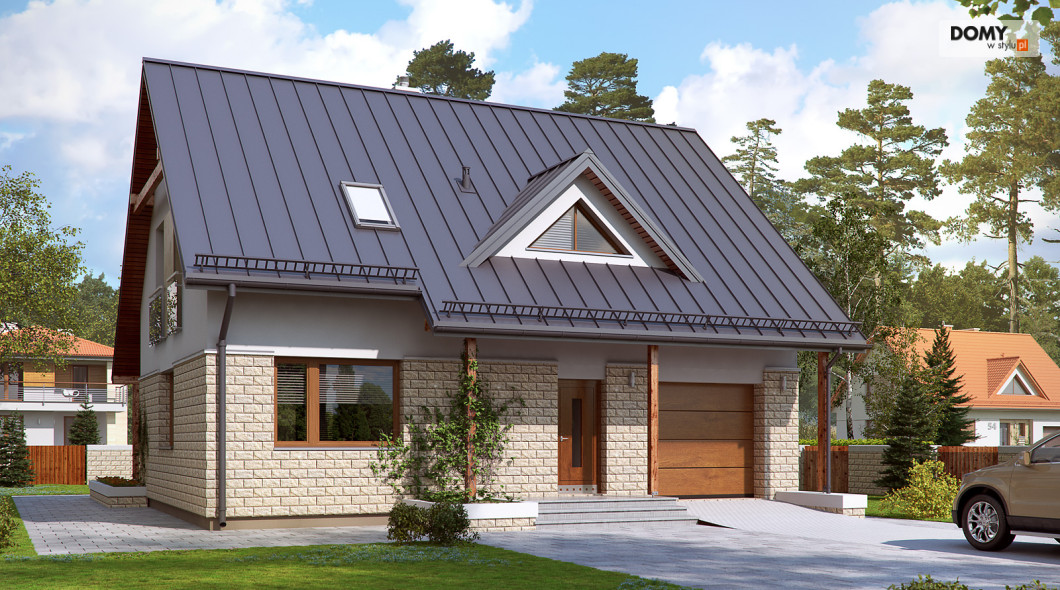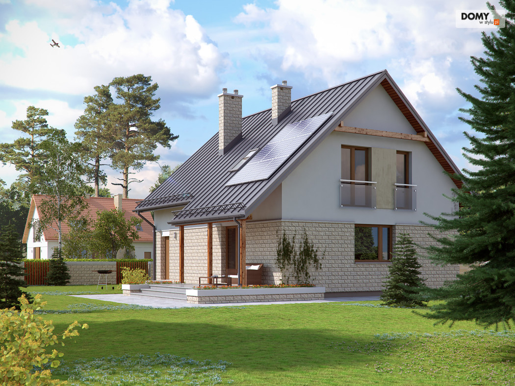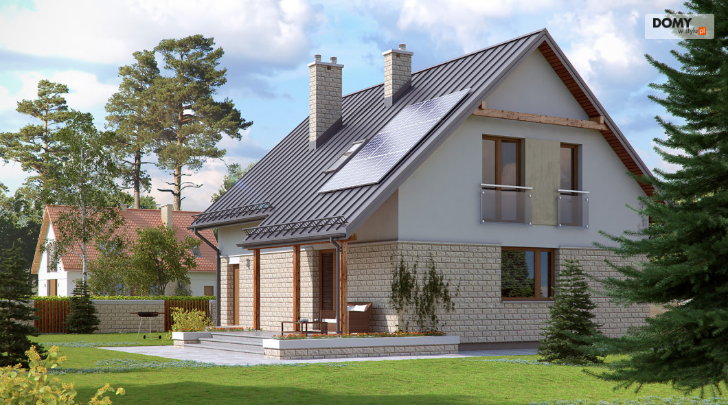 Dom jednorodzinny, wolno stojący, niepodpiwniczony z użytkowym poddaszem, przeznaczony dla 4 - 5-osobowej rodziny. Na parterze zaprojektowano przestronny pokój dzienny z jadalnią i kominkiem oraz kuchnię ze spiżarnią. Na poddaszu znajdują się cztery sypialnie. Największa wyposażona jest we własną garderobę. Sypialnie są wygodne i widne. Wszystkie doświetlone są oknami znajdującymi się w ścianach szczytowych budynku. Dom jest funkcjonalny, posiada prostą bryłę przykrytą dwuspadowym dachem, jedno miejsce garażowe i częściowo zadaszony taras.