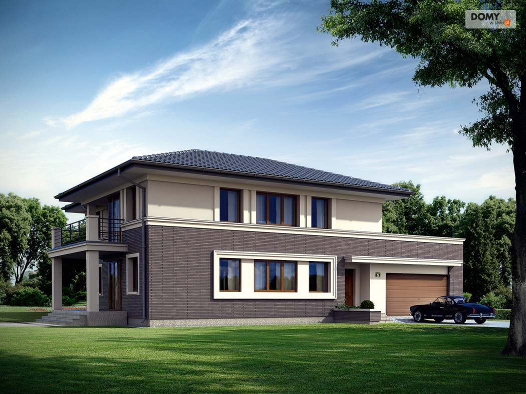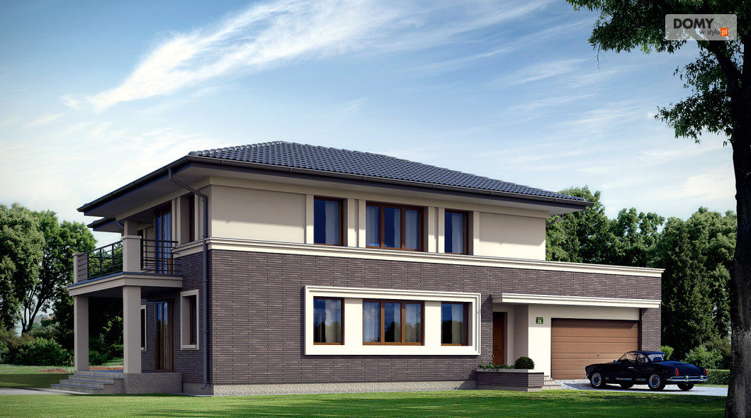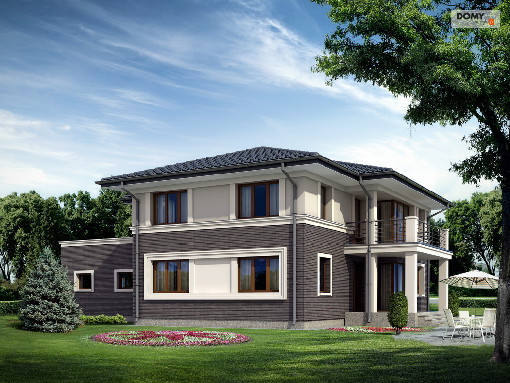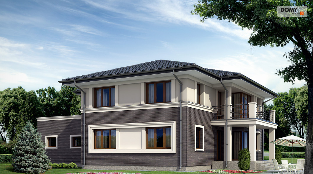 Dom dwurodzinny z niezależnymi mieszkaniami o jednakowym układzie, każde na innej kondygnacji. Mieszkanie na piętrze posiada duży taras nad garażem. Oba mieszkania mają wyjście z salonu na zadaszone tarasy.