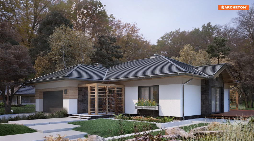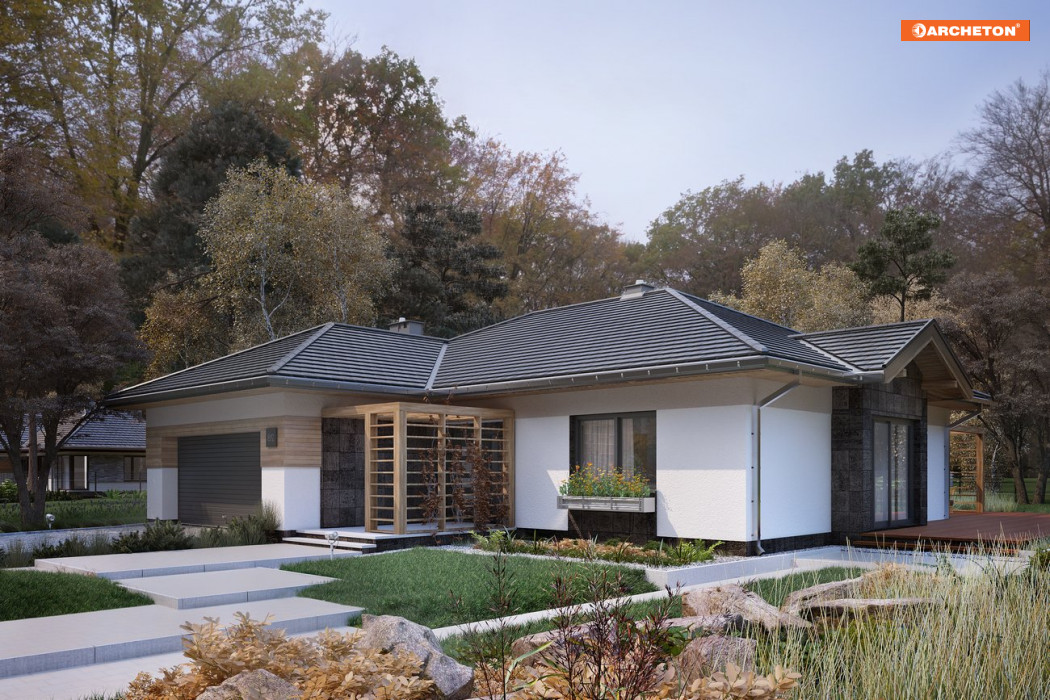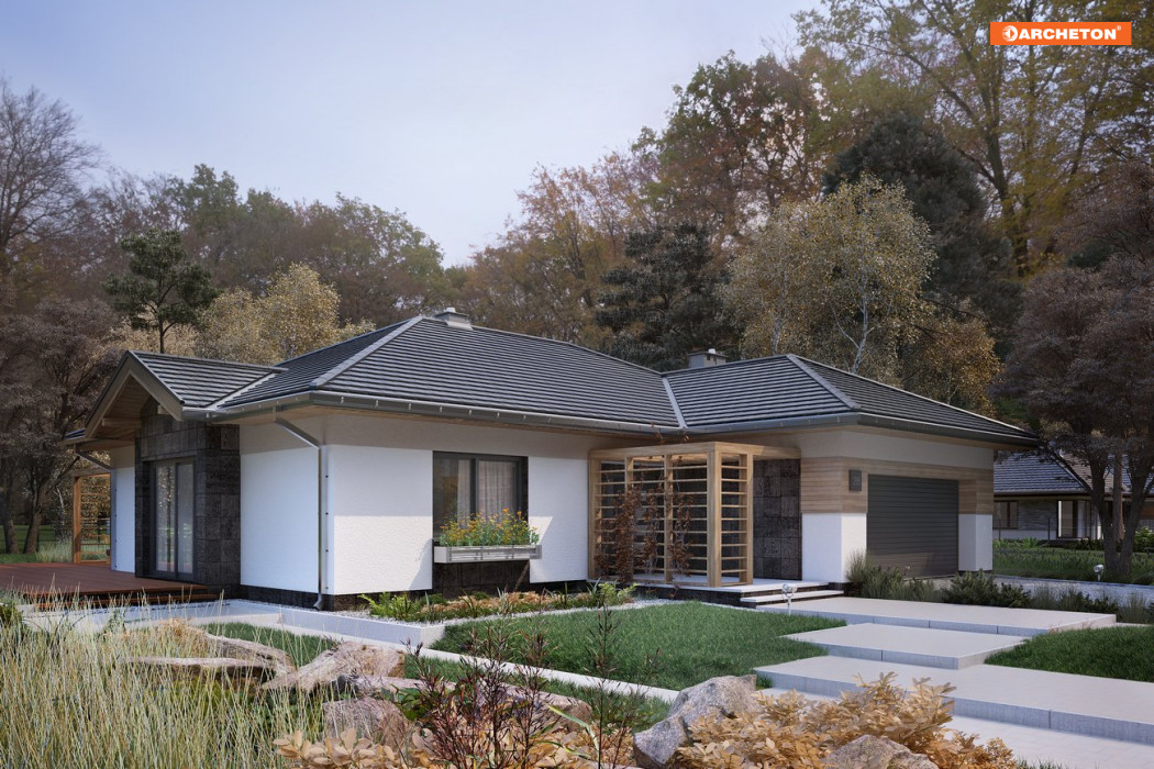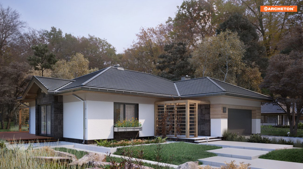 Rodzina Aurelii to rozłożyste, średniej wielkości parterowe domy. Projekt domu Aurelia Atu ma powierzchnię nieco większą od Aurelii i taki sam zasadniczy rozkład. Zaproponowano w nim jednak wyraźnie więcej miejsca na pokój dzienny oraz plan mieszkania wymagający nieco płytszej ale szerszej działki. Frontowe wejście, jak w pozostałych wersjach, osłania dwustanowiskowy garaż umieszczony w wysuniętym ku wjazdowi skrzydle, w którym znalazła się także pralnia i kotłownia. W centrum rozbudowanego rzutu otwarty hol oddziela część dzienną od przedpokoju strefy prywatnej, złożonej z czterech sypialni i łazienki. Salon tworzy z kuchnią jedno wnętrze z jadalnią, oświetloną dużym przeszkleniem z wyjściem na taras. Zaakcentowano je zwróconym ku ogrodowi ryzalitem i przełamaniem linii okapu wielospadowego dachu. Tylko projekt parterowego domu zaoferować może tak komfortowe rozwiązania, jakie pokazują wszystkie warianty Aurelii w układzie głównej sypialni otwierającej się na ustronną część wspólnego z salonem tarasu. Rezygnacja z grawitacji na rzecz wentylacji mechanicznej pozwoliła w projekcie domu Aurelia Atu na swobodniejsze rozmieszczenie łazienek.