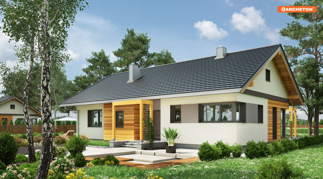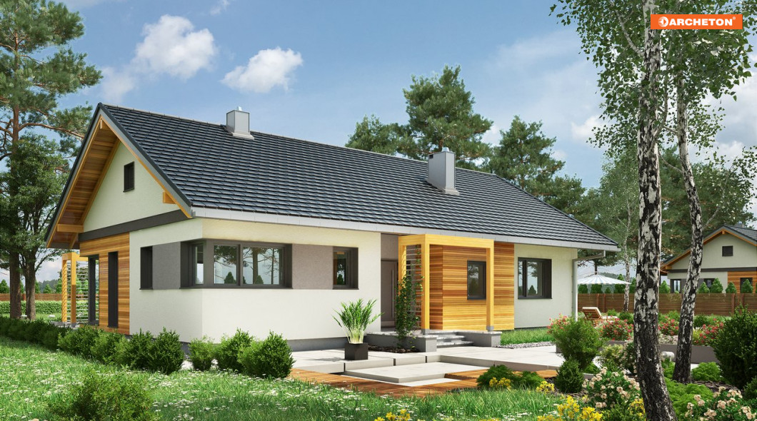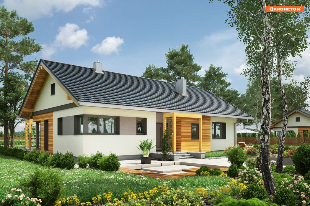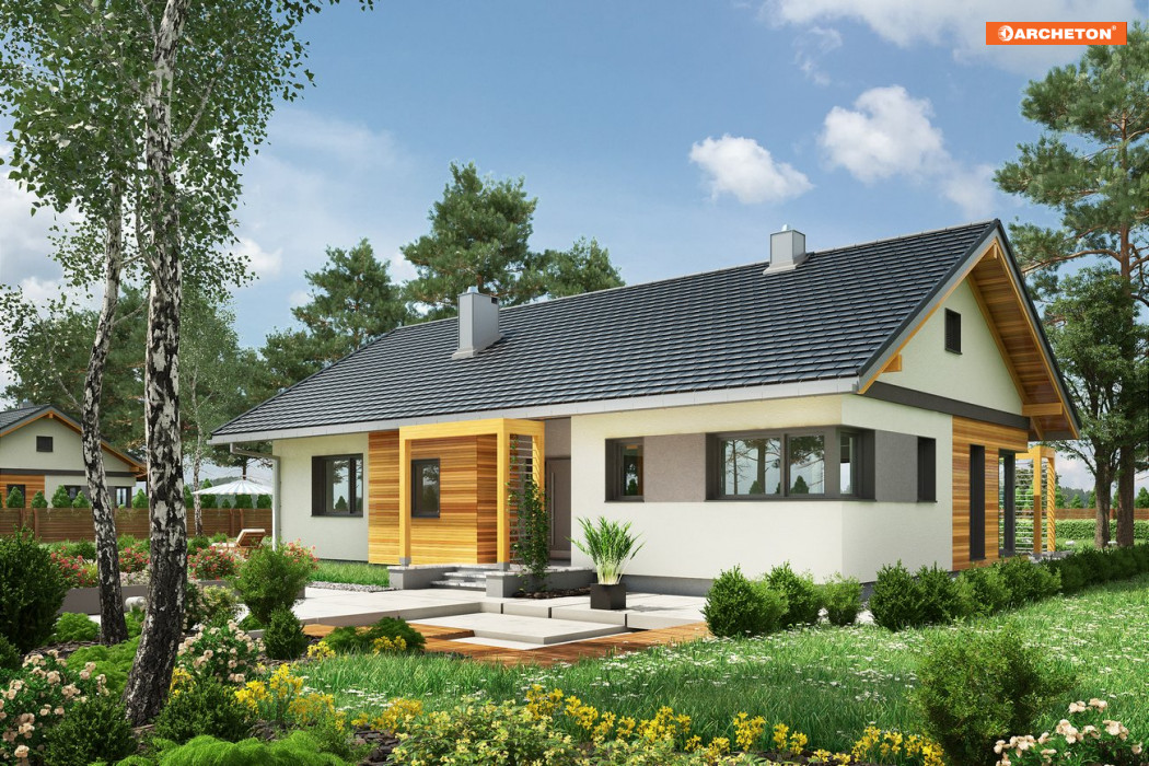 Dla osób, które planują budowę domu parterowego dla 4 osób, bez garażu, o powierzchni ok 115m2 i tradycyjnej sylwetce, odpowiedni może się okazać projekt domu Zyta. Jest nieco większy od podobnego w prostocie Milana Rex ale proponuje mniej rygorystyczny zarys prostokątnego planu. Zyta stanowi kompromis między zasadami energooszczędnego konstruowania bryły domu i upodobaniem do bogatszej formy architektonicznej. Znalazło to odzwierciedlenie w swobodniejszym układzie ścian nośnych i pozwoliło bardziej wyraźnie, niż w Milanie, oddzielić część dzienną od nocnej. Może to zainteresować inwestorów wahających się w wyborze między domem parterowym a takim z użytkowym poddaszem, właśnie ze względu na strefowanie różnych funkcji mieszkania. W Zycie dużą kuchnię ze spiżarnią, otwarty salon i wygodny hol z garderobą oddzielić można w przedpokoju drzwiami od strefy nocnej z trzema sypialniami i dwoma łazienkami. Jednolita rozpiętość dwuspadowego dachu i zmienny przebieg ścian zewnętrznych tworzą w projekcie domu Zyta okap o różnej głębokości. Dlatego dom, mimo zdyscyplinowanego kształtu sylwetki, zwraca uwagę malarskim charakterem elewacji.