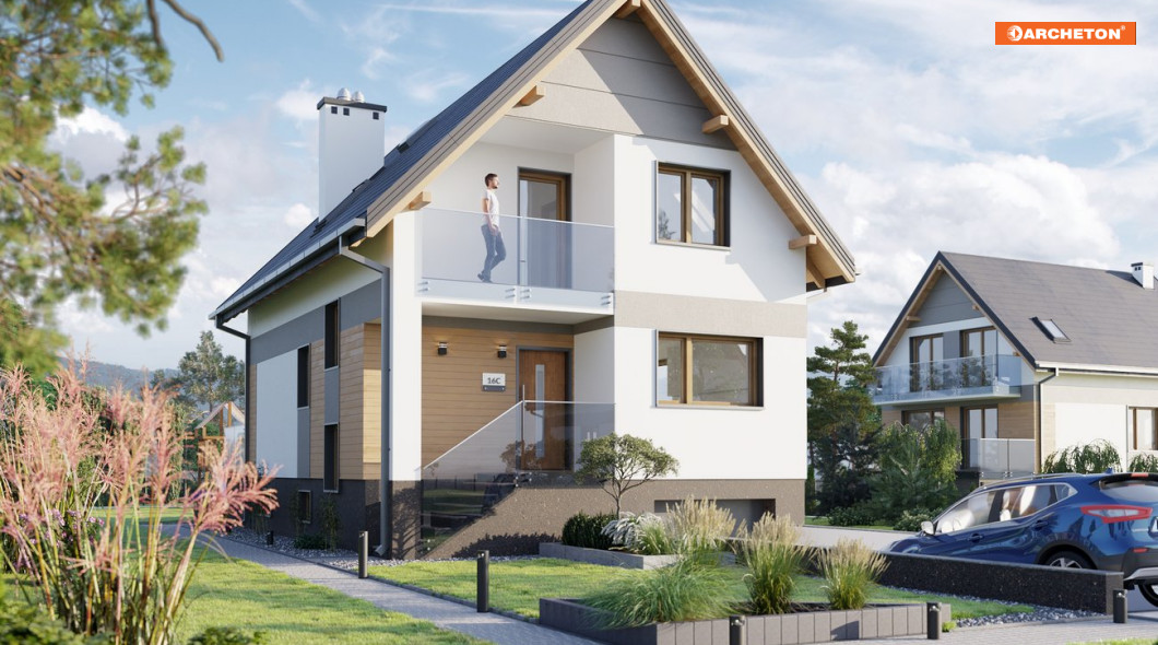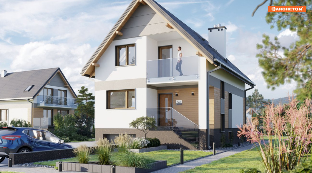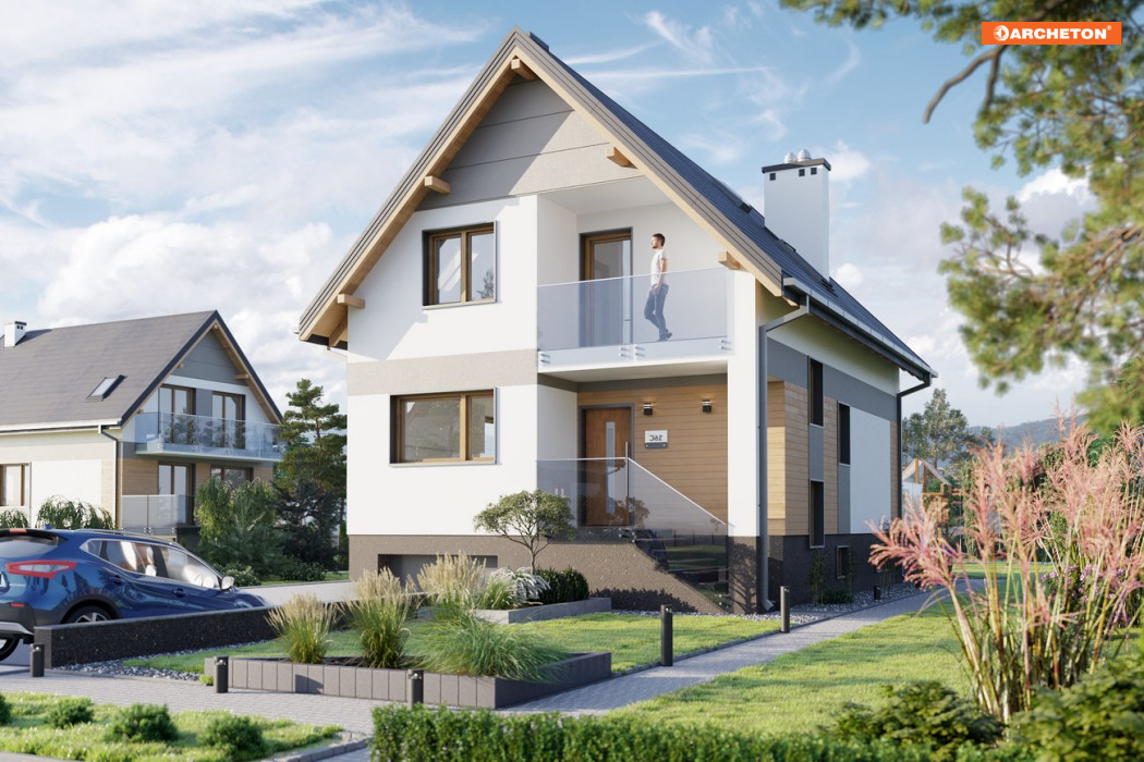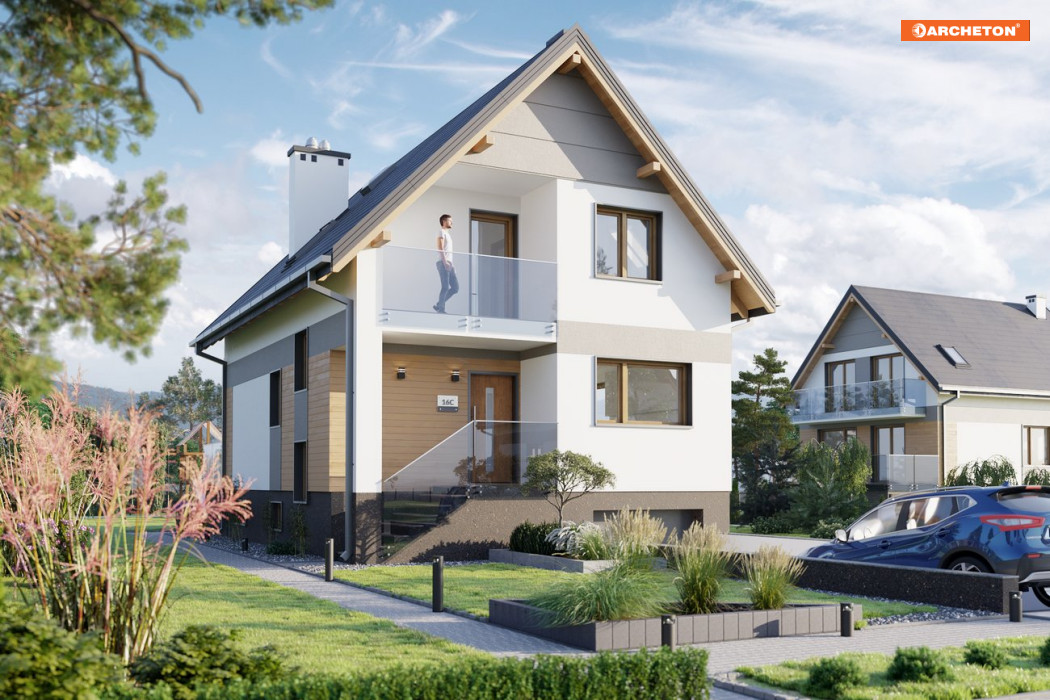 Zwarta, spójna bryła i optymalnie zagospodarowany każdy fragment przestrzeni sprawiają, że dom z garażem w piwnicy Koral to idealne lokum dla czteroosobowej rodziny. Na wysokim parterze znajduje się część dzienna – salon, kuchnia z jadalnią, łazienka, sień i klatka schodowa, a na użytkowym poddaszu usytuowane są sypialnie domowników, przedpokój, łazienka i klatka schodowa. Front budynku skierowany jest szczytem dwupołaciowego dachu w stronę wjazdu na posesję – z tej strony, w zagłębieniu pod okapem znajduje się też wejście oraz niewielki balkon. Z drugiej strony domu znajduje się jeszcze jeden, znacznie większy balkon, który częściowo zadasza i osłania obszerny taras, prowadzący prosto do ogrodu.