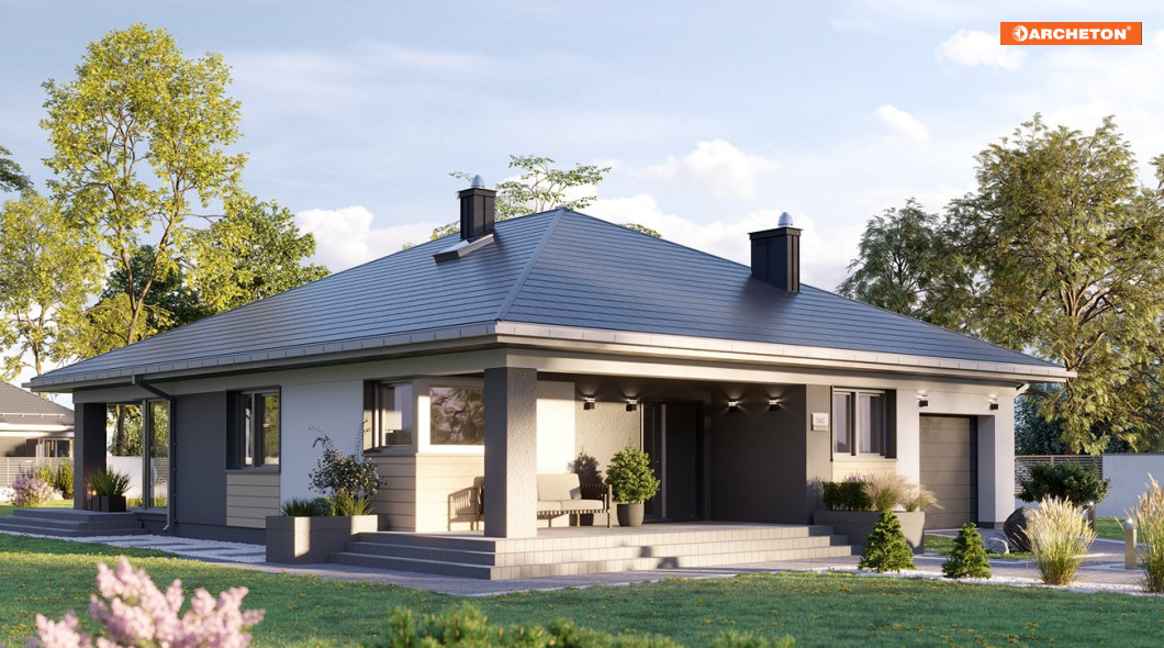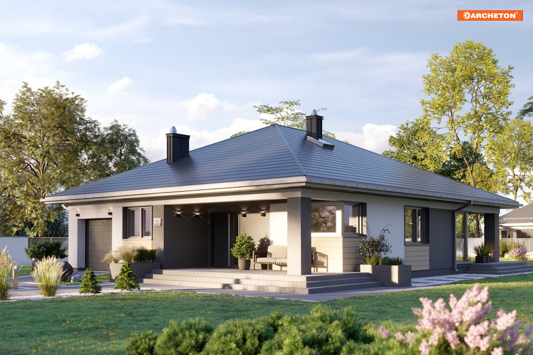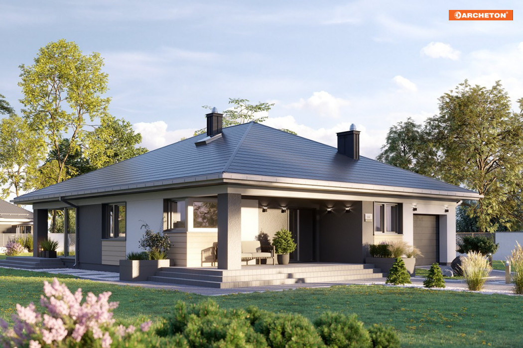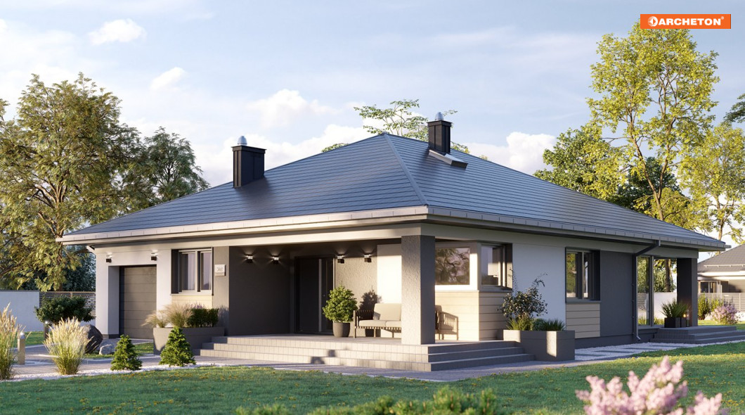 Projekt podcieniowego domu parterowego z dachem kopertowym dla 5-osobowej rodziny Blanka Prima urzeka prostotą i elegancją. Dzięki temu, że żaden element – taras, garaż czy wykusz – nie wystaje poza obrys bryły, udało się uzyskać niezwykle harmonijny efekt.
