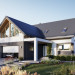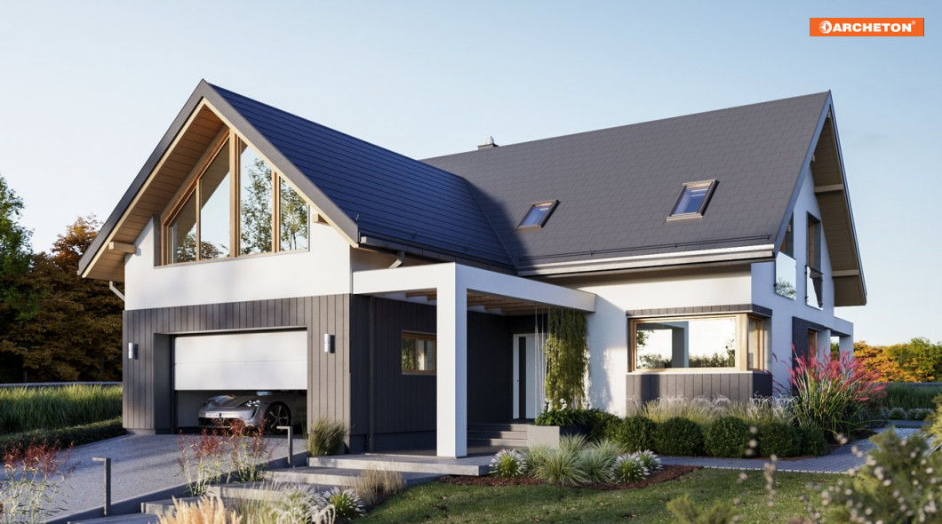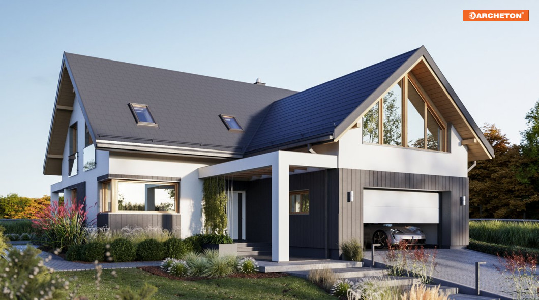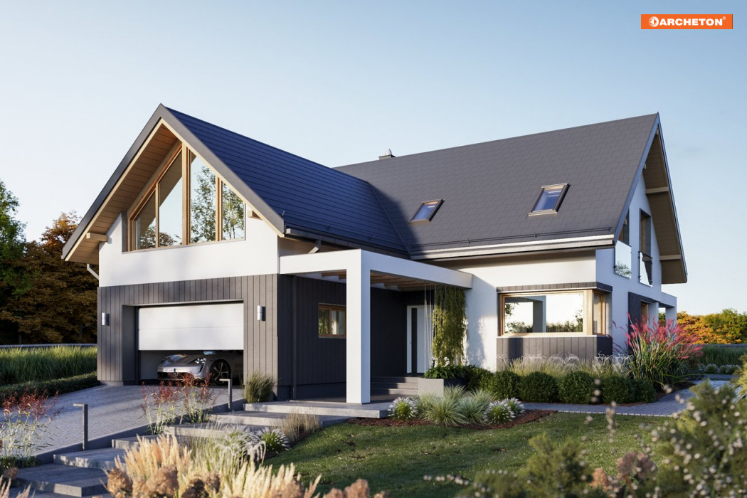 Zenon Astro to dom z dachem dwuspadowym z poddaszem użytkowym, który będzie idealny dla pięcioosobowej rodziny. Uwagę przykuwa zarówno bryła w kształcie litery L, jak i oryginalna fasada. Jej dolną część wykończono deską elewacyjną w odcieniu ciemnej szarości, która dodatkowo dynamizuje budynek.