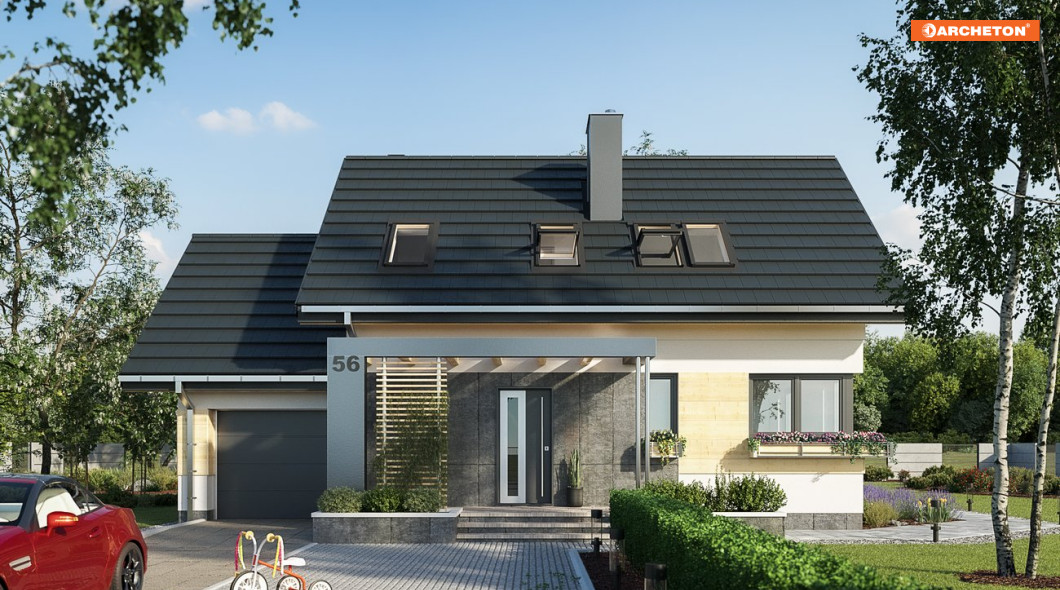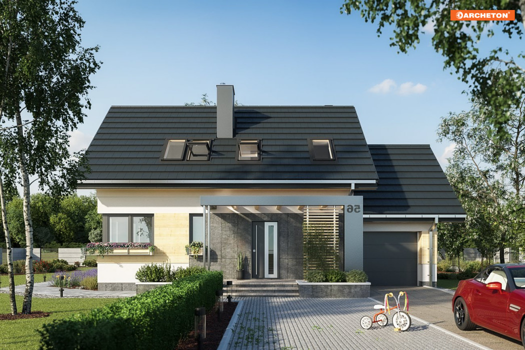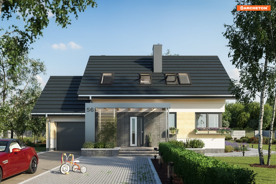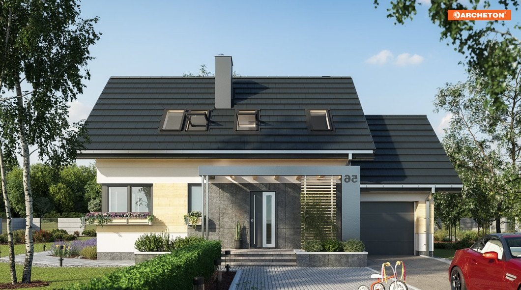 Najnowsza wersja Dino - projekt domu Dino Sol wpisuje się w koncepcję domów parterowych z użytkowym poddaszem, które mogą być realizowane dwuetapowo. Pierwsze mieszkanie rozwiązane na planie prostokąta ma otwarty pokój dzienny z kominkiem, gabinet i łazienkę. Na poddaszu przewidziano miejsce na główną sypialnie oraz dwa dodatkowe pokoje. Aby zyskać jeszcze większą ilością światła dziennego, zastosowano nowy zestaw montażowy VELUX DUO - daje możliwość zainstalowania obok siebie dwóch okien dachowych bez krokwi. Taki system montażu zapewnia więcej światła dziennego, poczucie większej przestrzeni i ciekawą aranżację wnętrza. Piękny efekt końcowy, bez krokwi między oknami, sprawia wrażenie, że dwa okna tworzą jedną całość, dając poczucie nieograniczonej przestrzeni.