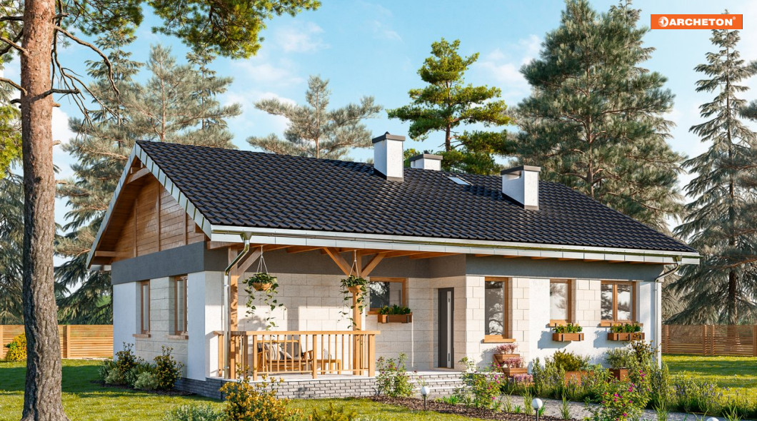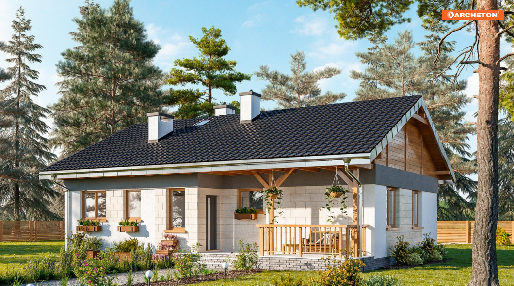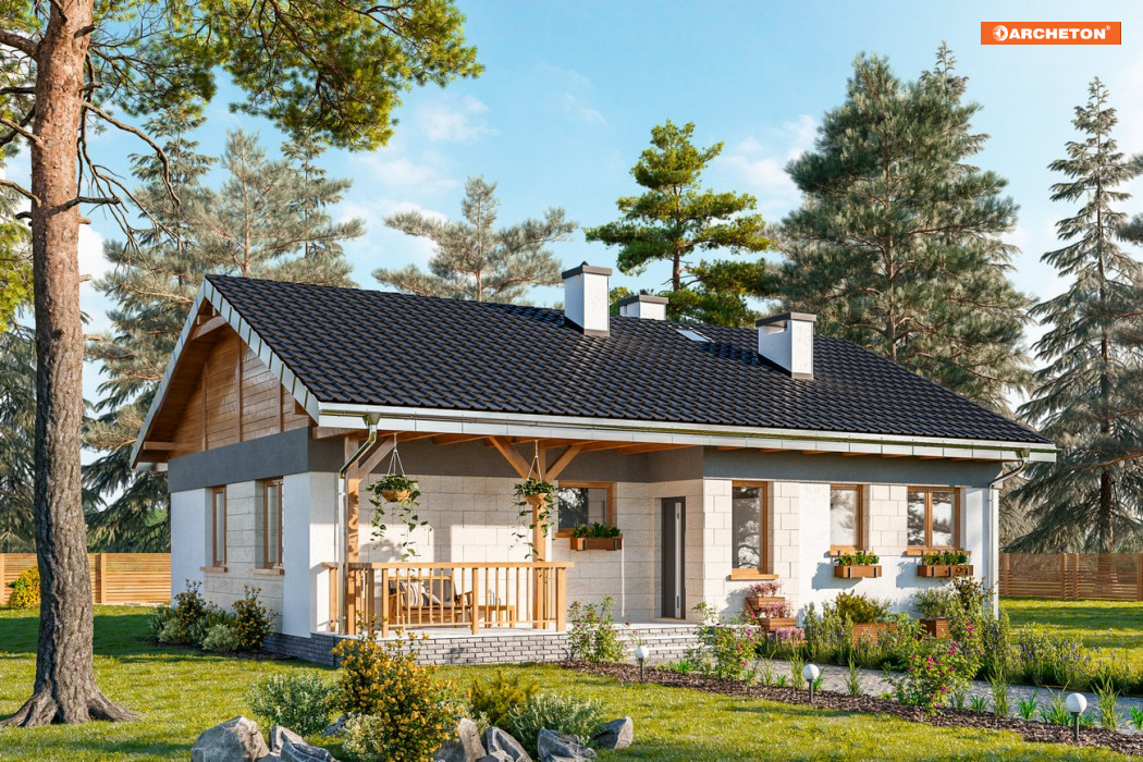 Projekt domu Kruszyna jest jedną z kilku propozycji Archetonu o powierzchni użytkowej ok. 95m2, bez garażu. Parterowy dom na planie zgrabnego prostokąta, z dwuspadowym, niezbyt stromym dachem i kalenicą równoległą do drogi dojazdowej przypomina rozwiązania z Rodziny Modrzyka. Tak jak one ma podłużną, narożna wejściową werandę, która jednak znajduje się w części nocnej planu mieszkania, a nie przy ścianie kuchni, jak w Modrzyku. Stąd inne jest usytuowanie głównego wejścia, które otwiera się w krótszym boku wnęki podcienia, prostopadłym do elewacji frontowej. Obszerna, jasna sień prowadzi dalej do holu rozdzielającego mieszkanie na część rodzinną i prywatną, złożoną z trzech wygodnych sypialni. Każda ze stref wyposażona jest w łazienkę, a większa z nich przewiduje miejsce na kocioł gazowy. Otwarta kuchnia dysponuje spiżarnią i, poprzez jadalnię przy kominku, łączy się z salonem skierowanym na ogród. Projekt domu Kruszyna odznacza się prostą, zwartą bryłą o tradycyjnych proporcjach i detalach architektonicznych.