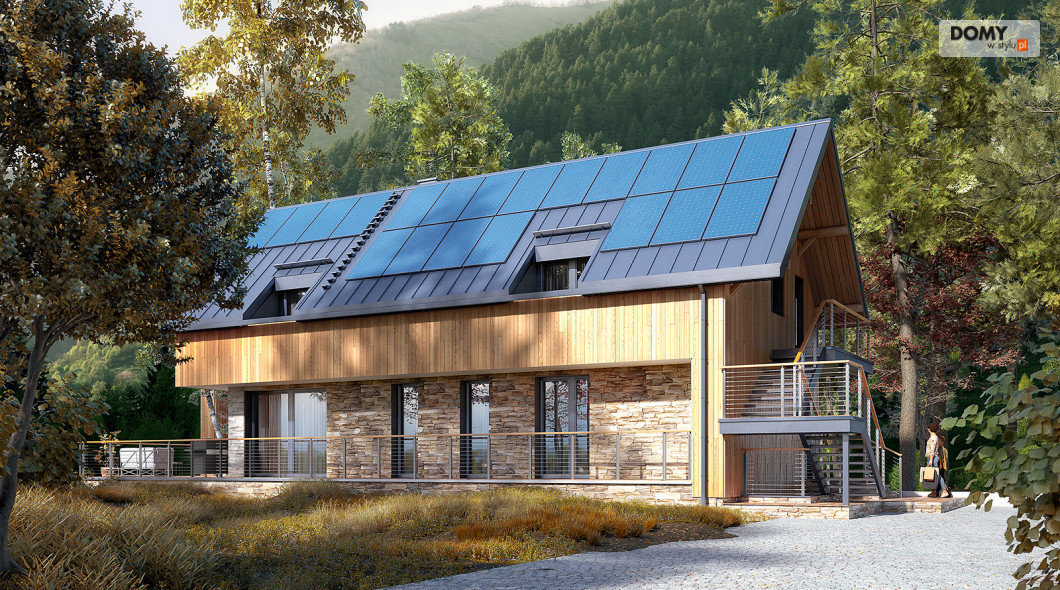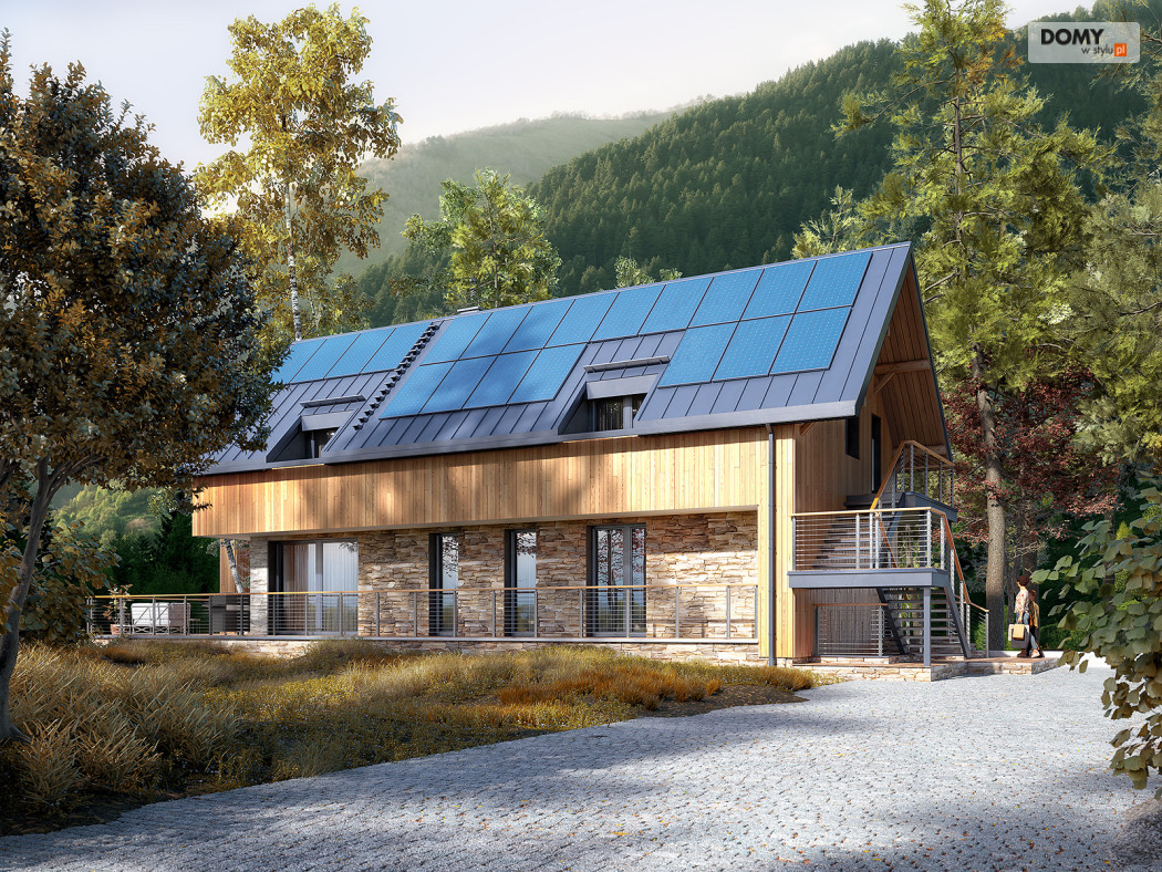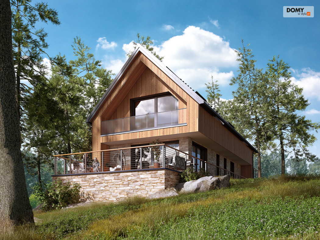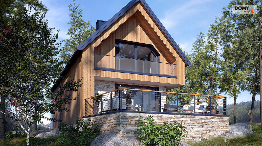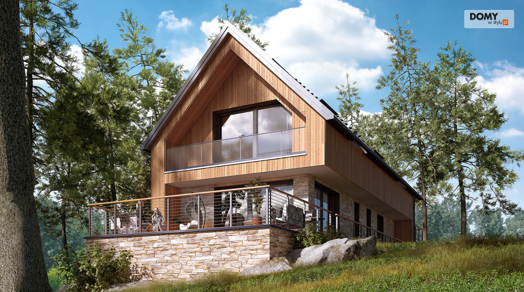 AGREST to projekt domu z użytkowym poddaszem, w którym pojawiły się mieszkania pod wynajem. Nowoczesna bryła budynku została zaprojektowana na rzucie prostokąta i przykryta dwuspadowym dachem. Na elewacji pojawiła się drewniana szalówka oraz płyty elewacyjne imitujące kamień. Parter stanowi mieszkanie właścicieli domu. Gospodarze do dyspozycji mają dwie wygodne sypialnie, zamknięta kuchnie oraz część dzienną z salonem i jadalnią. Niewątpliwa zaletą części dziennej domu są panoramiczne przeszklenia oraz kominek. Poddasze zostało zaprojektowanie pod wynajem. Lokatorzy mają osobne wejście, do którego prowadzą zewnętrzne schody. W tej części domu pojawiły się dwie sypialnie, każda z prywatną łazienka oraz wspólna kuchnia. Dużą zaletą domu jest część rekreacyjna ulokowana w piwnicy. Zaprojektowano tu saunę, przy której pojawiła się łazienka, siłownię oraz bilard. Układ funkcjonalny piwnicy dopełnia kotłownia, w której pojawiła się pompa ciepła.