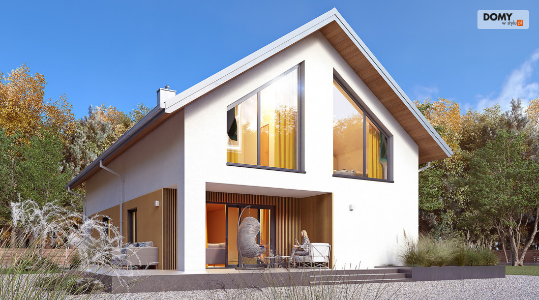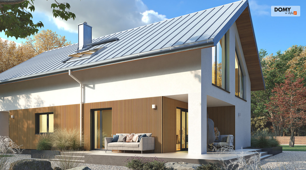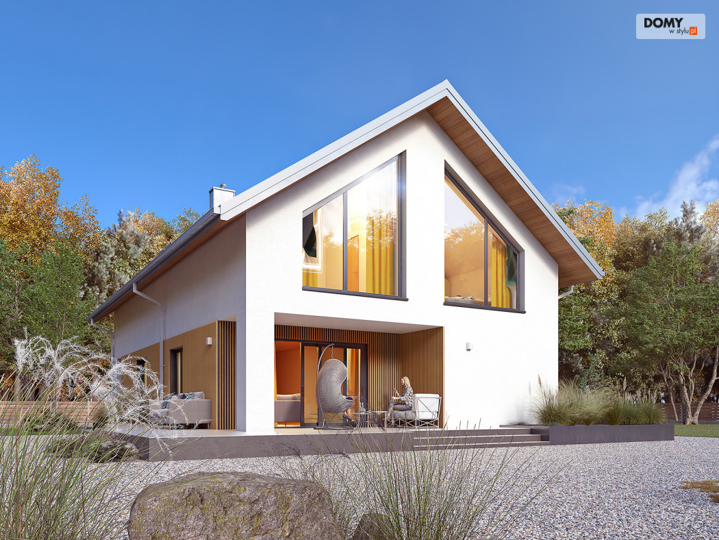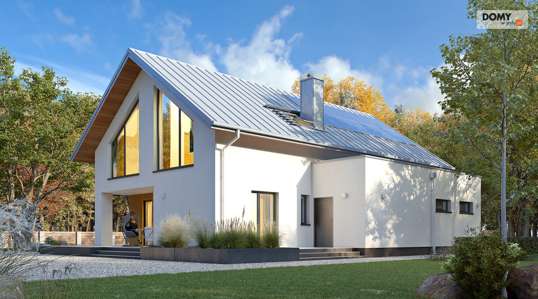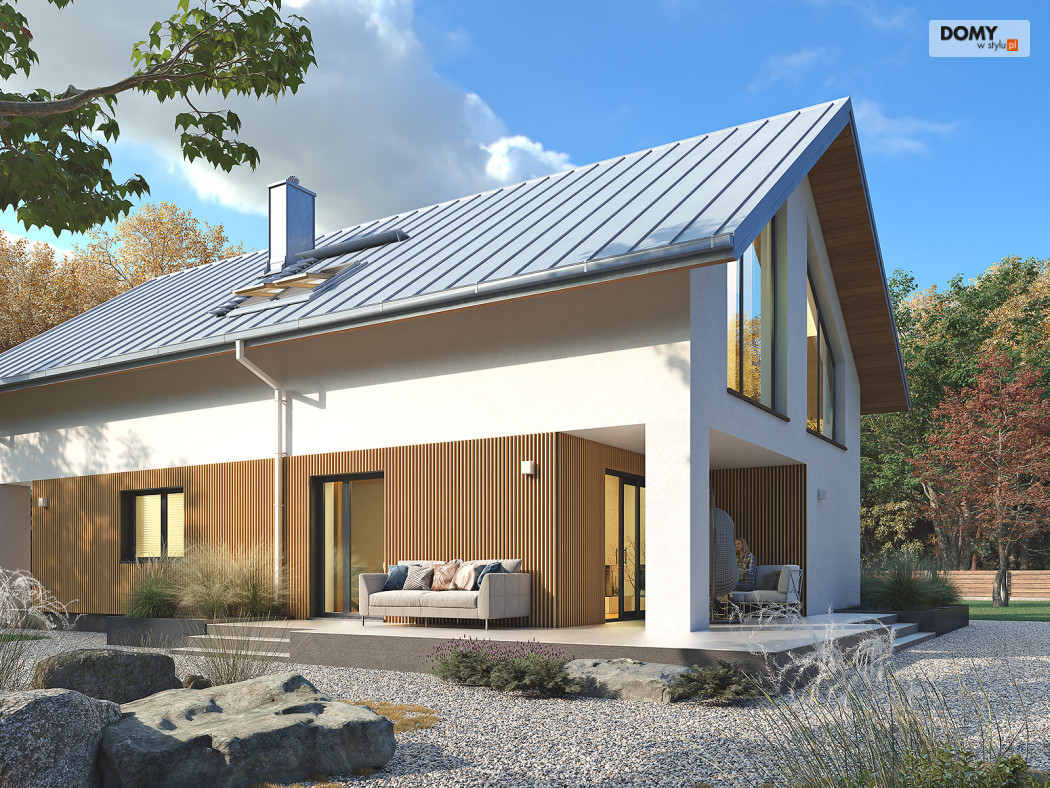 Marcepan to projekt domu z użytkowym poddaszem o powierzchni 156 m2. Projekt posiada ciekawą bryłę wykończoną szalówką i blachą. Mieszkańcy do dyspozycji maja dwustanowiskowy garaż. Na parterze zaprojektowana otwartą część dzienną. Odnaleźć tu można salon, dużą jadalnię oraz kuchnię, przy której doprojektowano spiżarnię. Niewątpliwym atutem projektu jest dodatkowy pokój na parterze, który idealnie sprawdzi się jako gabinet do pracy lub pokój dla gości. Poddasze stanowi prywatną część mieszkańców. Zaprojektowano tu trzy sypialnie, z czego jedna posiada prywatną garderobę. Układ funkcjonalny poddasza dopełnia rodzinna łazienka oraz niewielka pralnia.