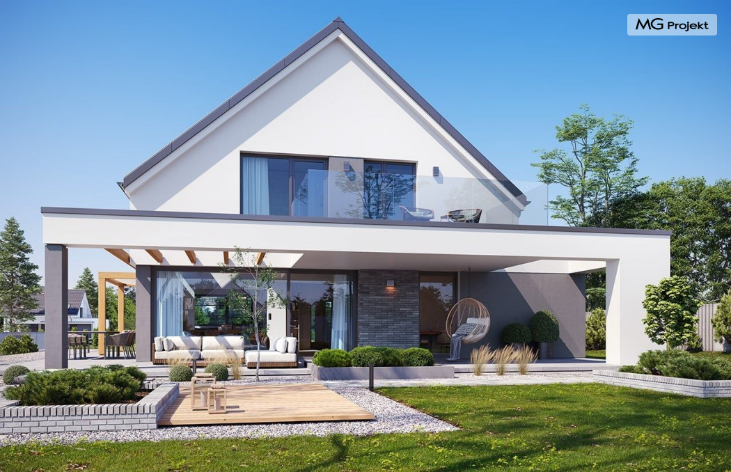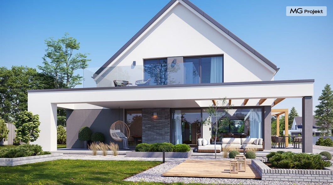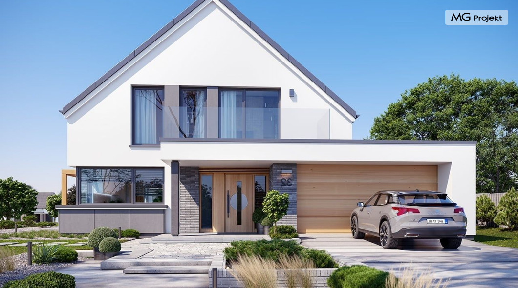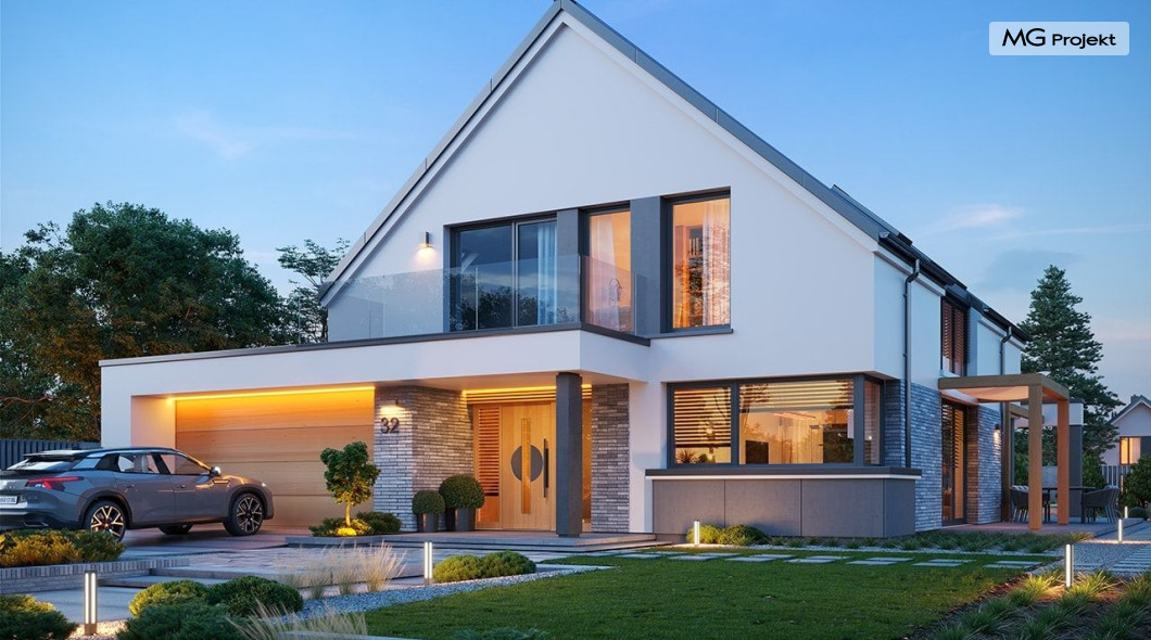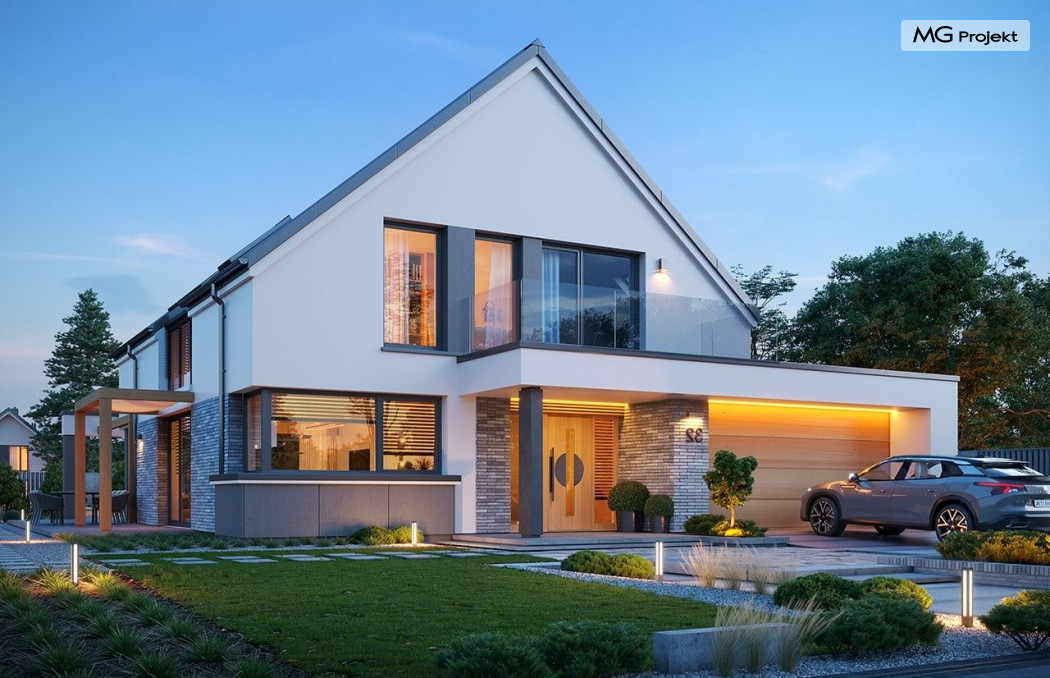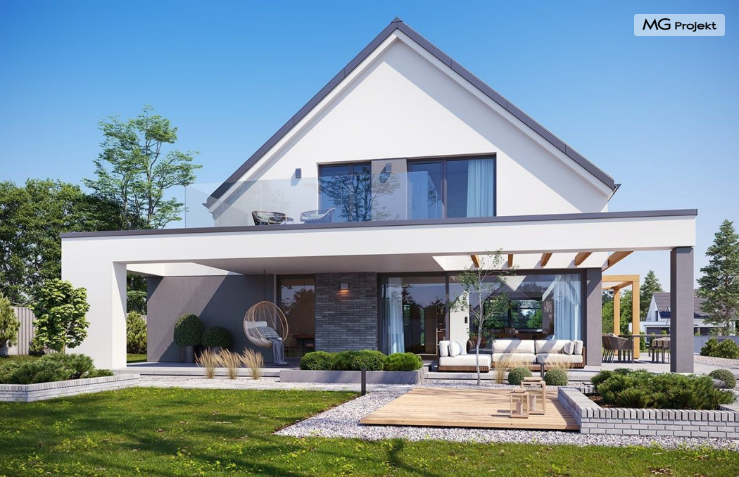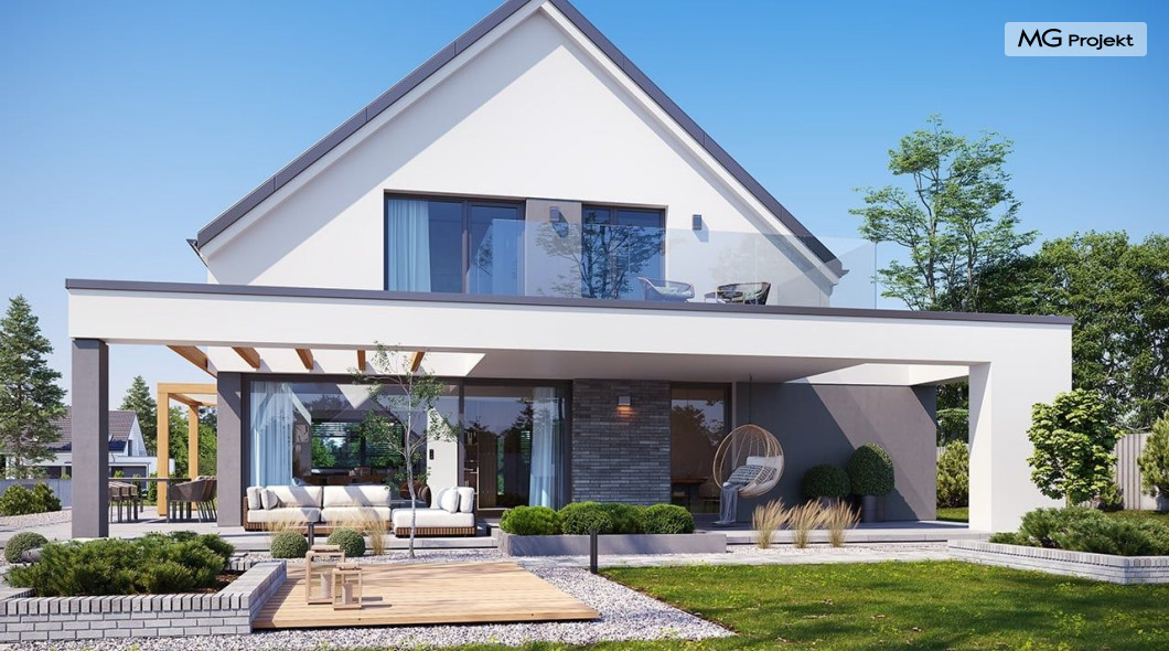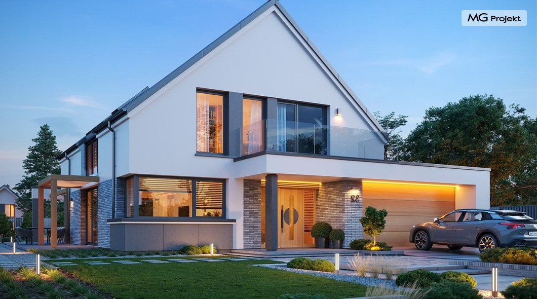 Projekt domu Amber 2 jest to projekt domu jednorodzinnego z serii „Amber”. Jest to parterowy dom z poddaszem użytkowym, zaprojektowany na planie prostokąta, przykryty dwuspadowym bezokapowym dachem, z wbudowaną parterową częścią garażową i zadaszeniem tarasu od strony ogrodu. Budynek zaprojektowano w nowoczesnej stylistyce domu -stodoły, z dachem przykrytym blachą na rąbek stojący i elewacjami wykończonymi częściowo białym tynkiem i płytkami klinkierowymi. Duże przeszklenia okien kontrastują z bielą tynków i urozmaicają sylwetkę. Poziomy pas płytek klinkierowych dodaje budynkowi sznytu i ociepla bryłę. Dzięki takiemu połączeniu materiałów i elementów bryły dom jest nowoczesny, dynamiczny i przyciąga wzrok. Elewację frontową ozdobiono szerokimi drzwiami wejściowymi z naświetlami i pięknym narożnym oknem kuchennym. Od strony ogrodu z kolei główną rolę odgrywa szerokie okno balkonowe salonu i zadaszenie tarasu. Od strony elewacji bocznej zaprojektowano dwupiętrowe przeszklenie jadalni z antresolą. Wnętrze domu podzielono na część dzienną i techniczną na parterze, oraz sypialnie na poddaszu. Na parterze przestrzeń dzienną stanowi salon z meblami wypoczynkowymi przy ścianie telewizyjno-kominkowej, jadalnia z otwarciem przestrzennym na antresolę na poddaszu, hol i kuchnia z wyspą i spiżarnią. Z holu dostać się możemy do dodatkowego pokoju z łazienką, oraz części gospodarczej z garażem i kotłownią. Na poddaszu mamy do dyspozycji cztery pokoje sypialne, z dwiema łazienkami.Sypialnia rodziców stanowi oddzielny apartament z własną łazienką i garderobą. Dzięki wysokim ścianom kolankowym pokoje na poddaszu mają małe skosy i przestrzeń podłóg można wykorzystać niemal w całości. Nad poddaszem przewidziano dodatkowo spory strych. W projekcie zastosowano nowoczesne materiały i technologie, energooszczędne instalacje i dobre izolacje przegród. Dzięki temu koszt utrzymania domu będzie niewygórowany. Prosta konstrukcja budynku powinna ułatwić i przyspieszyć budowę stanu surowego. „ Amber 2 ” stanowi doskonałą propozycję domu dla Inwestorów planujących budowę średniej wielkości domu w stylistyce „stodoły”, z nieprzesadzoną, powściągliwą, a jednocześnie nowoczesną architekturą. Zapraszamy do zapoznania się ze wszystkimi domami z tej serii: https://www.mgprojekt.com.pl/amber, https://www.mgprojekt.com.pl/amber-2, https://www.mgprojekt.com.pl/amber-3, https://www.mgprojekt.com.pl/amber-4.
