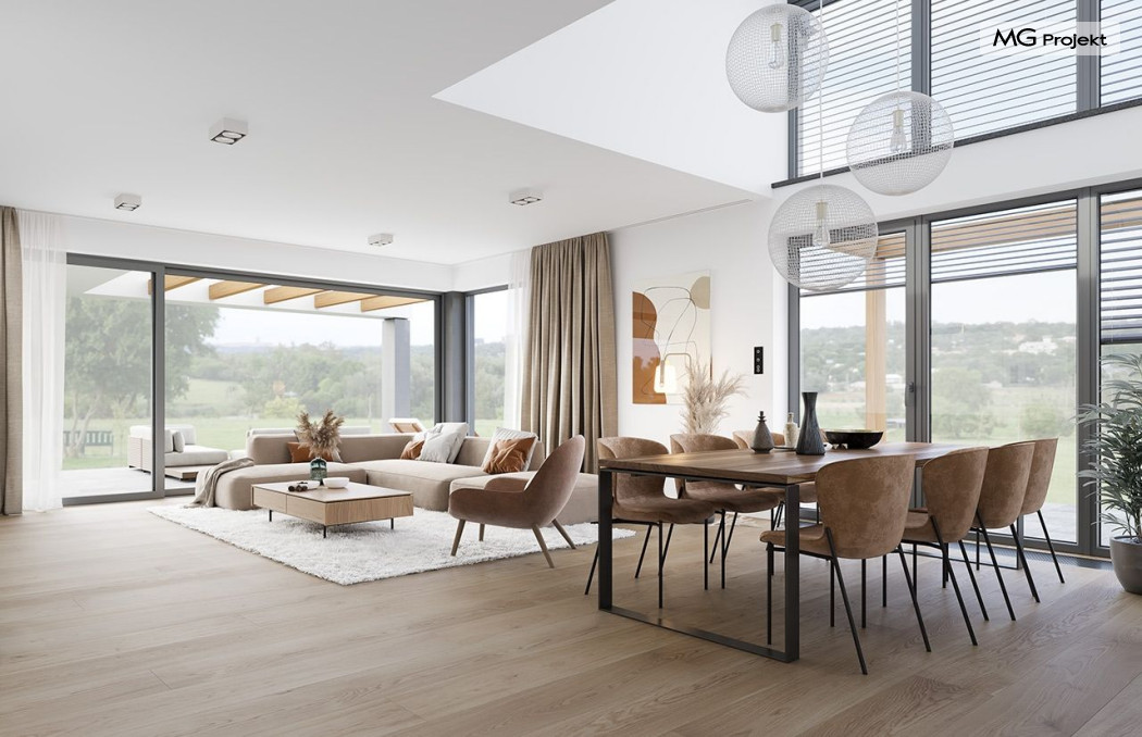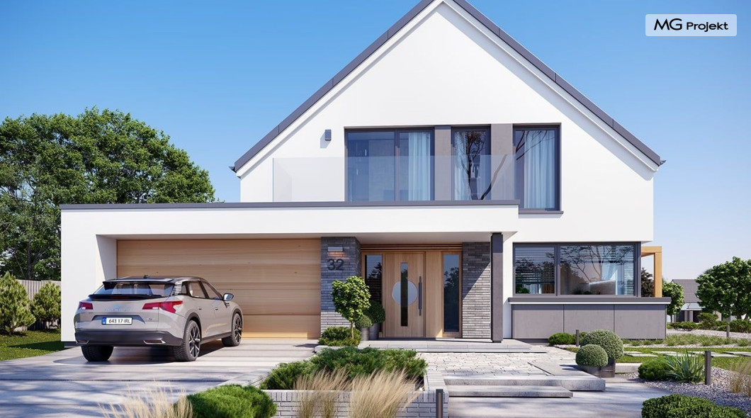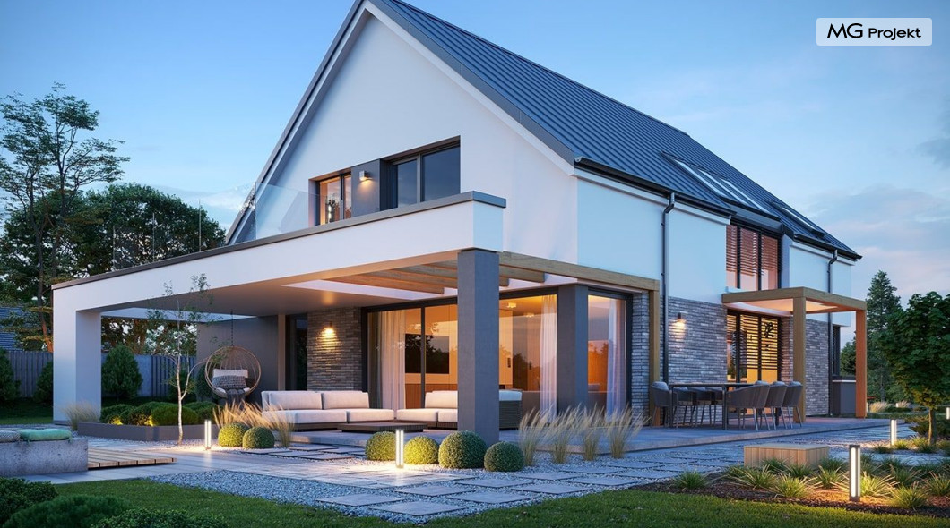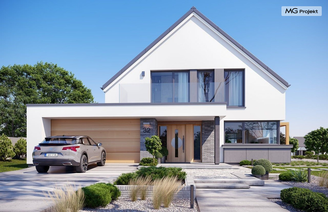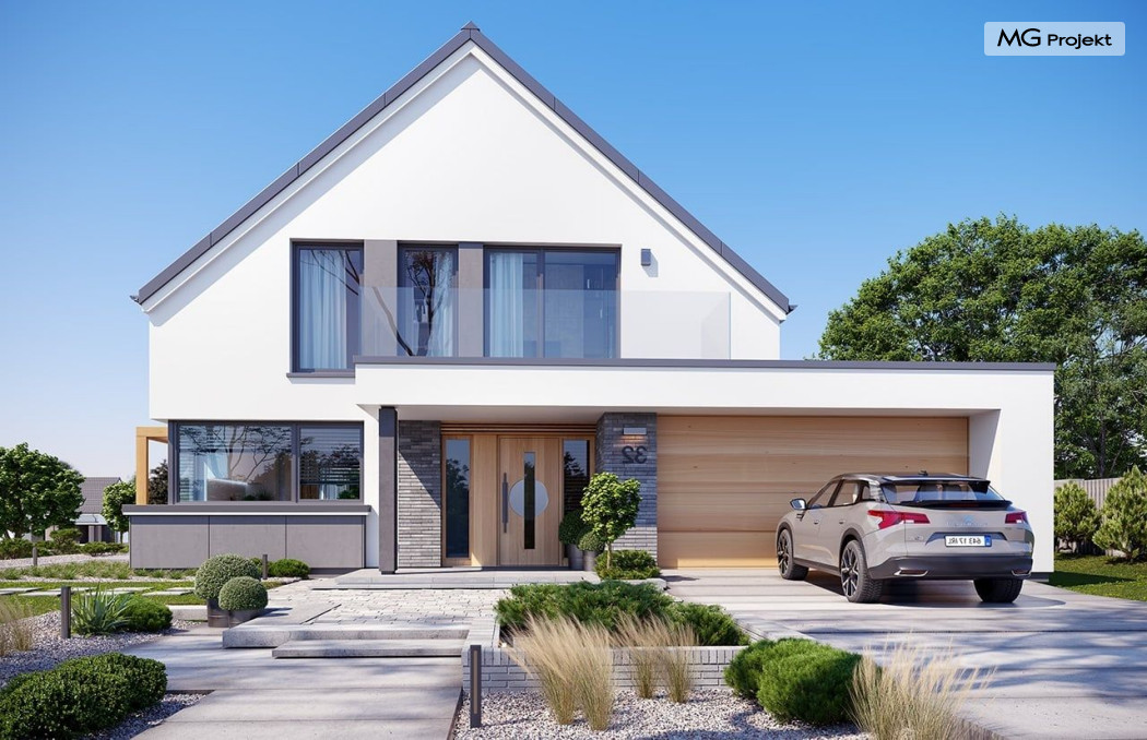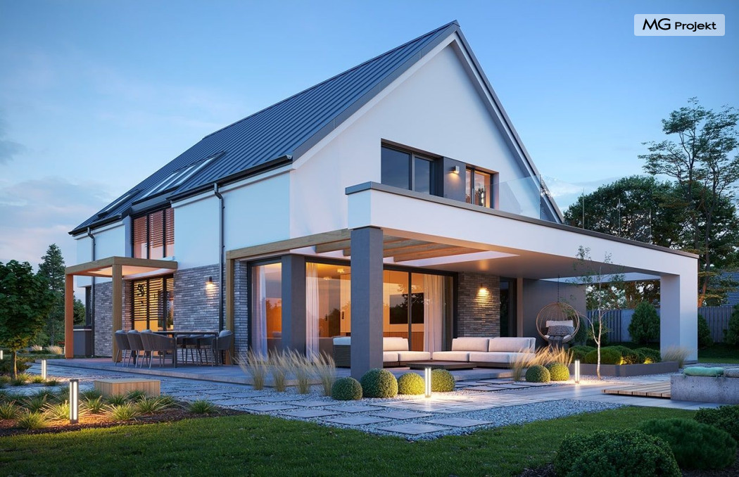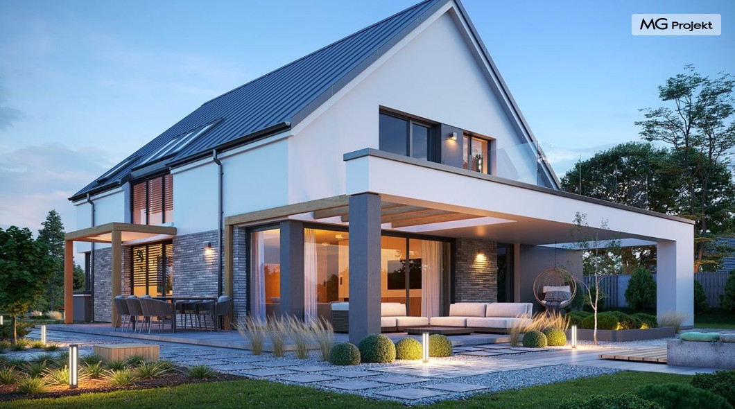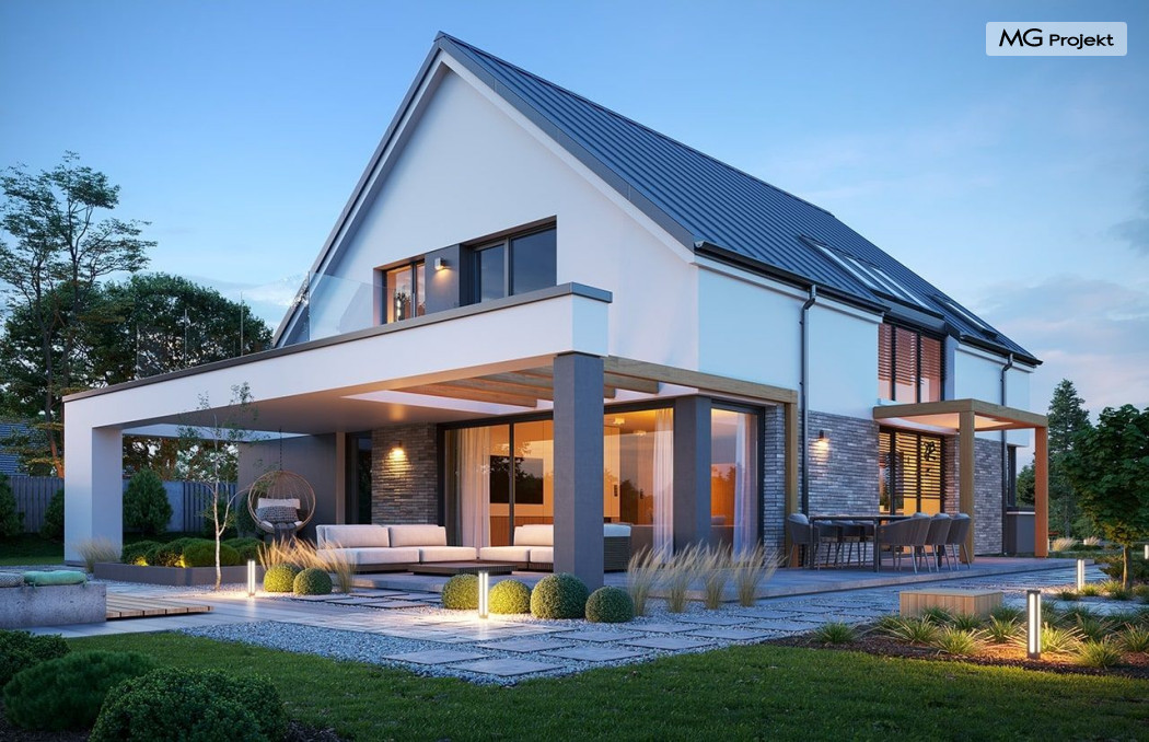 Projekt domu Amber 2 jest to projekt domu jednorodzinnego z serii „Amber”. Jest to parterowy dom z poddaszem użytkowym, zaprojektowany na planie prostokąta, przykryty dwuspadowym bezokapowym dachem, z wbudowaną parterową częścią garażową i zadaszeniem tarasu od strony ogrodu. Budynek zaprojektowano w nowoczesnej stylistyce domu -stodoły, z dachem przykrytym blachą na rąbek stojący i elewacjami wykończonymi częściowo białym tynkiem i płytkami klinkierowymi. Duże przeszklenia okien kontrastują z bielą tynków i urozmaicają sylwetkę. Poziomy pas płytek klinkierowych dodaje budynkowi sznytu i ociepla bryłę. Dzięki takiemu połączeniu materiałów i elementów bryły dom jest nowoczesny, dynamiczny i przyciąga wzrok. Elewację frontową ozdobiono szerokimi drzwiami wejściowymi z naświetlami i pięknym narożnym oknem kuchennym. Od strony ogrodu z kolei główną rolę odgrywa szerokie okno balkonowe salonu i zadaszenie tarasu. Od strony elewacji bocznej zaprojektowano dwupiętrowe przeszklenie jadalni z antresolą. Wnętrze domu podzielono na część dzienną i techniczną na parterze, oraz sypialnie na poddaszu. Na parterze przestrzeń dzienną stanowi salon z meblami wypoczynkowymi przy ścianie telewizyjno-kominkowej, jadalnia z otwarciem przestrzennym na antresolę na poddaszu, hol i kuchnia z wyspą i spiżarnią. Z holu dostać się możemy do dodatkowego pokoju z łazienką, oraz części gospodarczej z garażem i kotłownią. Na poddaszu mamy do dyspozycji cztery pokoje sypialne, z dwiema łazienkami.Sypialnia rodziców stanowi oddzielny apartament z własną łazienką i garderobą. Dzięki wysokim ścianom kolankowym pokoje na poddaszu mają małe skosy i przestrzeń podłóg można wykorzystać niemal w całości. Nad poddaszem przewidziano dodatkowo spory strych. W projekcie zastosowano nowoczesne materiały i technologie, energooszczędne instalacje i dobre izolacje przegród. Dzięki temu koszt utrzymania domu będzie niewygórowany. Prosta konstrukcja budynku powinna ułatwić i przyspieszyć budowę stanu surowego. „ Amber 2 ” stanowi doskonałą propozycję domu dla Inwestorów planujących budowę średniej wielkości domu w stylistyce „stodoły”, z nieprzesadzoną, powściągliwą, a jednocześnie nowoczesną architekturą. Zapraszamy do zapoznania się ze wszystkimi domami z tej serii: https://www.mgprojekt.com.pl/amber, https://www.mgprojekt.com.pl/amber-2, https://www.mgprojekt.com.pl/amber-3, https://www.mgprojekt.com.pl/amber-4.