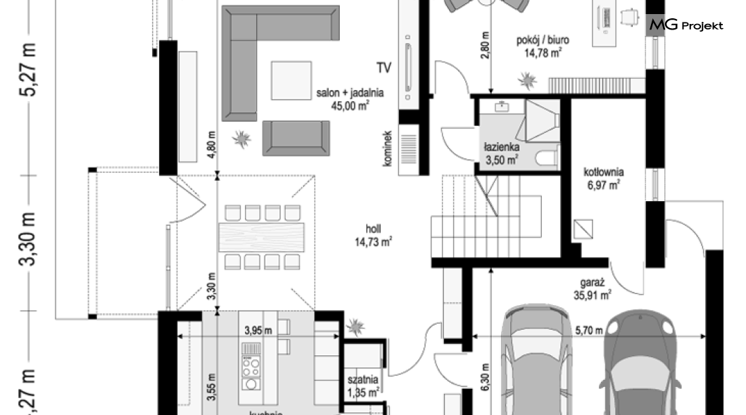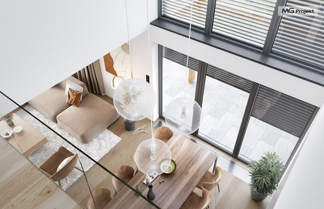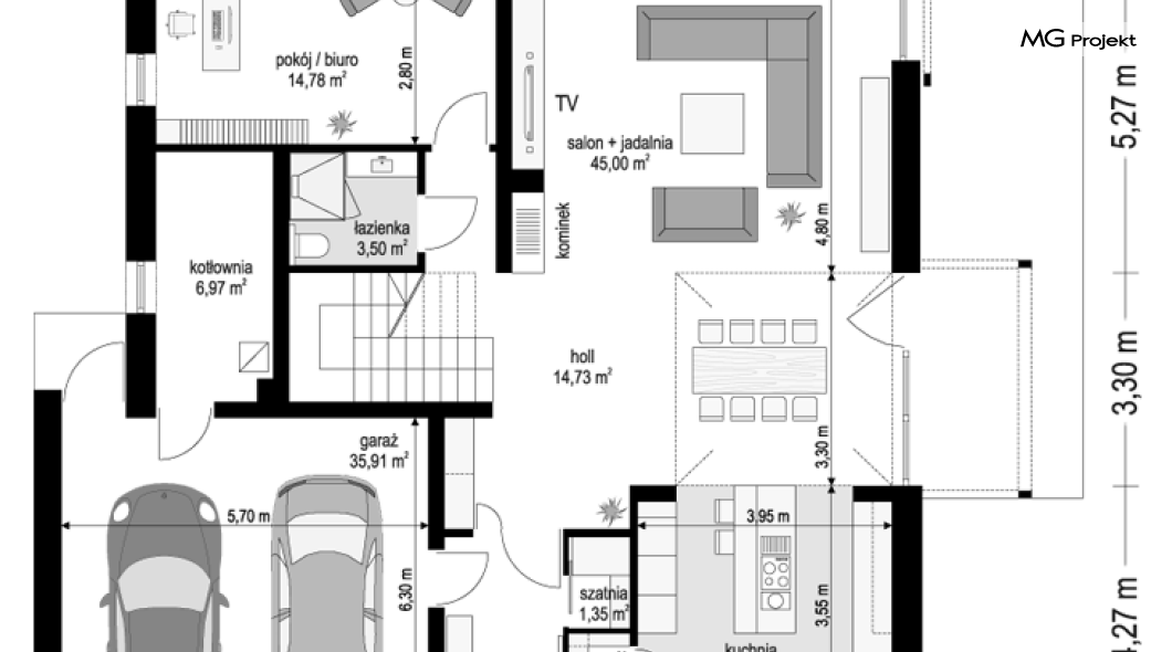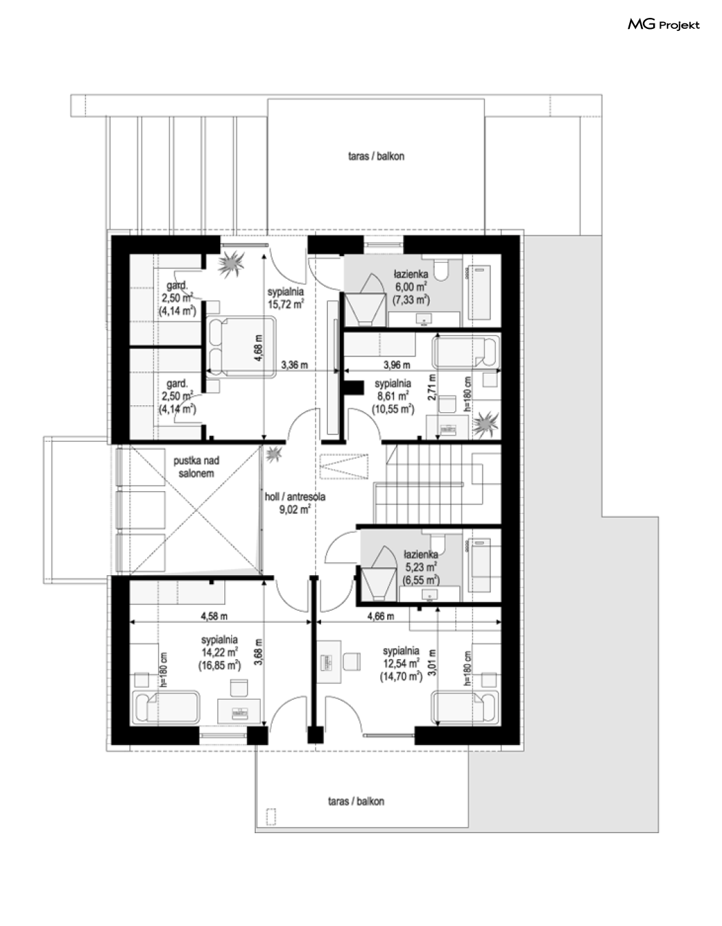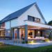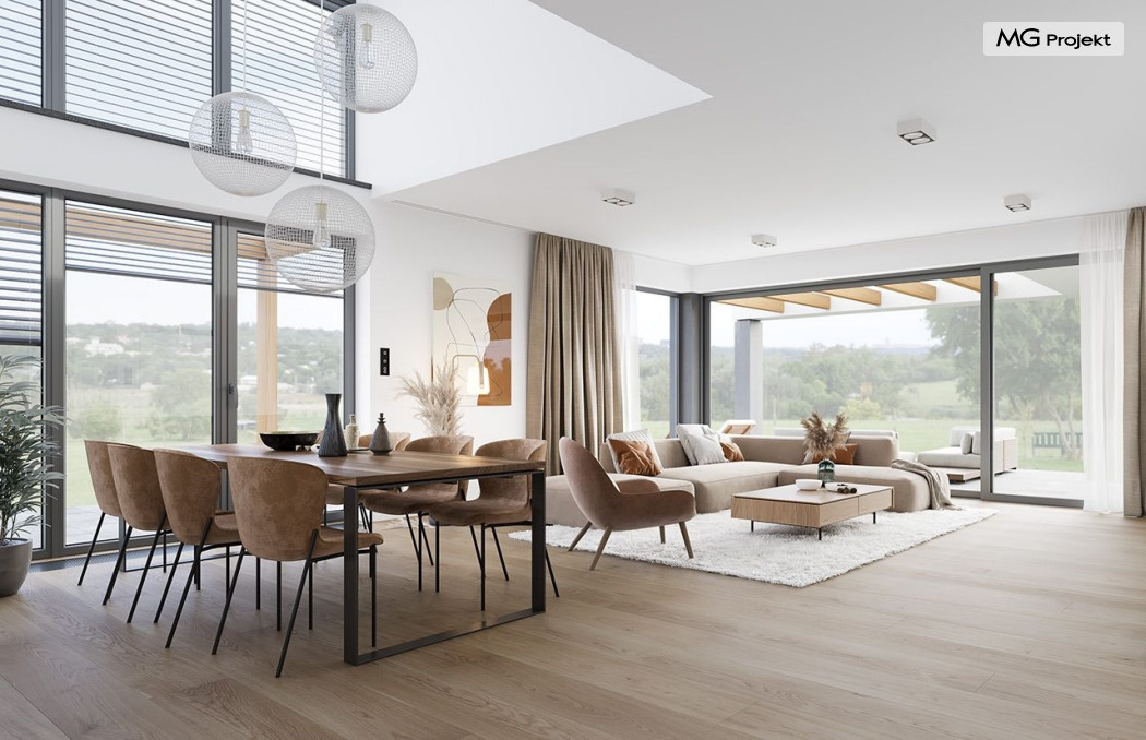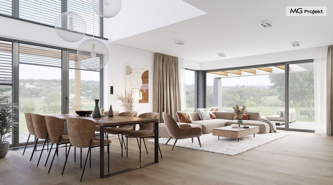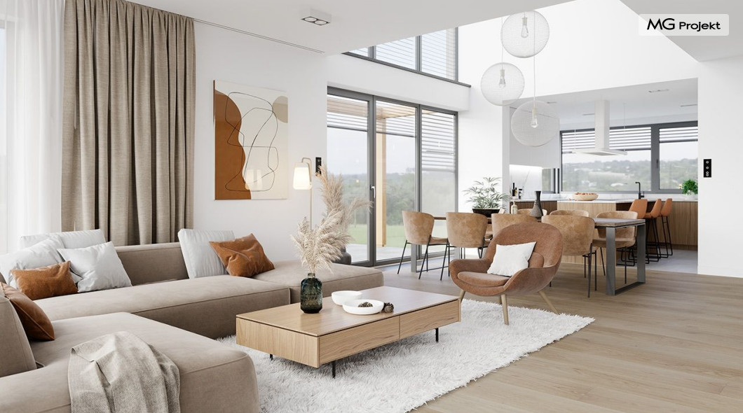 Projekt domu Amber 2 jest to projekt domu jednorodzinnego z serii „Amber”. Jest to parterowy dom z poddaszem użytkowym, zaprojektowany na planie prostokąta, przykryty dwuspadowym bezokapowym dachem, z wbudowaną parterową częścią garażową i zadaszeniem tarasu od strony ogrodu. Budynek zaprojektowano w nowoczesnej stylistyce domu -stodoły, z dachem przykrytym blachą na rąbek stojący i elewacjami wykończonymi częściowo białym tynkiem i płytkami klinkierowymi. Duże przeszklenia okien kontrastują z bielą tynków i urozmaicają sylwetkę. Poziomy pas płytek klinkierowych dodaje budynkowi sznytu i ociepla bryłę. Dzięki takiemu połączeniu materiałów i elementów bryły dom jest nowoczesny, dynamiczny i przyciąga wzrok. Elewację frontową ozdobiono szerokimi drzwiami wejściowymi z naświetlami i pięknym narożnym oknem kuchennym. Od strony ogrodu z kolei główną rolę odgrywa szerokie okno balkonowe salonu i zadaszenie tarasu. Od strony elewacji bocznej zaprojektowano dwupiętrowe przeszklenie jadalni z antresolą. Wnętrze domu podzielono na część dzienną i techniczną na parterze, oraz sypialnie na poddaszu. Na parterze przestrzeń dzienną stanowi salon z meblami wypoczynkowymi przy ścianie telewizyjno-kominkowej, jadalnia z otwarciem przestrzennym na antresolę na poddaszu, hol i kuchnia z wyspą i spiżarnią. Z holu dostać się możemy do dodatkowego pokoju z łazienką, oraz części gospodarczej z garażem i kotłownią. Na poddaszu mamy do dyspozycji cztery pokoje sypialne, z dwiema łazienkami.Sypialnia rodziców stanowi oddzielny apartament z własną łazienką i garderobą. Dzięki wysokim ścianom kolankowym pokoje na poddaszu mają małe skosy i przestrzeń podłóg można wykorzystać niemal w całości. Nad poddaszem przewidziano dodatkowo spory strych. W projekcie zastosowano nowoczesne materiały i technologie, energooszczędne instalacje i dobre izolacje przegród. Dzięki temu koszt utrzymania domu będzie niewygórowany. Prosta konstrukcja budynku powinna ułatwić i przyspieszyć budowę stanu surowego. „ Amber 2 ” stanowi doskonałą propozycję domu dla Inwestorów planujących budowę średniej wielkości domu w stylistyce „stodoły”, z nieprzesadzoną, powściągliwą, a jednocześnie nowoczesną architekturą. Zapraszamy do zapoznania się ze wszystkimi domami z tej serii: https://www.mgprojekt.com.pl/amber, https://www.mgprojekt.com.pl/amber-2, https://www.mgprojekt.com.pl/amber-3, https://www.mgprojekt.com.pl/amber-4.
