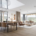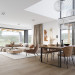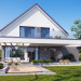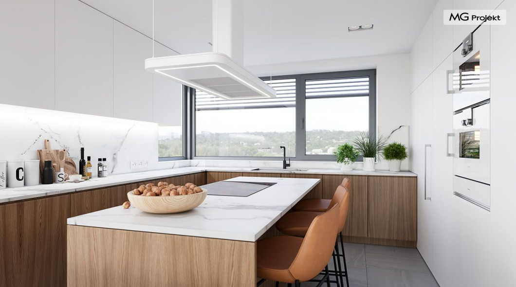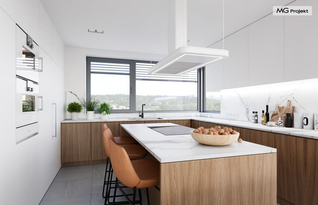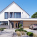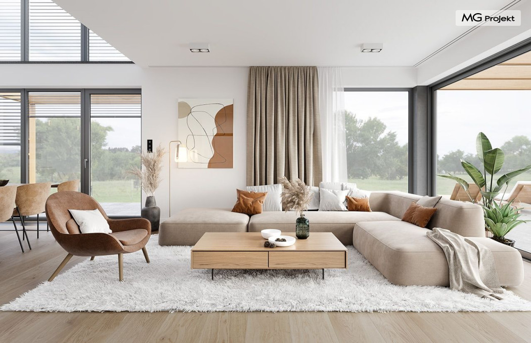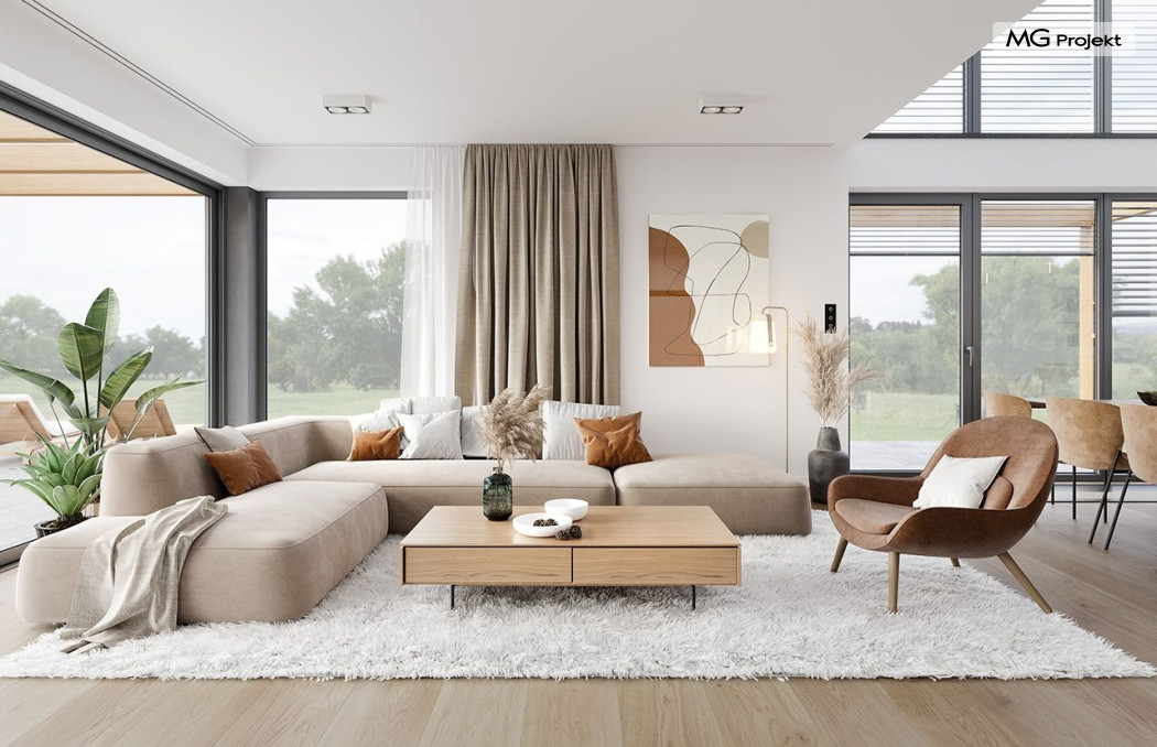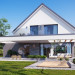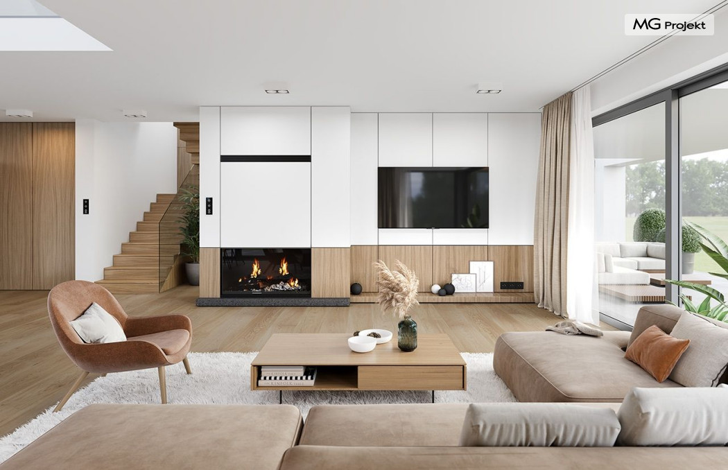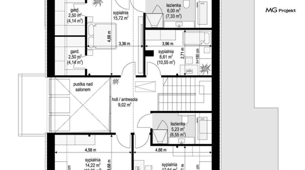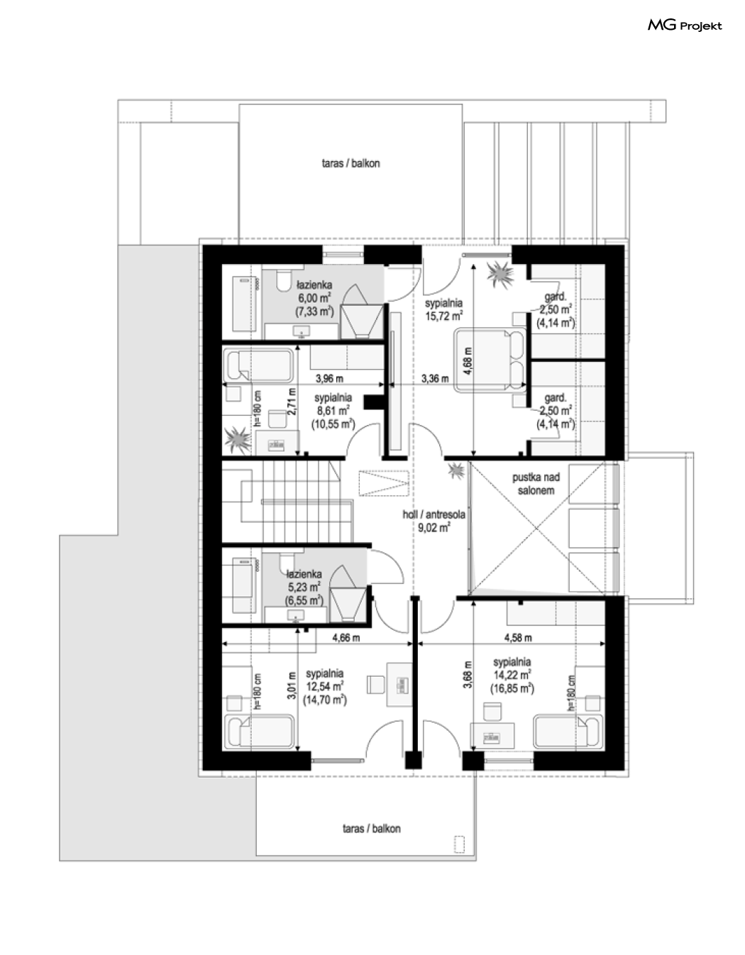 Projekt domu Amber 2 jest to projekt domu jednorodzinnego z serii „Amber”. Jest to parterowy dom z poddaszem użytkowym, zaprojektowany na planie prostokąta, przykryty dwuspadowym bezokapowym dachem, z wbudowaną parterową częścią garażową i zadaszeniem tarasu od strony ogrodu. Budynek zaprojektowano w nowoczesnej stylistyce domu -stodoły, z dachem przykrytym blachą na rąbek stojący i elewacjami wykończonymi częściowo białym tynkiem i płytkami klinkierowymi. Duże przeszklenia okien kontrastują z bielą tynków i urozmaicają sylwetkę. Poziomy pas płytek klinkierowych dodaje budynkowi sznytu i ociepla bryłę. Dzięki takiemu połączeniu materiałów i elementów bryły dom jest nowoczesny, dynamiczny i przyciąga wzrok. Elewację frontową ozdobiono szerokimi drzwiami wejściowymi z naświetlami i pięknym narożnym oknem kuchennym. Od strony ogrodu z kolei główną rolę odgrywa szerokie okno balkonowe salonu i zadaszenie tarasu. Od strony elewacji bocznej zaprojektowano dwupiętrowe przeszklenie jadalni z antresolą. Wnętrze domu podzielono na część dzienną i techniczną na parterze, oraz sypialnie na poddaszu. Na parterze przestrzeń dzienną stanowi salon z meblami wypoczynkowymi przy ścianie telewizyjno-kominkowej, jadalnia z otwarciem przestrzennym na antresolę na poddaszu, hol i kuchnia z wyspą i spiżarnią. Z holu dostać się możemy do dodatkowego pokoju z łazienką, oraz części gospodarczej z garażem i kotłownią. Na poddaszu mamy do dyspozycji cztery pokoje sypialne, z dwiema łazienkami.Sypialnia rodziców stanowi oddzielny apartament z własną łazienką i garderobą. Dzięki wysokim ścianom kolankowym pokoje na poddaszu mają małe skosy i przestrzeń podłóg można wykorzystać niemal w całości. Nad poddaszem przewidziano dodatkowo spory strych. W projekcie zastosowano nowoczesne materiały i technologie, energooszczędne instalacje i dobre izolacje przegród. Dzięki temu koszt utrzymania domu będzie niewygórowany. Prosta konstrukcja budynku powinna ułatwić i przyspieszyć budowę stanu surowego. „ Amber 2 ” stanowi doskonałą propozycję domu dla Inwestorów planujących budowę średniej wielkości domu w stylistyce „stodoły”, z nieprzesadzoną, powściągliwą, a jednocześnie nowoczesną architekturą. Zapraszamy do zapoznania się ze wszystkimi domami z tej serii: https://www.mgprojekt.com.pl/amber, https://www.mgprojekt.com.pl/amber-2, https://www.mgprojekt.com.pl/amber-3, https://www.mgprojekt.com.pl/amber-4.