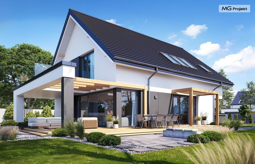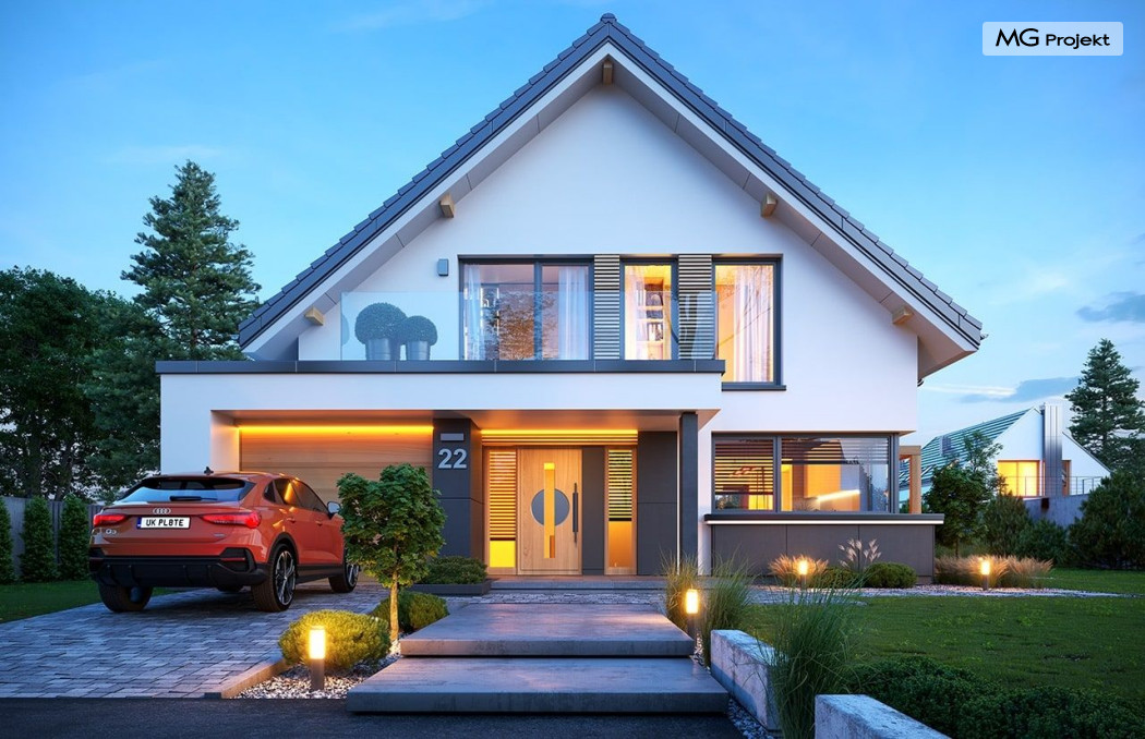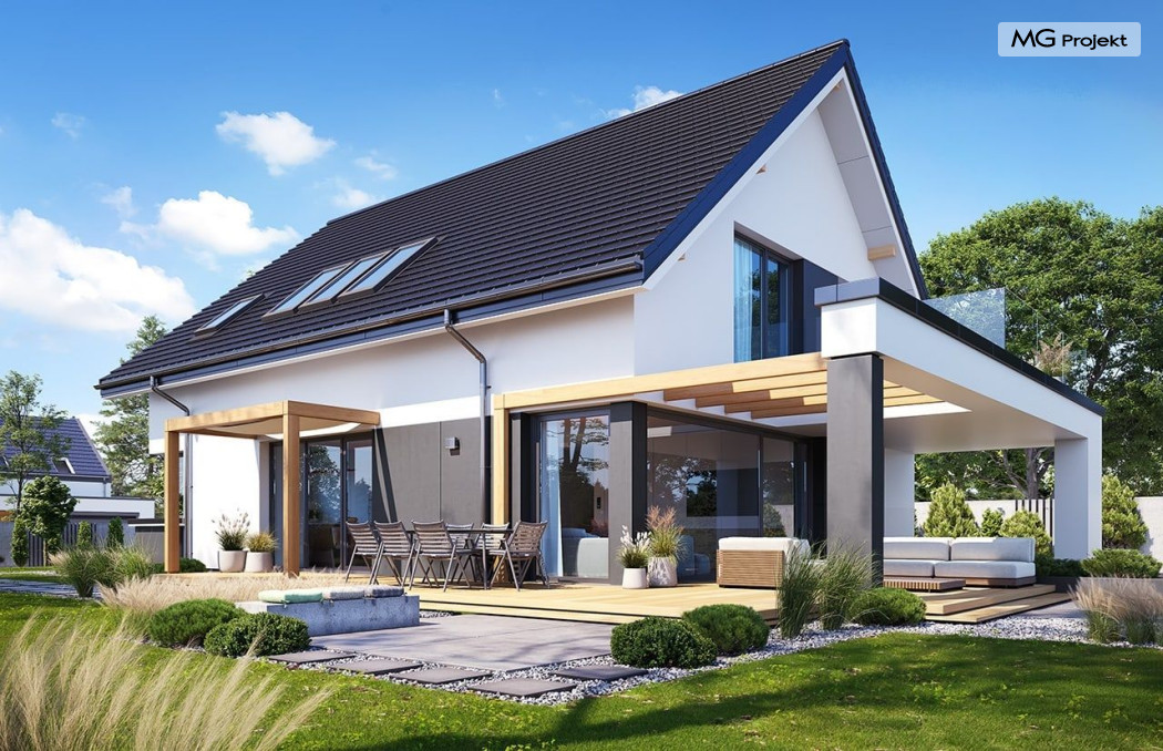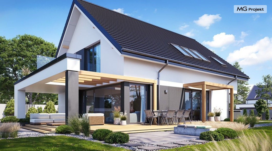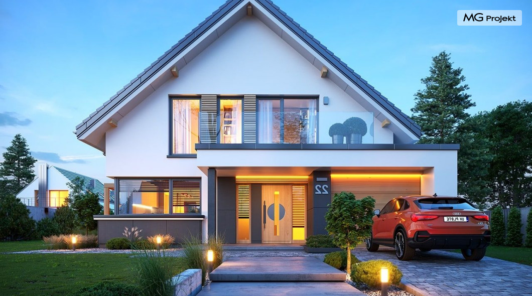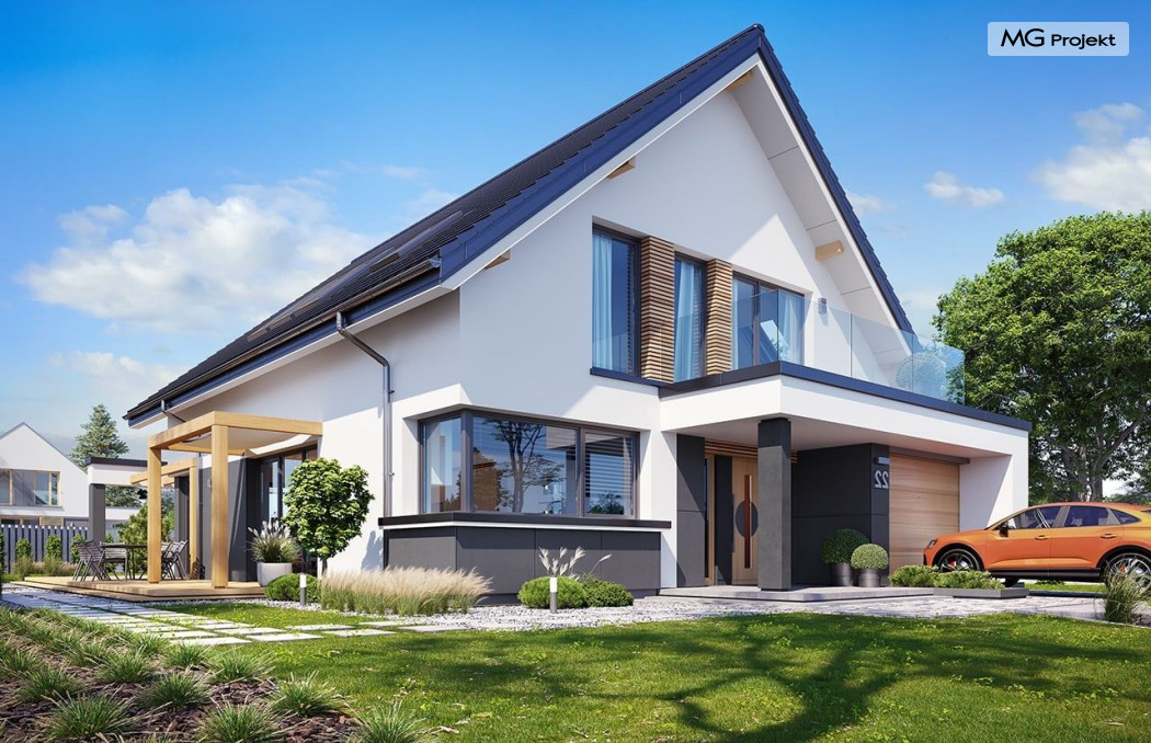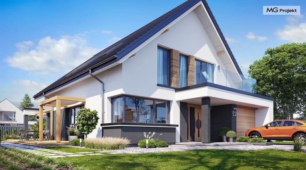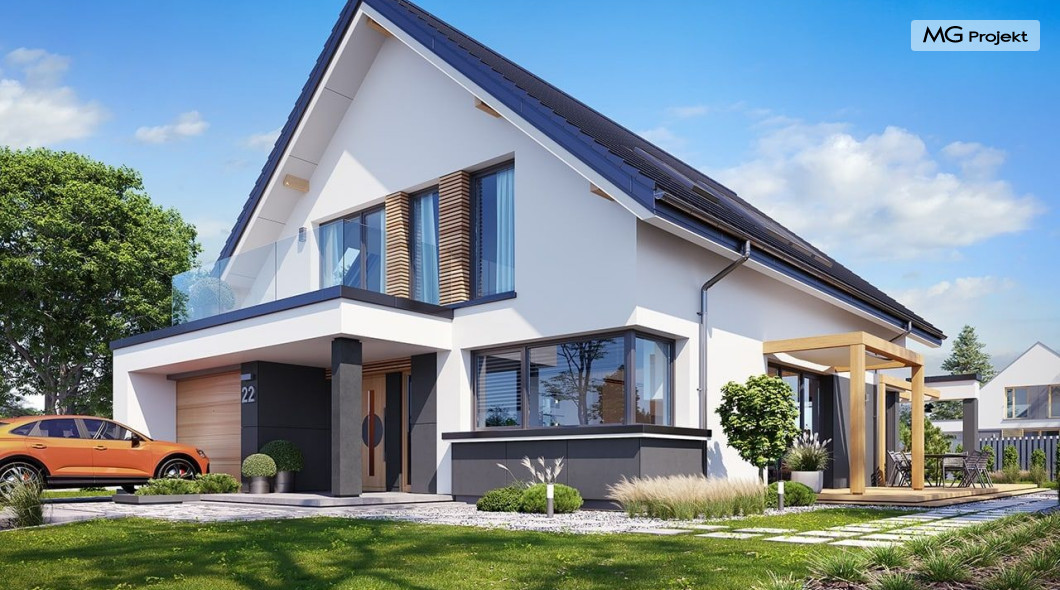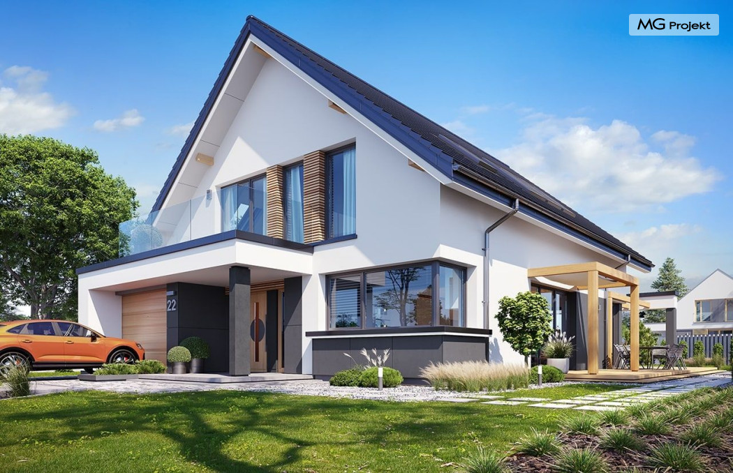Projekt domu Amber 3 jest to projekt parterowego domu jednorodzinnego z poddaszem użytkowym, z serii „Amber” – projekt Amber 3. Budynek zaprojektowano na prostokątnym rzucie, przykrytym dwuspadowym dachem. Prosta bryła domu została urozmaicona dobudowanym garażem i zadaszeniem nad podestem wejściowym od frontu, oraz dużym zadaszeniem nad tarasem od strony ogrodowej. Architektura domu łączy w sobie prostotę formy, z atrakcyjnym detalem i dobrze dobranymi materiałami wykończeniowymi.Tradycyjna sylwetka budynku połączona została tutaj z dużymi przeszkleniami i modnymi kontrastowymi okładzinami ścian, dodającymi „Amberowi” dynamiki i nowoczesnego sznytu.Kształt budynku i układ okien pozwala na wybudowanie go na dość wąskiej parceli. Wnętrze podzielone zostało na część dzienną i gospodarczą na parterze, oraz pokoje sypialne na poddaszu. Do środka wchodzimy reprezentacyjnymi drzwiami frontowymi, przez przedsionek z szatnią, do holu i pokoju dziennego. Znajdująca się od frontu domu kuchnia z wyspą i spiżarnią stanowi dopełnienie pokoju dziennego. W salonie wydzielono jadalnię z otwarciem przestrzennym na antresolę na poddaszu, oraz część wypoczynkową ze ścianą telewizyjno-kominkową i pięknymi szerokimi drzwiami balkonowymi na zadaszony taras. Na parterze zaprojektowano dodatkowy pokój z łazienką, oraz garaż z kotłownią. Poddasze użytkowe to cztery pokoje sypialnie z dwiema łazienkami, w tym oddzielny apartament rodziców z własną łazienką i garderobą. Dzięki wysokim ścianom kolankowym pokoje na poddaszu mają małe skosy i przestrzeń podłóg można wykorzystać niemal w całości. W projekcie zastosowano nowoczesne materiały i technologie, energooszczędne instalacje i dobre izolacje przegród. Dzięki temu koszt późniejszej eksploatacji budynku będzie niski. Dom ma prostą konstrukcję i nie jest skomplikowany w budowie. „ Amber 3” to dobra propozycja dla Inwestorów planujących budowę średniej wielkości domu jednorodzinnego z poddaszem użytkowym, pasującego na wąską parcelę. Domu o rozsądnej wielkości, atrakcyjnym wyglądzie i funkcjonalnym wnętrzu. Zapraszamy do zapoznania się ze wszystkimi domami z tej serii: https://www.mgprojekt.com.pl/amber, https://www.mgprojekt.com.pl/amber-2, https://www.mgprojekt.com.pl/amber-3, https://www.mgprojekt.com.pl/amber-4.