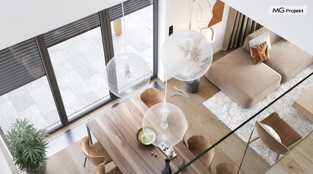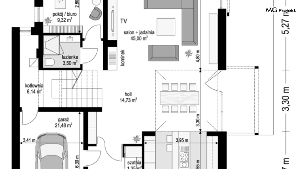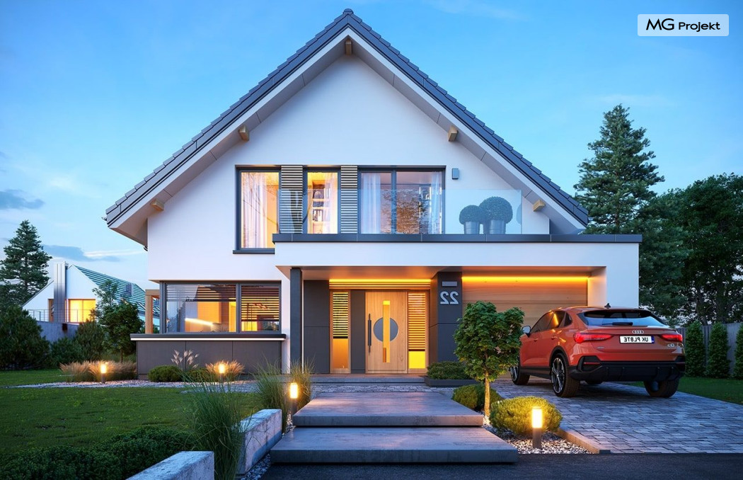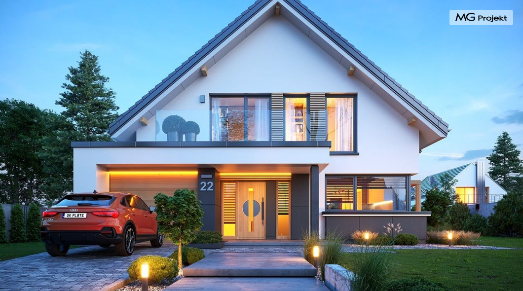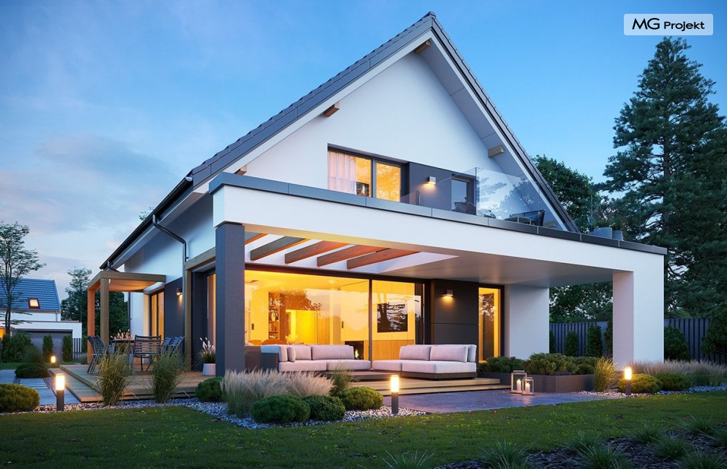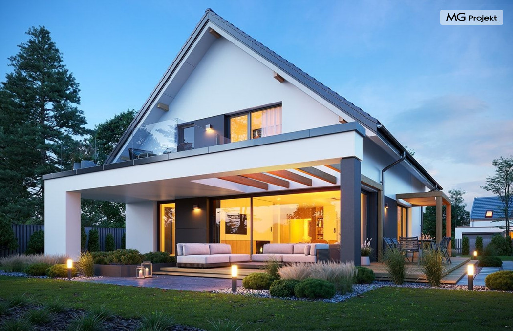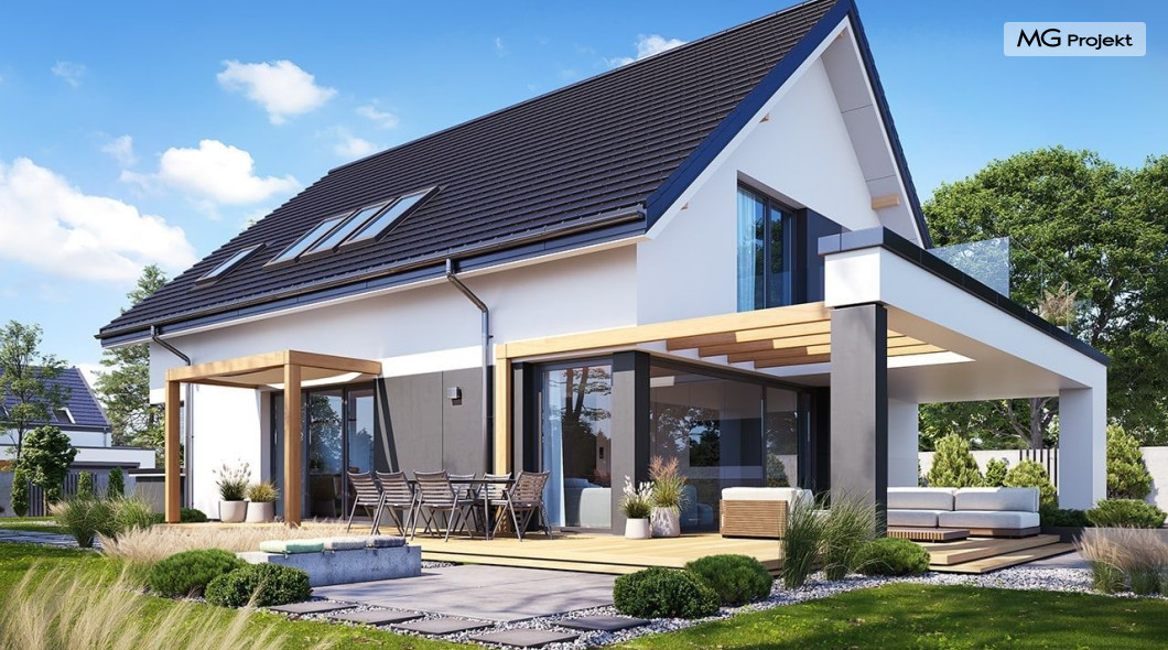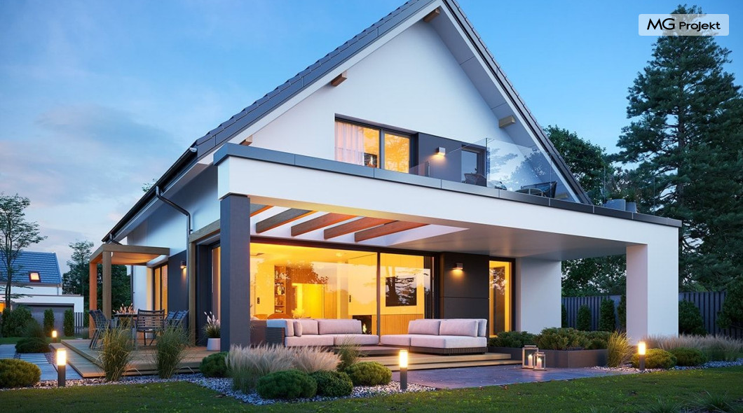 Projekt domu Amber 3 jest to projekt parterowego domu jednorodzinnego z poddaszem użytkowym, z serii „Amber” – projekt Amber 3. Budynek zaprojektowano na prostokątnym rzucie, przykrytym dwuspadowym dachem. Prosta bryła domu została urozmaicona dobudowanym garażem i zadaszeniem nad podestem wejściowym od frontu, oraz dużym zadaszeniem nad tarasem od strony ogrodowej. Architektura domu łączy w sobie prostotę formy, z atrakcyjnym detalem i dobrze dobranymi materiałami wykończeniowymi.Tradycyjna sylwetka budynku połączona została tutaj z dużymi przeszkleniami i modnymi kontrastowymi okładzinami ścian, dodającymi „Amberowi” dynamiki i nowoczesnego sznytu.Kształt budynku i układ okien pozwala na wybudowanie go na dość wąskiej parceli. Wnętrze podzielone zostało na część dzienną i gospodarczą na parterze, oraz pokoje sypialne na poddaszu. Do środka wchodzimy reprezentacyjnymi drzwiami frontowymi, przez przedsionek z szatnią, do holu i pokoju dziennego. Znajdująca się od frontu domu kuchnia z wyspą i spiżarnią stanowi dopełnienie pokoju dziennego. W salonie wydzielono jadalnię z otwarciem przestrzennym na antresolę na poddaszu, oraz część wypoczynkową ze ścianą telewizyjno-kominkową i pięknymi szerokimi drzwiami balkonowymi na zadaszony taras. Na parterze zaprojektowano dodatkowy pokój z łazienką, oraz garaż z kotłownią. Poddasze użytkowe to cztery pokoje sypialnie z dwiema łazienkami, w tym oddzielny apartament rodziców z własną łazienką i garderobą. Dzięki wysokim ścianom kolankowym pokoje na poddaszu mają małe skosy i przestrzeń podłóg można wykorzystać niemal w całości. W projekcie zastosowano nowoczesne materiały i technologie, energooszczędne instalacje i dobre izolacje przegród. Dzięki temu koszt późniejszej eksploatacji budynku będzie niski. Dom ma prostą konstrukcję i nie jest skomplikowany w budowie. „ Amber 3” to dobra propozycja dla Inwestorów planujących budowę średniej wielkości domu jednorodzinnego z poddaszem użytkowym, pasującego na wąską parcelę. Domu o rozsądnej wielkości, atrakcyjnym wyglądzie i funkcjonalnym wnętrzu. Zapraszamy do zapoznania się ze wszystkimi domami z tej serii: https://www.mgprojekt.com.pl/amber, https://www.mgprojekt.com.pl/amber-2, https://www.mgprojekt.com.pl/amber-3, https://www.mgprojekt.com.pl/amber-4.