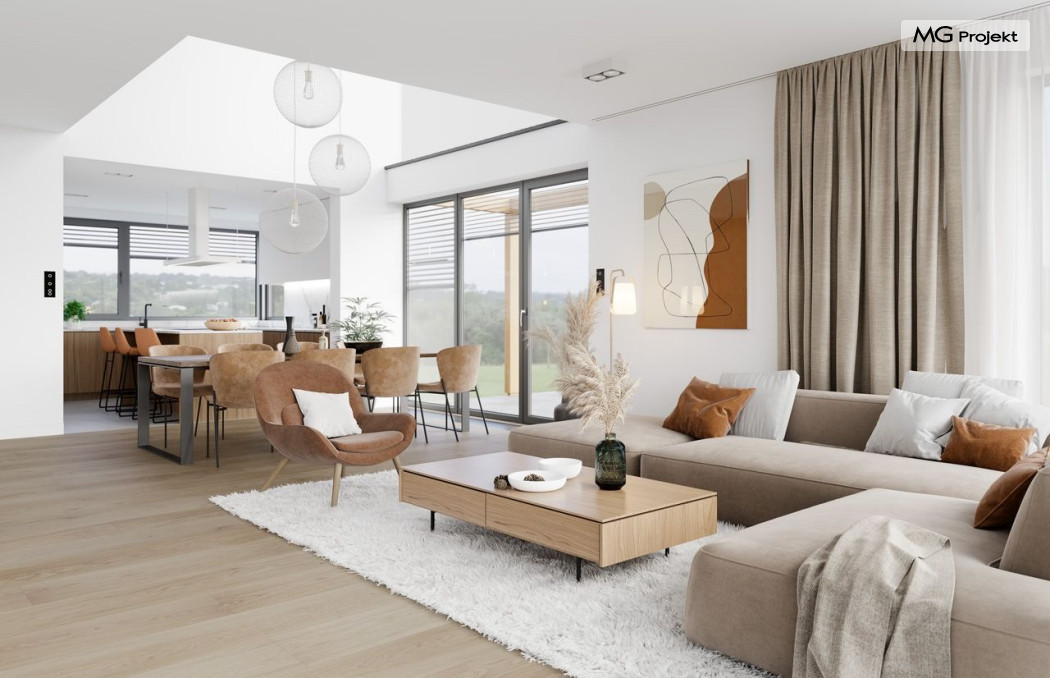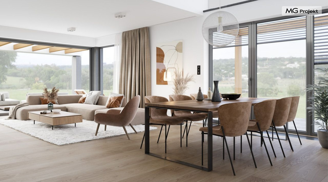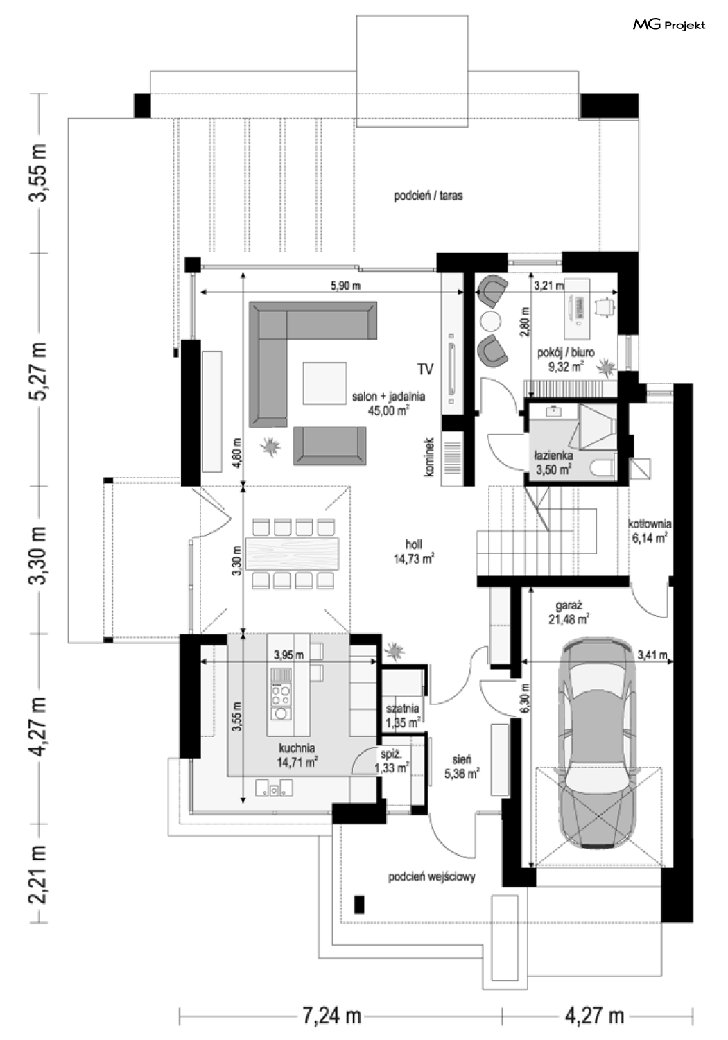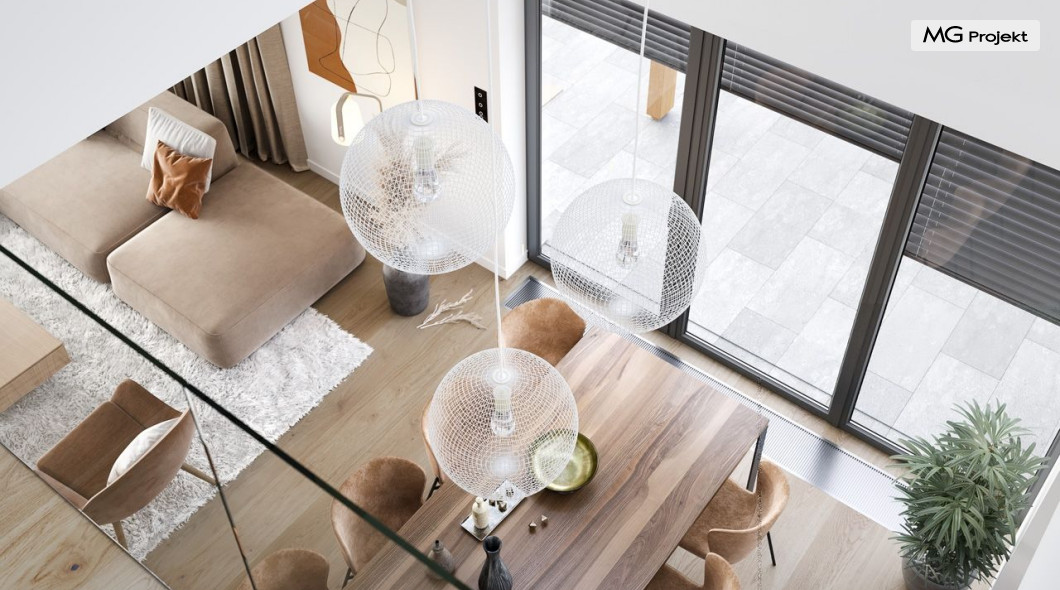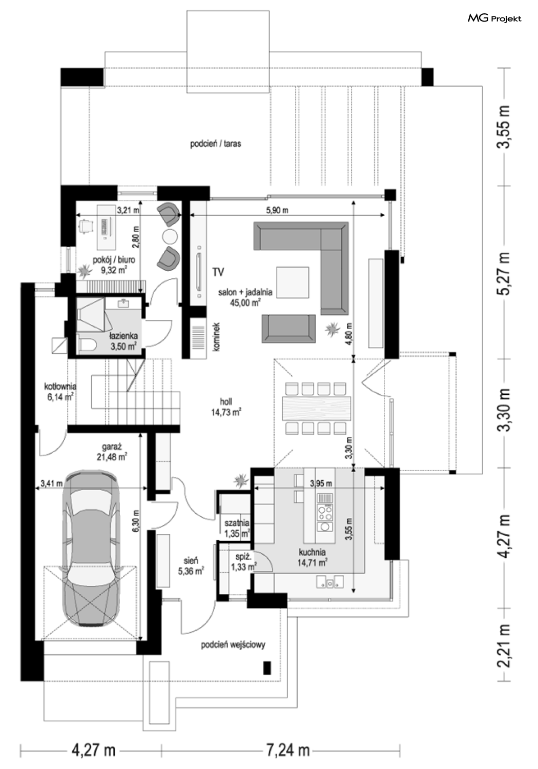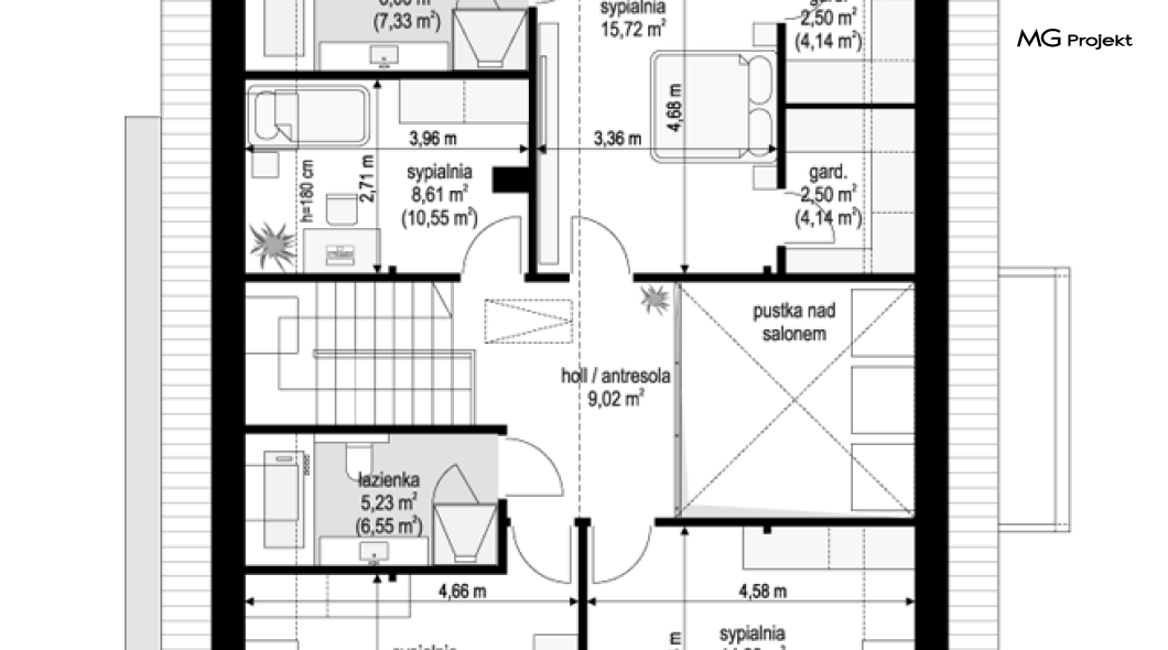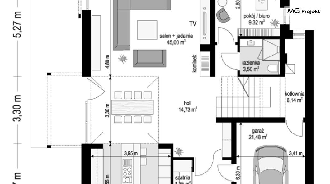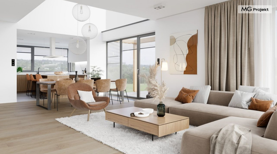 Projekt domu Amber 3 jest to projekt parterowego domu jednorodzinnego z poddaszem użytkowym, z serii „Amber” – projekt Amber 3. Budynek zaprojektowano na prostokątnym rzucie, przykrytym dwuspadowym dachem. Prosta bryła domu została urozmaicona dobudowanym garażem i zadaszeniem nad podestem wejściowym od frontu, oraz dużym zadaszeniem nad tarasem od strony ogrodowej. Architektura domu łączy w sobie prostotę formy, z atrakcyjnym detalem i dobrze dobranymi materiałami wykończeniowymi.Tradycyjna sylwetka budynku połączona została tutaj z dużymi przeszkleniami i modnymi kontrastowymi okładzinami ścian, dodającymi „Amberowi” dynamiki i nowoczesnego sznytu.Kształt budynku i układ okien pozwala na wybudowanie go na dość wąskiej parceli. Wnętrze podzielone zostało na część dzienną i gospodarczą na parterze, oraz pokoje sypialne na poddaszu. Do środka wchodzimy reprezentacyjnymi drzwiami frontowymi, przez przedsionek z szatnią, do holu i pokoju dziennego. Znajdująca się od frontu domu kuchnia z wyspą i spiżarnią stanowi dopełnienie pokoju dziennego. W salonie wydzielono jadalnię z otwarciem przestrzennym na antresolę na poddaszu, oraz część wypoczynkową ze ścianą telewizyjno-kominkową i pięknymi szerokimi drzwiami balkonowymi na zadaszony taras. Na parterze zaprojektowano dodatkowy pokój z łazienką, oraz garaż z kotłownią. Poddasze użytkowe to cztery pokoje sypialnie z dwiema łazienkami, w tym oddzielny apartament rodziców z własną łazienką i garderobą. Dzięki wysokim ścianom kolankowym pokoje na poddaszu mają małe skosy i przestrzeń podłóg można wykorzystać niemal w całości. W projekcie zastosowano nowoczesne materiały i technologie, energooszczędne instalacje i dobre izolacje przegród. Dzięki temu koszt późniejszej eksploatacji budynku będzie niski. Dom ma prostą konstrukcję i nie jest skomplikowany w budowie. „ Amber 3” to dobra propozycja dla Inwestorów planujących budowę średniej wielkości domu jednorodzinnego z poddaszem użytkowym, pasującego na wąską parcelę. Domu o rozsądnej wielkości, atrakcyjnym wyglądzie i funkcjonalnym wnętrzu. Zapraszamy do zapoznania się ze wszystkimi domami z tej serii: https://www.mgprojekt.com.pl/amber, https://www.mgprojekt.com.pl/amber-2, https://www.mgprojekt.com.pl/amber-3, https://www.mgprojekt.com.pl/amber-4.