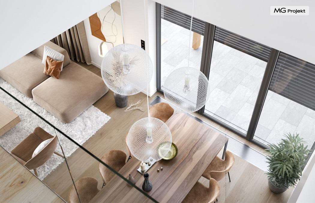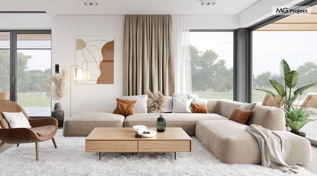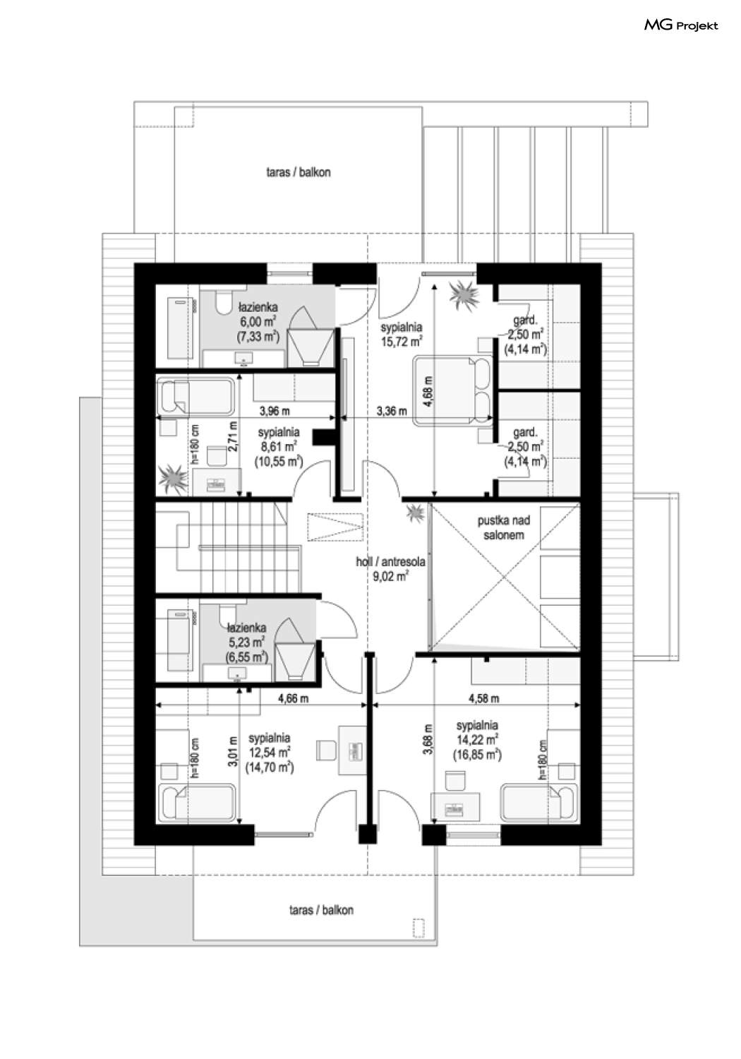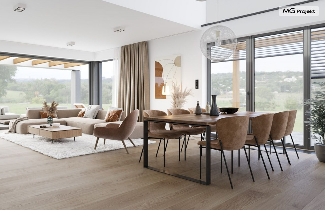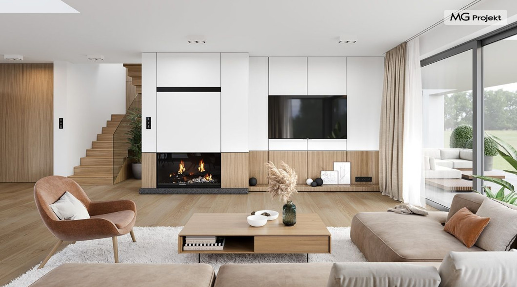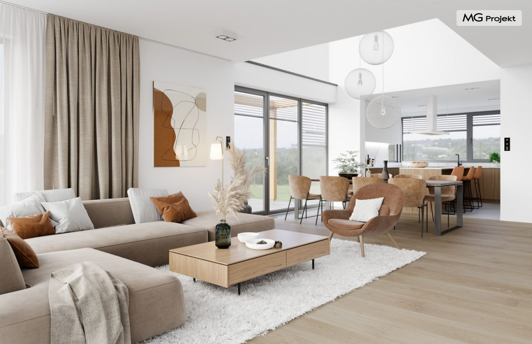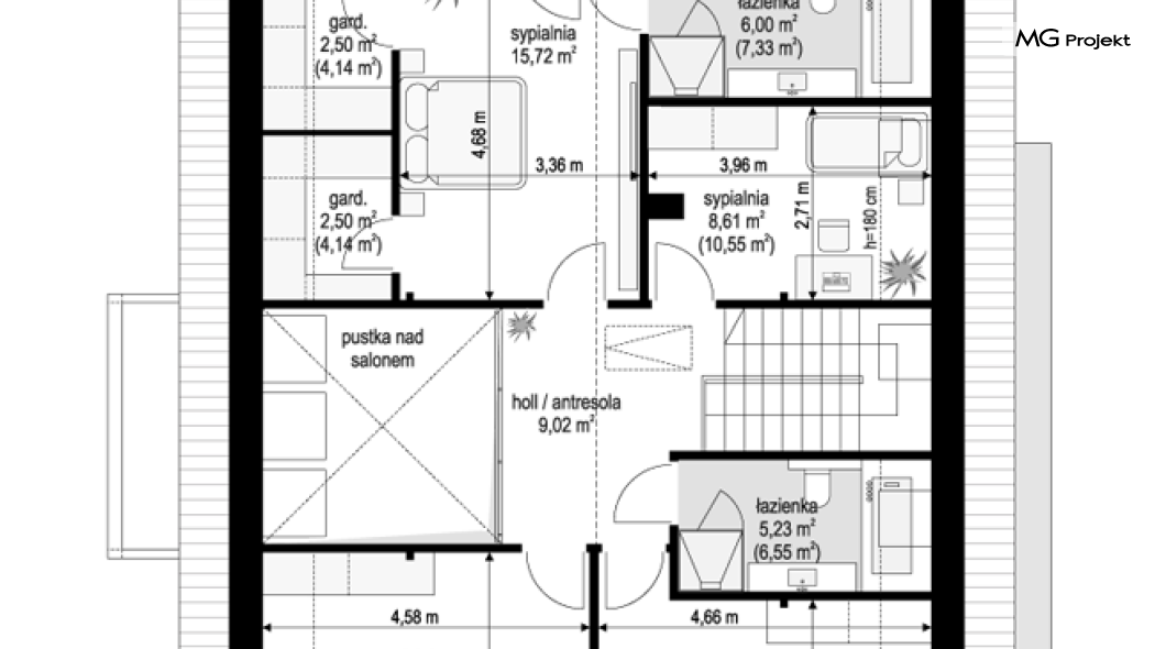 Projekt domu Amber 3 jest to projekt parterowego domu jednorodzinnego z poddaszem użytkowym, z serii „Amber” – projekt Amber 3. Budynek zaprojektowano na prostokątnym rzucie, przykrytym dwuspadowym dachem. Prosta bryła domu została urozmaicona dobudowanym garażem i zadaszeniem nad podestem wejściowym od frontu, oraz dużym zadaszeniem nad tarasem od strony ogrodowej. Architektura domu łączy w sobie prostotę formy, z atrakcyjnym detalem i dobrze dobranymi materiałami wykończeniowymi.Tradycyjna sylwetka budynku połączona została tutaj z dużymi przeszkleniami i modnymi kontrastowymi okładzinami ścian, dodającymi „Amberowi” dynamiki i nowoczesnego sznytu.Kształt budynku i układ okien pozwala na wybudowanie go na dość wąskiej parceli. Wnętrze podzielone zostało na część dzienną i gospodarczą na parterze, oraz pokoje sypialne na poddaszu. Do środka wchodzimy reprezentacyjnymi drzwiami frontowymi, przez przedsionek z szatnią, do holu i pokoju dziennego. Znajdująca się od frontu domu kuchnia z wyspą i spiżarnią stanowi dopełnienie pokoju dziennego. W salonie wydzielono jadalnię z otwarciem przestrzennym na antresolę na poddaszu, oraz część wypoczynkową ze ścianą telewizyjno-kominkową i pięknymi szerokimi drzwiami balkonowymi na zadaszony taras. Na parterze zaprojektowano dodatkowy pokój z łazienką, oraz garaż z kotłownią. Poddasze użytkowe to cztery pokoje sypialnie z dwiema łazienkami, w tym oddzielny apartament rodziców z własną łazienką i garderobą. Dzięki wysokim ścianom kolankowym pokoje na poddaszu mają małe skosy i przestrzeń podłóg można wykorzystać niemal w całości. W projekcie zastosowano nowoczesne materiały i technologie, energooszczędne instalacje i dobre izolacje przegród. Dzięki temu koszt późniejszej eksploatacji budynku będzie niski. Dom ma prostą konstrukcję i nie jest skomplikowany w budowie. „ Amber 3” to dobra propozycja dla Inwestorów planujących budowę średniej wielkości domu jednorodzinnego z poddaszem użytkowym, pasującego na wąską parcelę. Domu o rozsądnej wielkości, atrakcyjnym wyglądzie i funkcjonalnym wnętrzu. Zapraszamy do zapoznania się ze wszystkimi domami z tej serii: https://www.mgprojekt.com.pl/amber, https://www.mgprojekt.com.pl/amber-2, https://www.mgprojekt.com.pl/amber-3, https://www.mgprojekt.com.pl/amber-4.