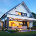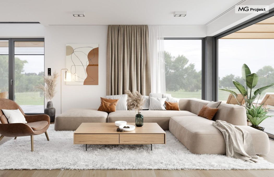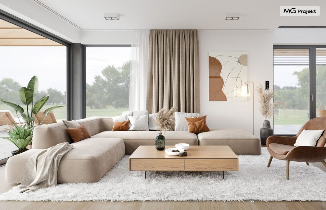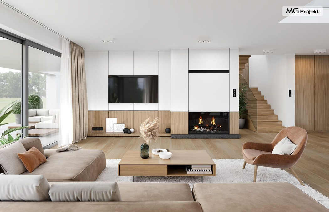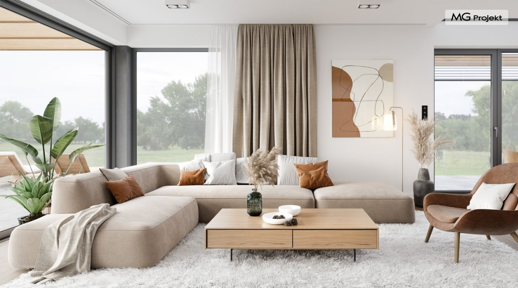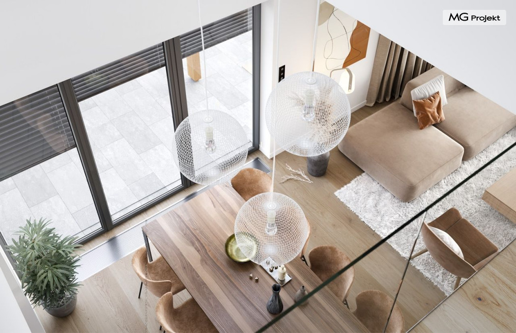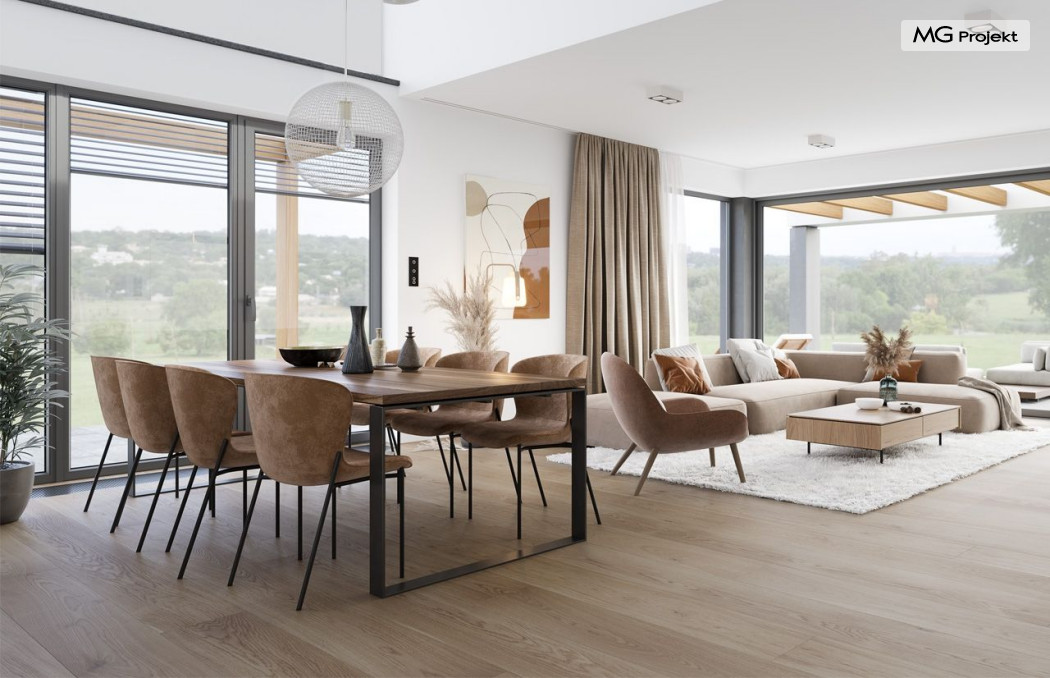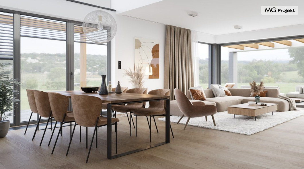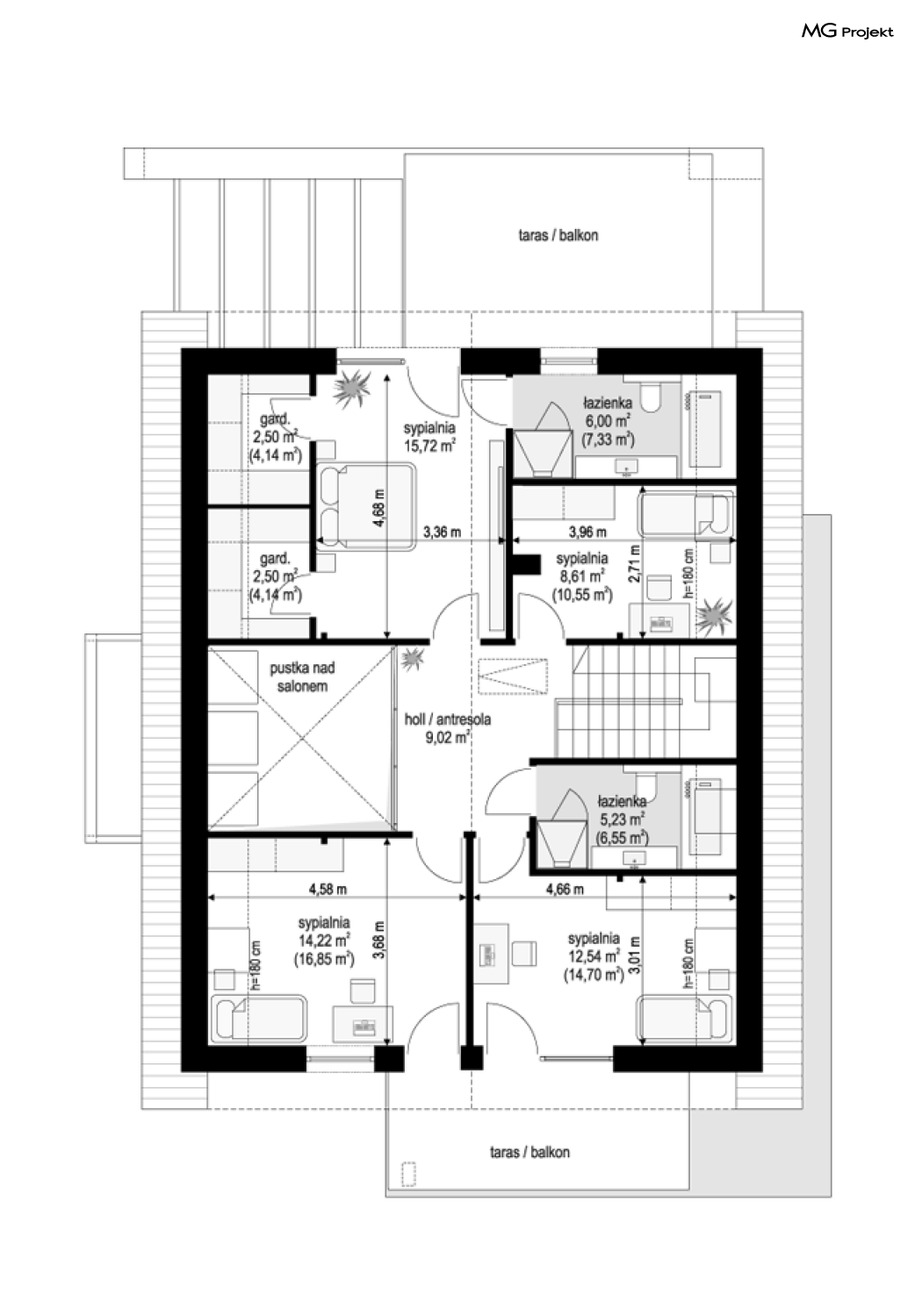 Projekt domu Amber 3 jest to projekt parterowego domu jednorodzinnego z poddaszem użytkowym, z serii „Amber” – projekt Amber 3. Budynek zaprojektowano na prostokątnym rzucie, przykrytym dwuspadowym dachem. Prosta bryła domu została urozmaicona dobudowanym garażem i zadaszeniem nad podestem wejściowym od frontu, oraz dużym zadaszeniem nad tarasem od strony ogrodowej. Architektura domu łączy w sobie prostotę formy, z atrakcyjnym detalem i dobrze dobranymi materiałami wykończeniowymi.Tradycyjna sylwetka budynku połączona została tutaj z dużymi przeszkleniami i modnymi kontrastowymi okładzinami ścian, dodającymi „Amberowi” dynamiki i nowoczesnego sznytu.Kształt budynku i układ okien pozwala na wybudowanie go na dość wąskiej parceli. Wnętrze podzielone zostało na część dzienną i gospodarczą na parterze, oraz pokoje sypialne na poddaszu. Do środka wchodzimy reprezentacyjnymi drzwiami frontowymi, przez przedsionek z szatnią, do holu i pokoju dziennego. Znajdująca się od frontu domu kuchnia z wyspą i spiżarnią stanowi dopełnienie pokoju dziennego. W salonie wydzielono jadalnię z otwarciem przestrzennym na antresolę na poddaszu, oraz część wypoczynkową ze ścianą telewizyjno-kominkową i pięknymi szerokimi drzwiami balkonowymi na zadaszony taras. Na parterze zaprojektowano dodatkowy pokój z łazienką, oraz garaż z kotłownią. Poddasze użytkowe to cztery pokoje sypialnie z dwiema łazienkami, w tym oddzielny apartament rodziców z własną łazienką i garderobą. Dzięki wysokim ścianom kolankowym pokoje na poddaszu mają małe skosy i przestrzeń podłóg można wykorzystać niemal w całości. W projekcie zastosowano nowoczesne materiały i technologie, energooszczędne instalacje i dobre izolacje przegród. Dzięki temu koszt późniejszej eksploatacji budynku będzie niski. Dom ma prostą konstrukcję i nie jest skomplikowany w budowie. „ Amber 3” to dobra propozycja dla Inwestorów planujących budowę średniej wielkości domu jednorodzinnego z poddaszem użytkowym, pasującego na wąską parcelę. Domu o rozsądnej wielkości, atrakcyjnym wyglądzie i funkcjonalnym wnętrzu. Zapraszamy do zapoznania się ze wszystkimi domami z tej serii: https://www.mgprojekt.com.pl/amber, https://www.mgprojekt.com.pl/amber-2, https://www.mgprojekt.com.pl/amber-3, https://www.mgprojekt.com.pl/amber-4.