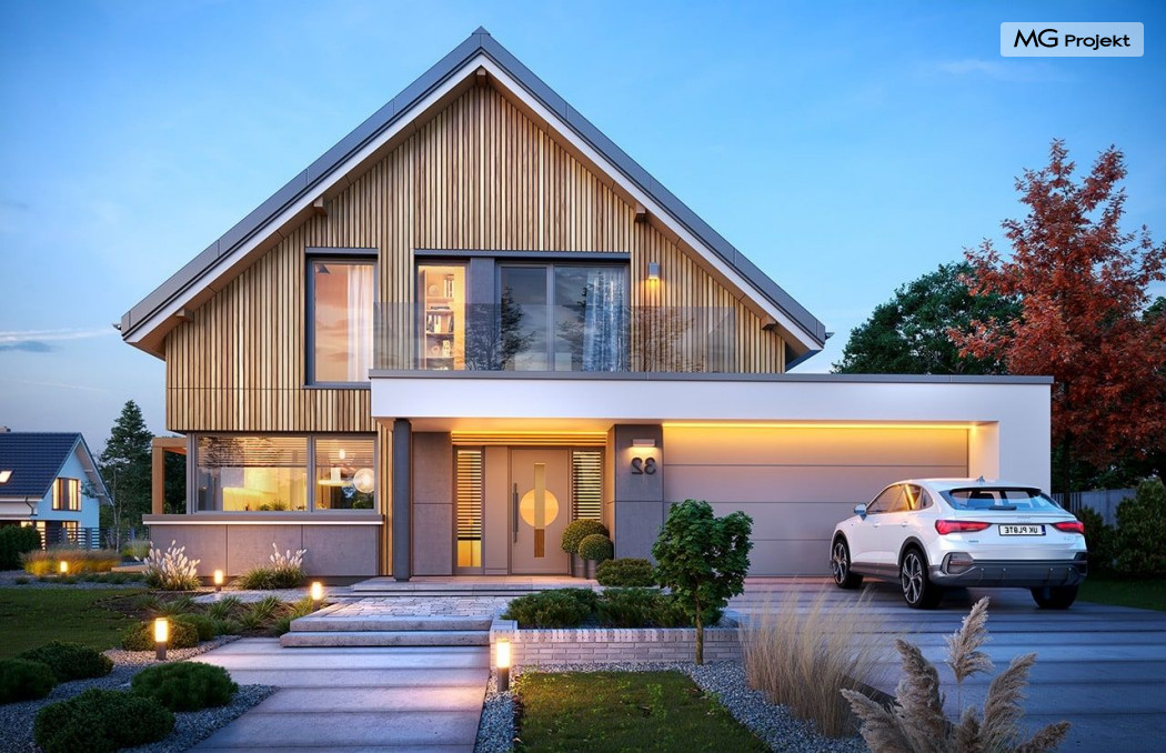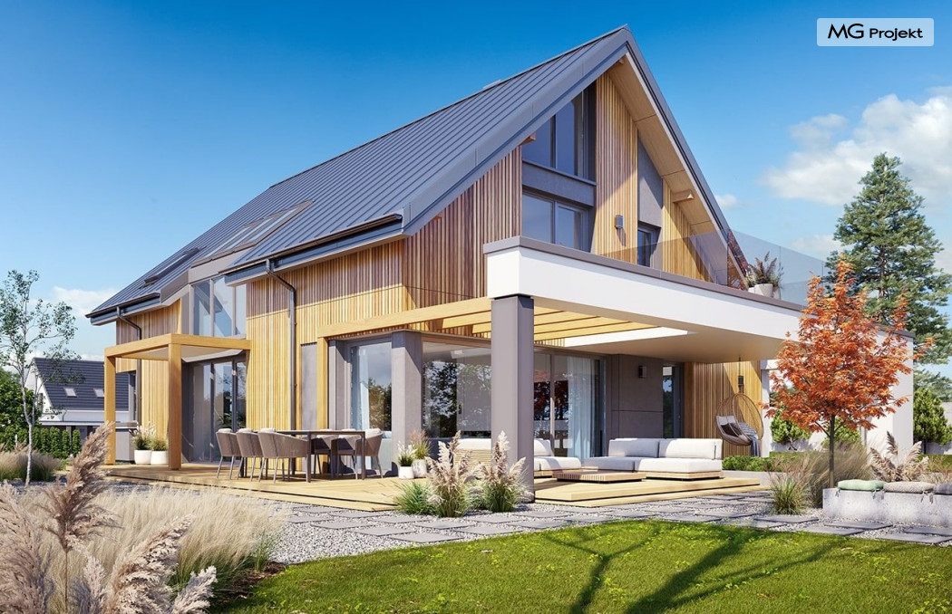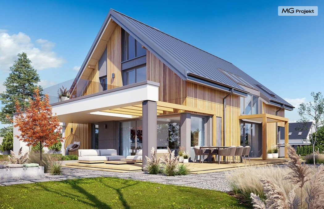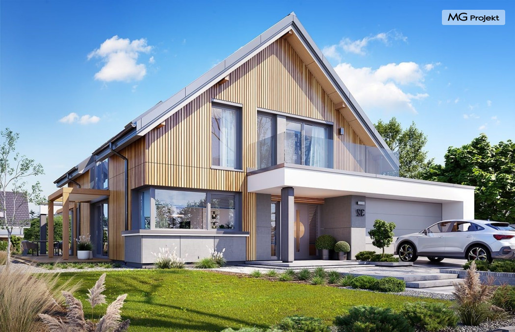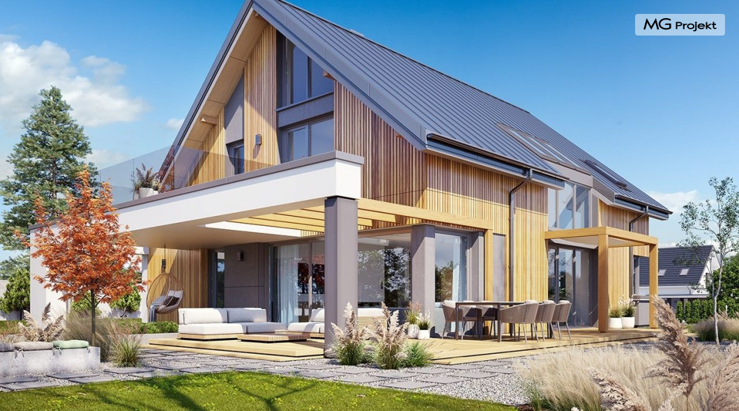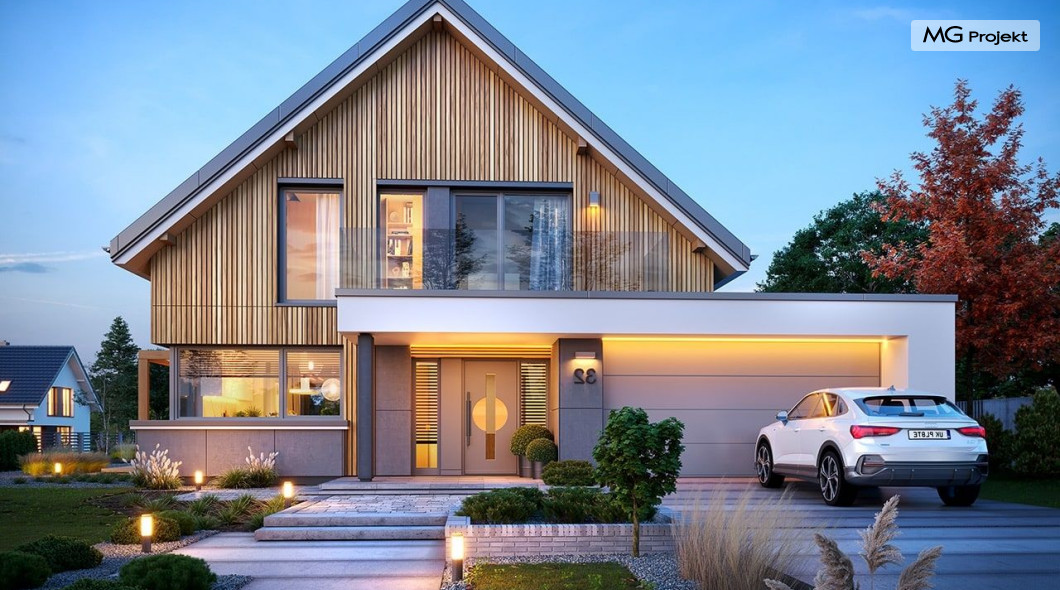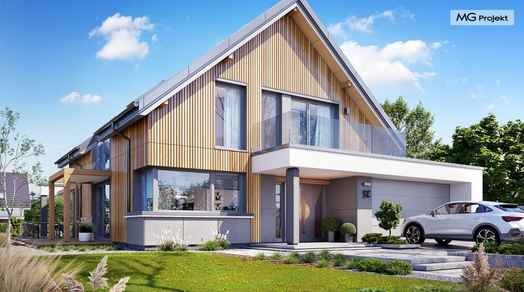 Projekt domu Amber jest to projekt parterowego domu jednorodzinnego z poddaszem użytkowym przeznaczonego dla 4-6 osobowej rodziny z serii „Amber”. Wariant „Amber 4” to wersja z oryginalną drewnianą elewacją ścian zewnętrznych. Dom zaprojektowano na planie prostokąta, z dobudowaną parterową bryłą garażu wstawioną w rdzeń budynku przykryty dwuspadowym dachem. Drewniana okładzina ścian, została skomponowana z szarymi i grafitowymi wstawkami, słupami, glifami i ramami okien. Od frontu dodatkowo zastosowano kontrastową białą płytę nad garażem i podestem wejściowym, a od strony ogrodu - białą konstrukcję zadaszenia tarasu. Taka kolorystyka i kompozycja materiałów tworzy niepowtarzalny styl budynku. W domu z każdej strony królują duże przeszklenia otwierające wnętrze na otaczający ogród. Reprezentacyjne drzwi wejściowe w elewacji frontowej z bocznymi naświetlami zapraszają do wnętrza. Wewnątrz na kondygnacji parteru zaprojektowano przestrzeń dzienną - z salonem, jadalnią, centralnym holem i frontowo usytuowaną kuchnia z wyspą. Salon pięknie otwiera się na taras i ogród szerokim przeszkleniem i wysokimi oknami jadalni z pustką z antresolą. Przestronna kuchnia została doświetlona pięknym narożnym oknem od frontu budynku. Na parterze przewidziano dodatkowy pokój z łazienką, oraz cześć gospodarczą z garażem i kotłownią. Poddasze to cztery pokoje sypialne, oraz dwie łazienki. Sypialnia rodziców jest oddzielnym apartamentem z własną łazienką i garderobą. Ścianki kolankowe zaprojektowano na tyle wysokie, aby maksymalnie umożliwić korzystanie z całości powierzchni podłóg. Budynek ma atrakcyjną sylwetkę zewnętrzną, funkcjonalne i efektowne wnętrze. Dzięki pustce nad częścią salonu i antresoli poddasza, dom zyskuje dodatkowe wrażenie przestronności. Budynek zaprojektowano jako energooszczędny - zastosowano tutaj nowoczesne ciepłe materiały i instalacje, dzięki czemu koszt eksploatacji budynku nie będzie wysoki. Dom ma dość prostą konstrukcje - powinien być łatwy w budowie. „Amber 4” to doskonała propozycja dla Inwestorów marzących o oryginalnym domu dla siebie - z rzucającą się w oczy ciekawą architekturą, oraz funkcjonalnym sensownym wnętrzu. Zapraszamy do zapoznania się ze wszystkimi domami z tej serii: https://www.mgprojekt.com.pl/amber, https://www.mgprojekt.com.pl/amber-2, https://www.mgprojekt.com.pl/amber-3, https://www.mgprojekt.com.pl/amber-4.