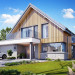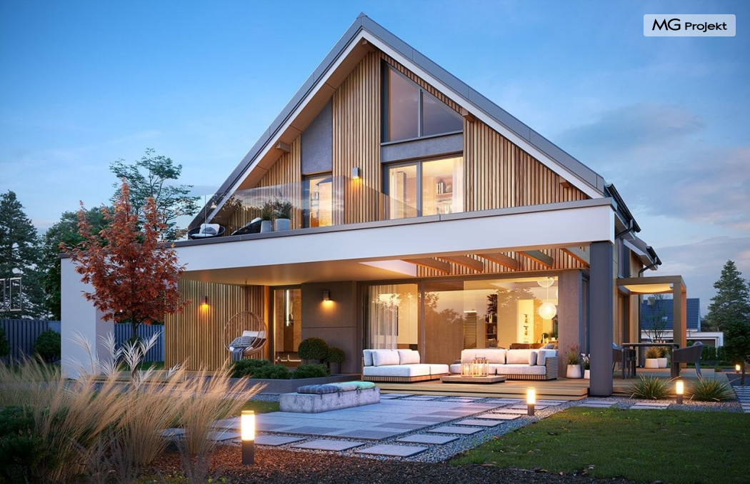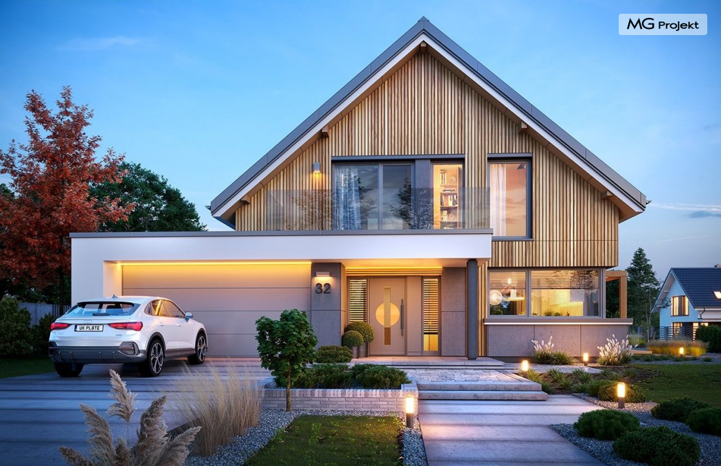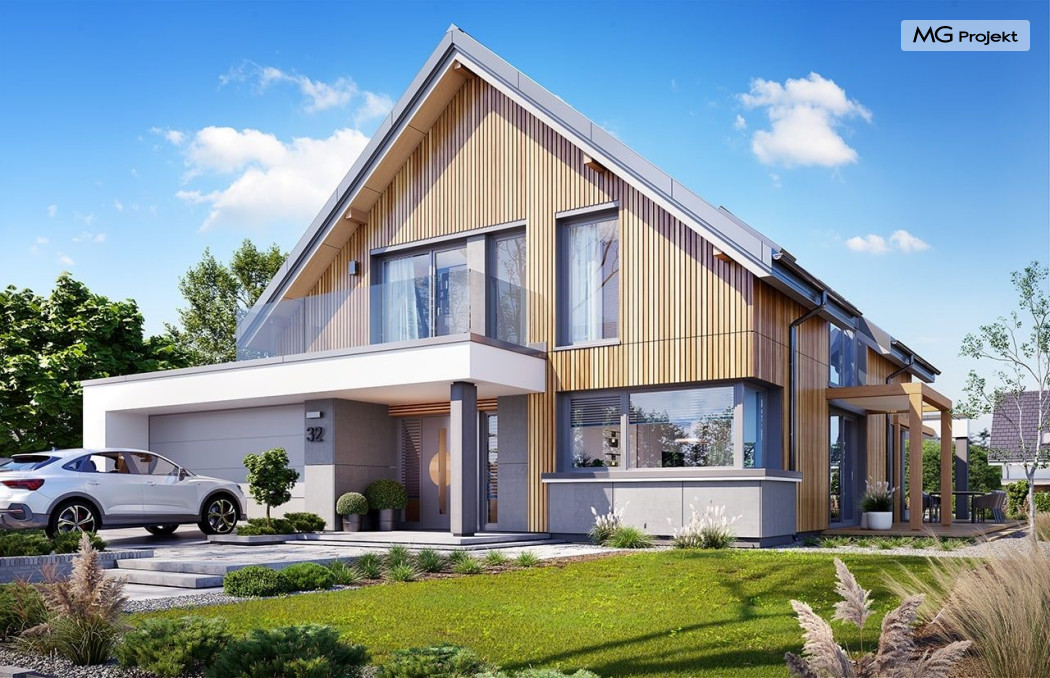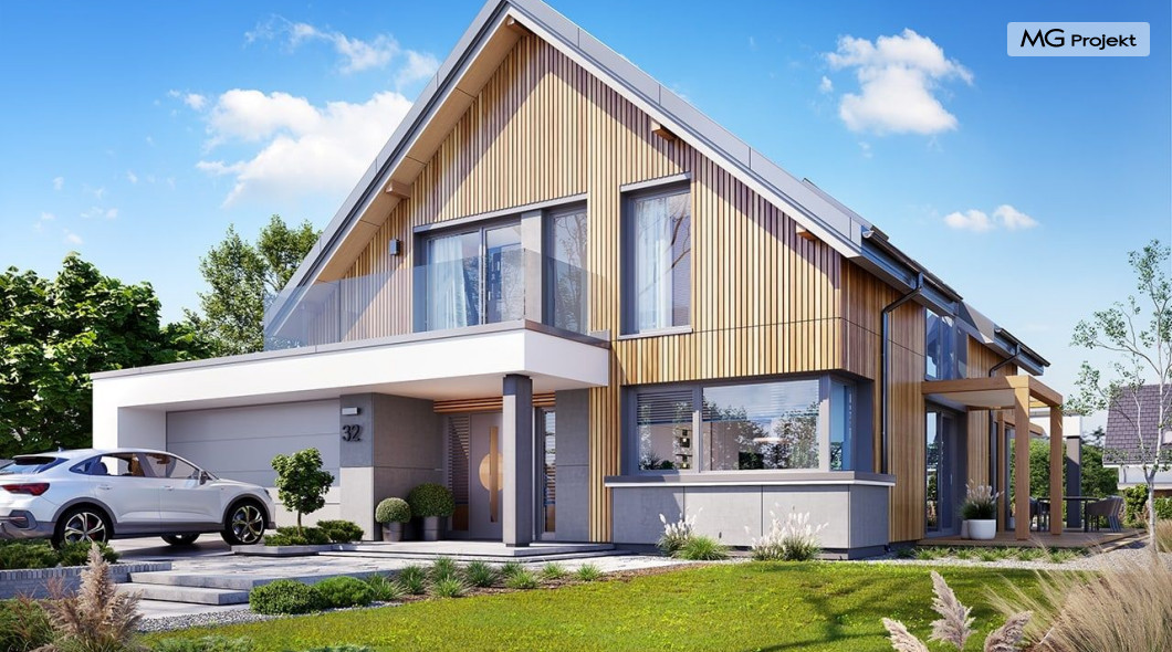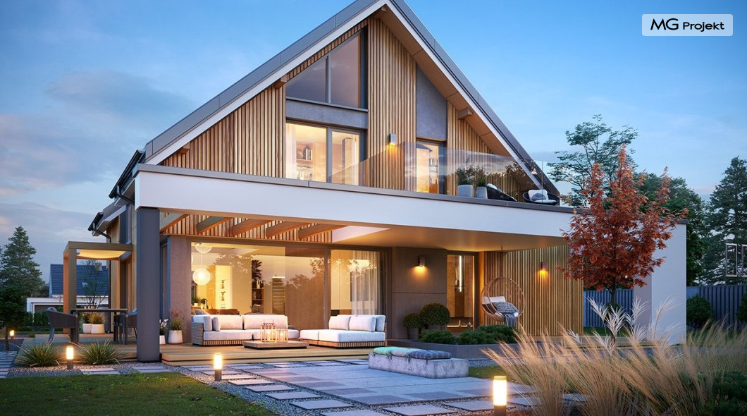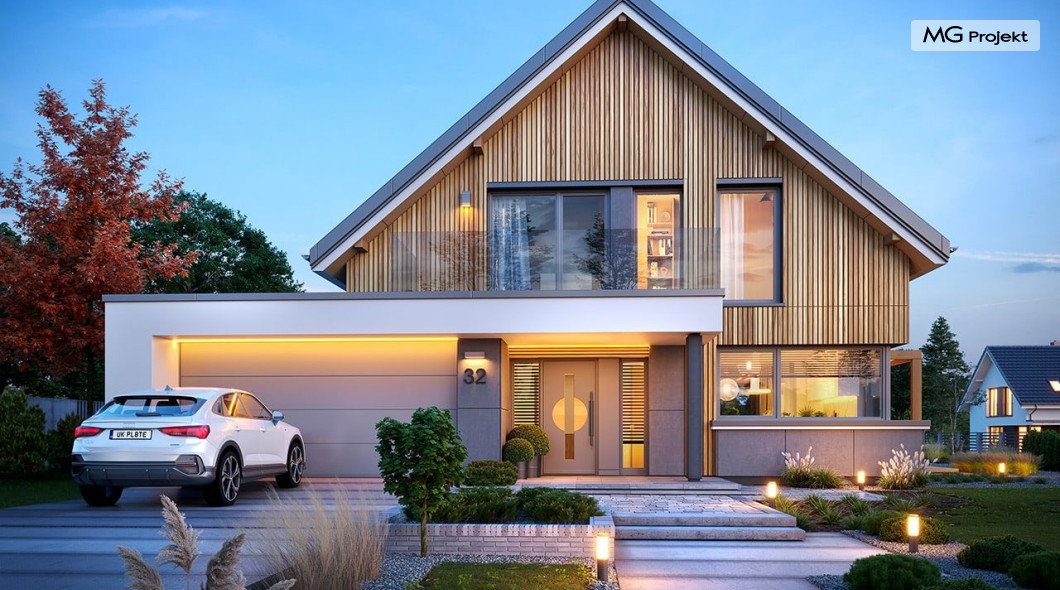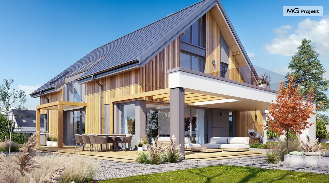 Projekt domu Amber jest to projekt parterowego domu jednorodzinnego z poddaszem użytkowym przeznaczonego dla 4-6 osobowej rodziny z serii „Amber”. Wariant „Amber 4” to wersja z oryginalną drewnianą elewacją ścian zewnętrznych. Dom zaprojektowano na planie prostokąta, z dobudowaną parterową bryłą garażu wstawioną w rdzeń budynku przykryty dwuspadowym dachem. Drewniana okładzina ścian, została skomponowana z szarymi i grafitowymi wstawkami, słupami, glifami i ramami okien. Od frontu dodatkowo zastosowano kontrastową białą płytę nad garażem i podestem wejściowym, a od strony ogrodu - białą konstrukcję zadaszenia tarasu. Taka kolorystyka i kompozycja materiałów tworzy niepowtarzalny styl budynku. W domu z każdej strony królują duże przeszklenia otwierające wnętrze na otaczający ogród. Reprezentacyjne drzwi wejściowe w elewacji frontowej z bocznymi naświetlami zapraszają do wnętrza. Wewnątrz na kondygnacji parteru zaprojektowano przestrzeń dzienną - z salonem, jadalnią, centralnym holem i frontowo usytuowaną kuchnia z wyspą. Salon pięknie otwiera się na taras i ogród szerokim przeszkleniem i wysokimi oknami jadalni z pustką z antresolą. Przestronna kuchnia została doświetlona pięknym narożnym oknem od frontu budynku. Na parterze przewidziano dodatkowy pokój z łazienką, oraz cześć gospodarczą z garażem i kotłownią. Poddasze to cztery pokoje sypialne, oraz dwie łazienki. Sypialnia rodziców jest oddzielnym apartamentem z własną łazienką i garderobą. Ścianki kolankowe zaprojektowano na tyle wysokie, aby maksymalnie umożliwić korzystanie z całości powierzchni podłóg. Budynek ma atrakcyjną sylwetkę zewnętrzną, funkcjonalne i efektowne wnętrze. Dzięki pustce nad częścią salonu i antresoli poddasza, dom zyskuje dodatkowe wrażenie przestronności. Budynek zaprojektowano jako energooszczędny - zastosowano tutaj nowoczesne ciepłe materiały i instalacje, dzięki czemu koszt eksploatacji budynku nie będzie wysoki. Dom ma dość prostą konstrukcje - powinien być łatwy w budowie. „Amber 4” to doskonała propozycja dla Inwestorów marzących o oryginalnym domu dla siebie - z rzucającą się w oczy ciekawą architekturą, oraz funkcjonalnym sensownym wnętrzu. Zapraszamy do zapoznania się ze wszystkimi domami z tej serii: https://www.mgprojekt.com.pl/amber, https://www.mgprojekt.com.pl/amber-2, https://www.mgprojekt.com.pl/amber-3, https://www.mgprojekt.com.pl/amber-4.