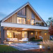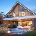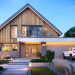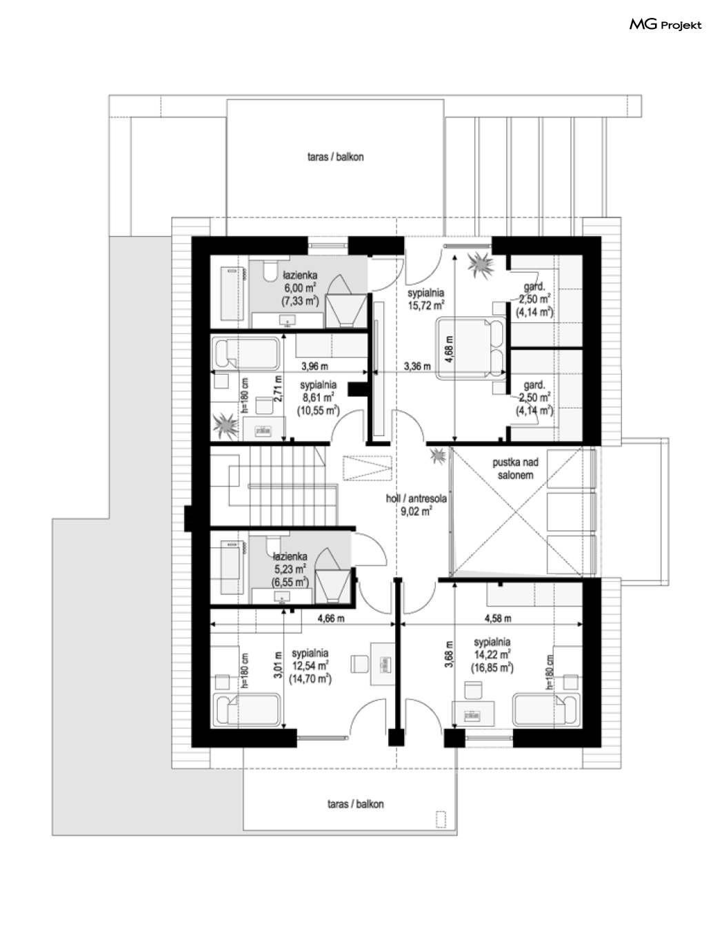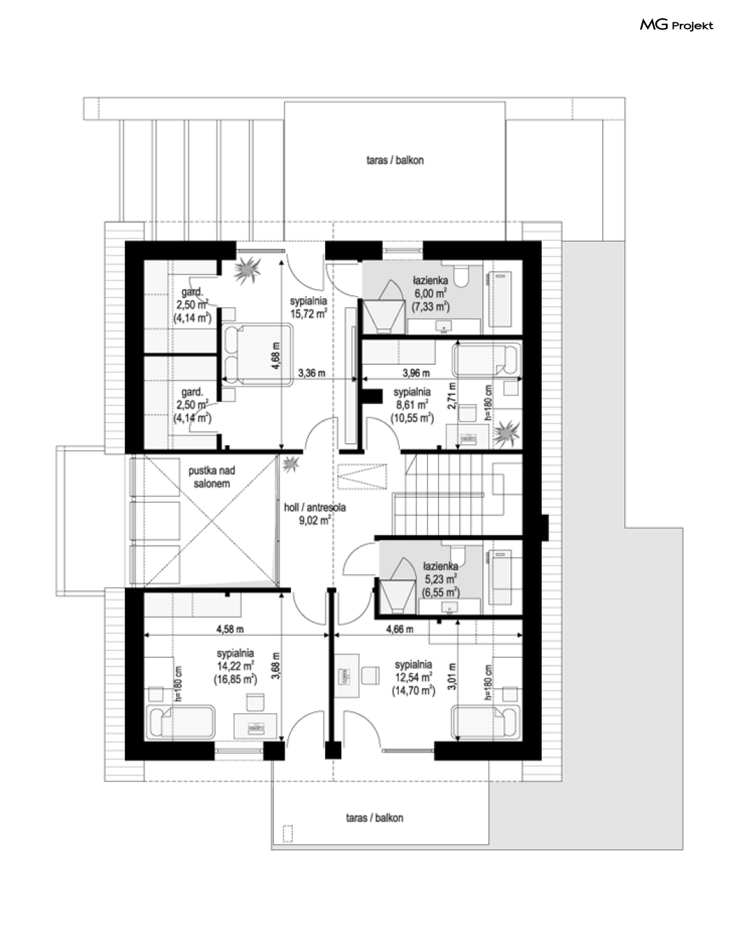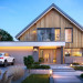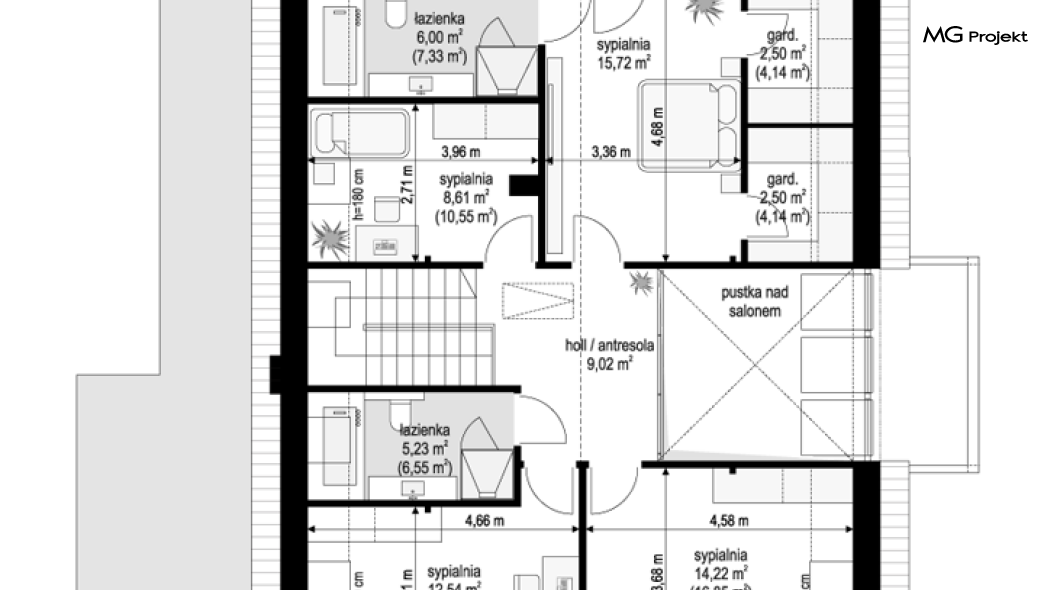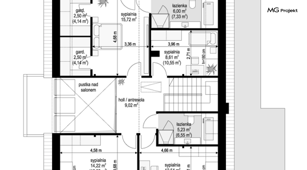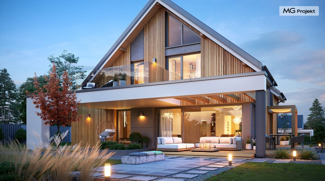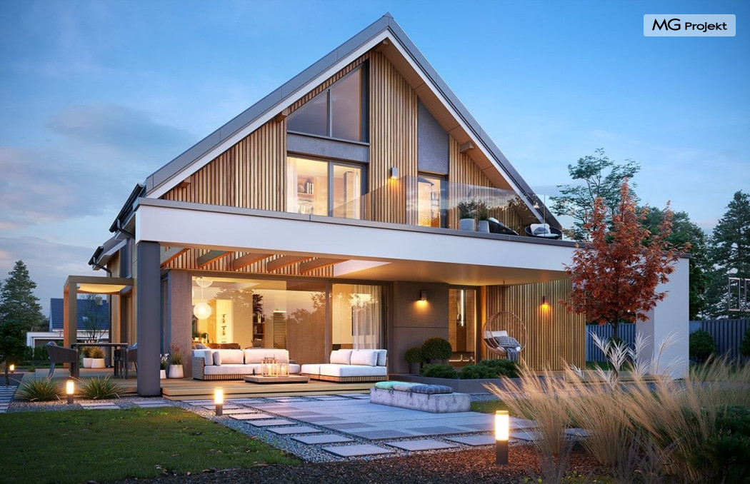 Projekt domu Amber jest to projekt parterowego domu jednorodzinnego z poddaszem użytkowym przeznaczonego dla 4-6 osobowej rodziny z serii „Amber”. Wariant „Amber 4” to wersja z oryginalną drewnianą elewacją ścian zewnętrznych. Dom zaprojektowano na planie prostokąta, z dobudowaną parterową bryłą garażu wstawioną w rdzeń budynku przykryty dwuspadowym dachem. Drewniana okładzina ścian, została skomponowana z szarymi i grafitowymi wstawkami, słupami, glifami i ramami okien. Od frontu dodatkowo zastosowano kontrastową białą płytę nad garażem i podestem wejściowym, a od strony ogrodu - białą konstrukcję zadaszenia tarasu. Taka kolorystyka i kompozycja materiałów tworzy niepowtarzalny styl budynku. W domu z każdej strony królują duże przeszklenia otwierające wnętrze na otaczający ogród. Reprezentacyjne drzwi wejściowe w elewacji frontowej z bocznymi naświetlami zapraszają do wnętrza. Wewnątrz na kondygnacji parteru zaprojektowano przestrzeń dzienną - z salonem, jadalnią, centralnym holem i frontowo usytuowaną kuchnia z wyspą. Salon pięknie otwiera się na taras i ogród szerokim przeszkleniem i wysokimi oknami jadalni z pustką z antresolą. Przestronna kuchnia została doświetlona pięknym narożnym oknem od frontu budynku. Na parterze przewidziano dodatkowy pokój z łazienką, oraz cześć gospodarczą z garażem i kotłownią. Poddasze to cztery pokoje sypialne, oraz dwie łazienki. Sypialnia rodziców jest oddzielnym apartamentem z własną łazienką i garderobą. Ścianki kolankowe zaprojektowano na tyle wysokie, aby maksymalnie umożliwić korzystanie z całości powierzchni podłóg. Budynek ma atrakcyjną sylwetkę zewnętrzną, funkcjonalne i efektowne wnętrze. Dzięki pustce nad częścią salonu i antresoli poddasza, dom zyskuje dodatkowe wrażenie przestronności. Budynek zaprojektowano jako energooszczędny - zastosowano tutaj nowoczesne ciepłe materiały i instalacje, dzięki czemu koszt eksploatacji budynku nie będzie wysoki. Dom ma dość prostą konstrukcje - powinien być łatwy w budowie. „Amber 4” to doskonała propozycja dla Inwestorów marzących o oryginalnym domu dla siebie - z rzucającą się w oczy ciekawą architekturą, oraz funkcjonalnym sensownym wnętrzu. Zapraszamy do zapoznania się ze wszystkimi domami z tej serii: https://www.mgprojekt.com.pl/amber, https://www.mgprojekt.com.pl/amber-2, https://www.mgprojekt.com.pl/amber-3, https://www.mgprojekt.com.pl/amber-4.