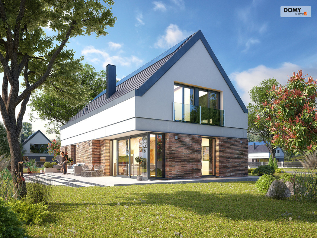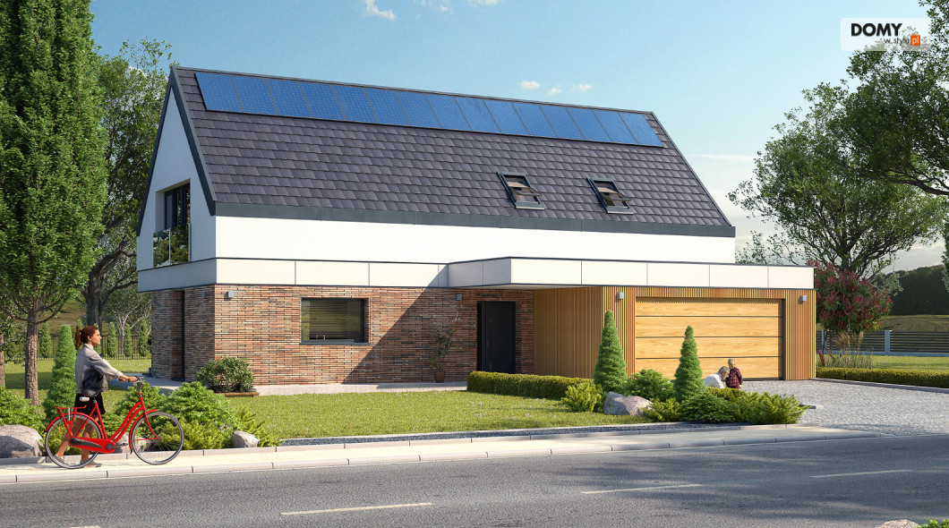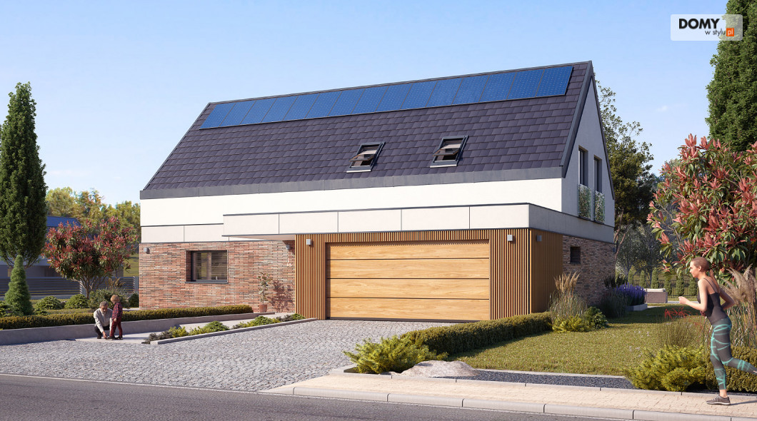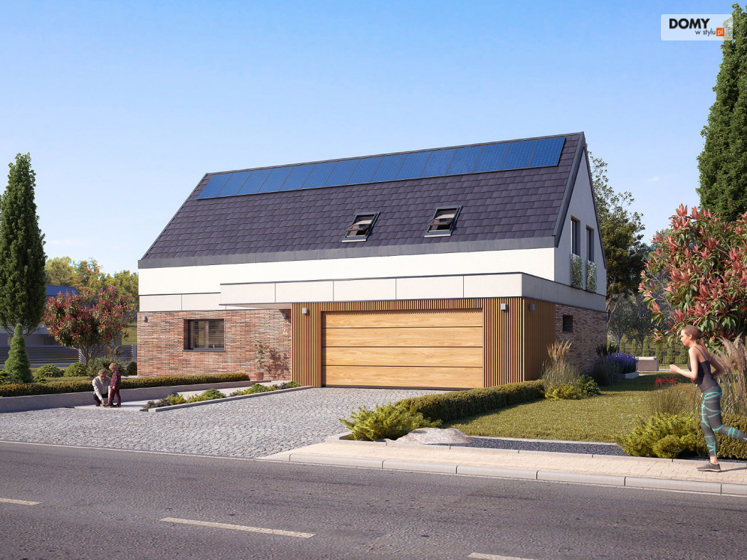DUO to projekt domu z użytkowym poddaszem zaprojektowany dla 3-pokoleniowej rodziny. Na powierzchni użytkowej 159 m2 pojawiło się wszystko czego może potrzebować współczesna rodzina. Projekt posiada otwartą część dzienną, w której pojawił się salon, jadalnia oraz otwarta kuchnia. W kuchni wygospodarowano miejsce na wyspę kuchenną, a obok pojawiła się spiżarnia. Spiżarnia stanowi jednocześnie łącznik pomiędzy kuchnia, a wiatrołapem co na pewno ułatwi wnoszenie zakupów. Na parterze zaprojektowano również dodatkowy pokój dla seniorów, czyli tzw. senioratkę. Seniorzy do dyspozycji mają również łazienkę, którą dostosowano do potrzeb osób niepełnosprawnych. Poddasze kryje w sobie cztery wygodne sypialnie oraz rodzinną łazienkę. Dwie sypialnie posiadają prywatną garderobę. Układ funkcjonalny poddasza dopełnia pralnia, w której oprócz prali i suszarki zaproponowano praktyczne półki. Projekt posiada dwustanowiskowy garaż.