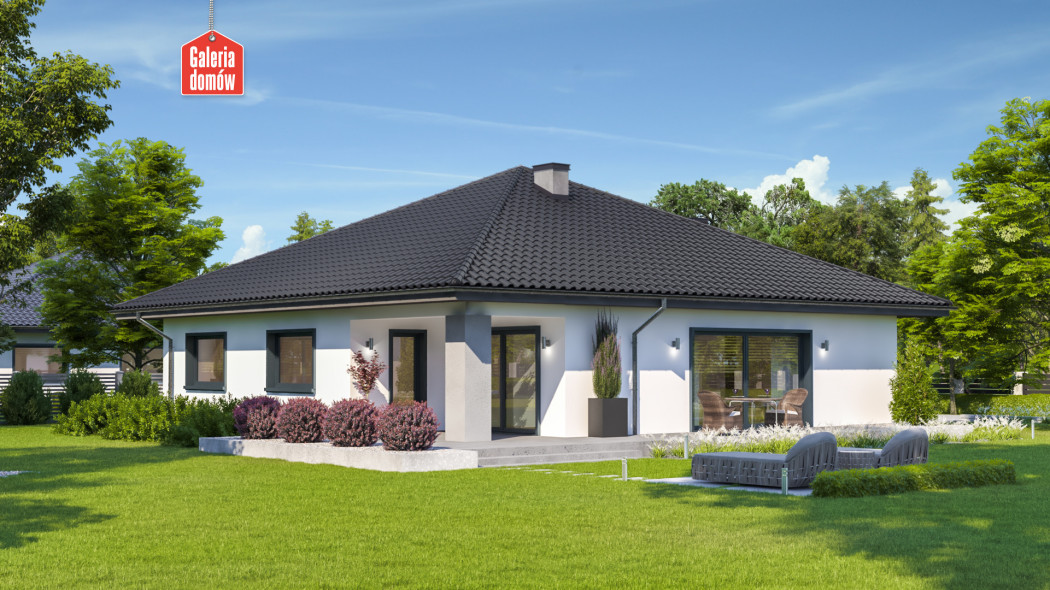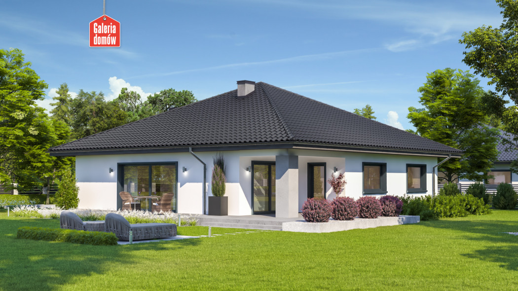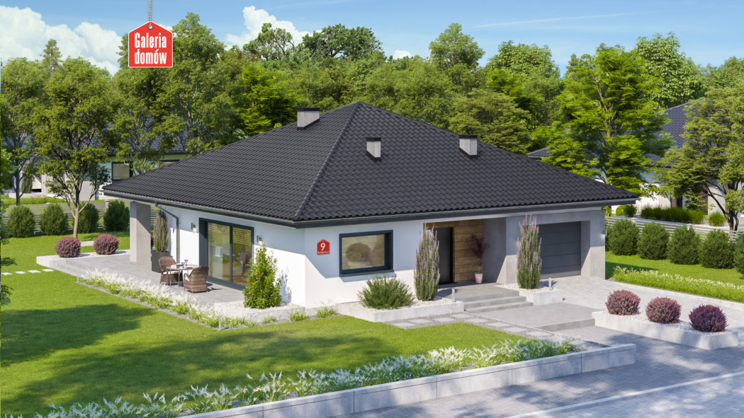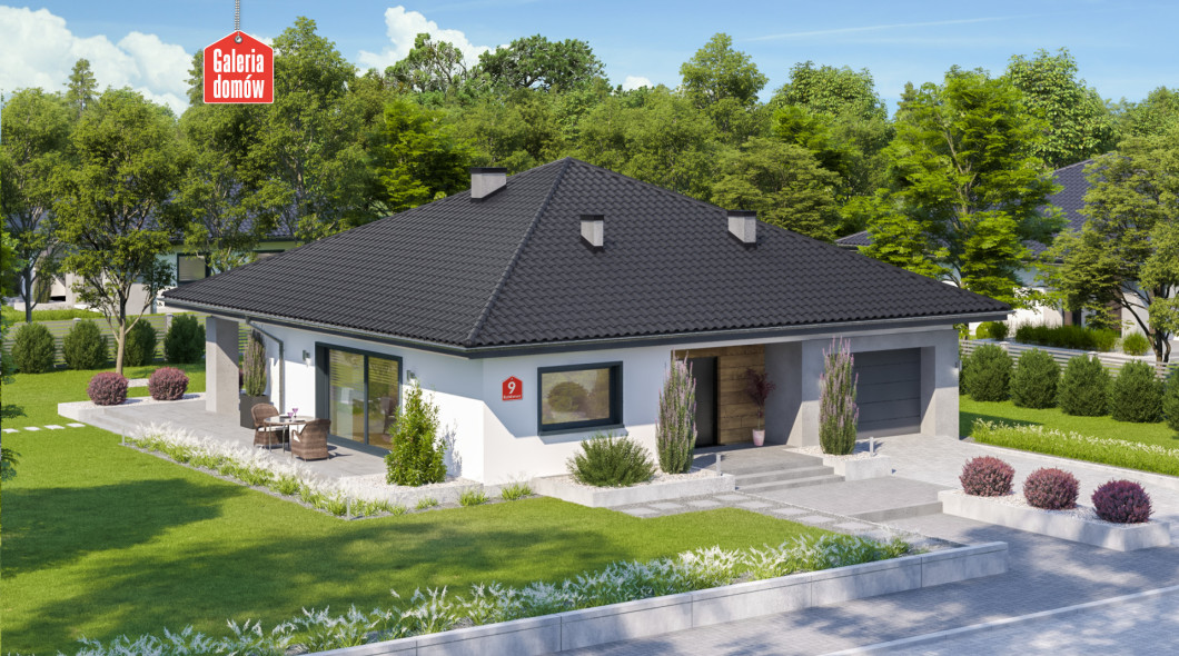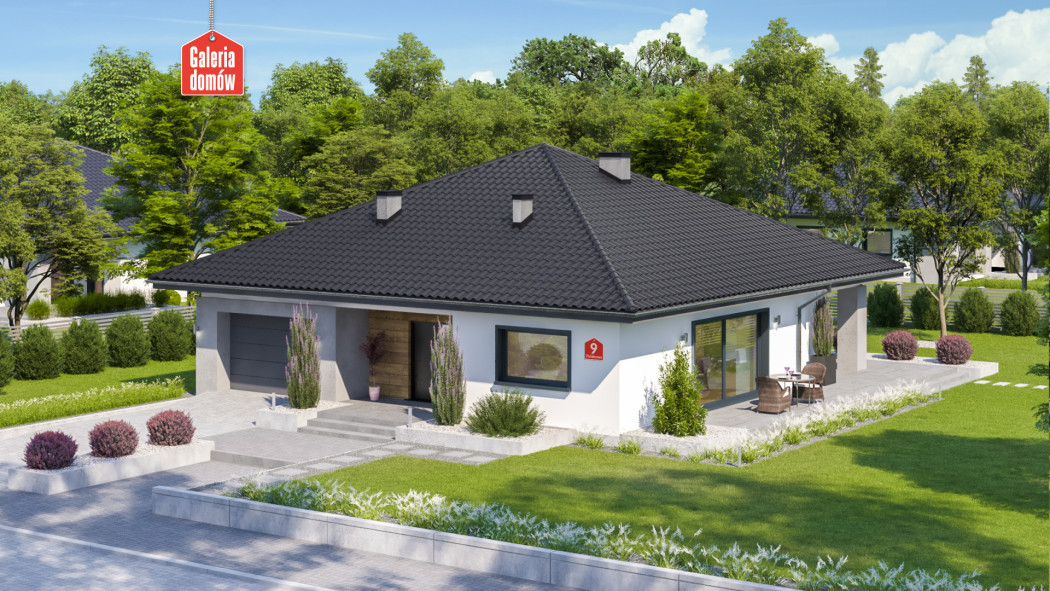 Dom przy Rubinowej 9 to nowoczesny projekt domu parterowego z dachem czterospadowym. Dom z pojedynczym garażem w bryle budynku. Program funkcjonalny zawiera salon z wyjściem na zadaszony taras, otwartą kuchnię i trzy sypialnie. Rubinowa 9 posiada dużą łazienkę oraz mniejszą toaletę. Zaplecze użytkowe to pokój gospodarczy i kotłownia. Dom zaprojektowany w technologii murowanej z drewnianą więźbą tradycyjną. Projekt domu energooszczędnego zgodny z warunkami technicznymi WT 2021. Doskonała propozycja dla 4-5 osobowej rodziny.