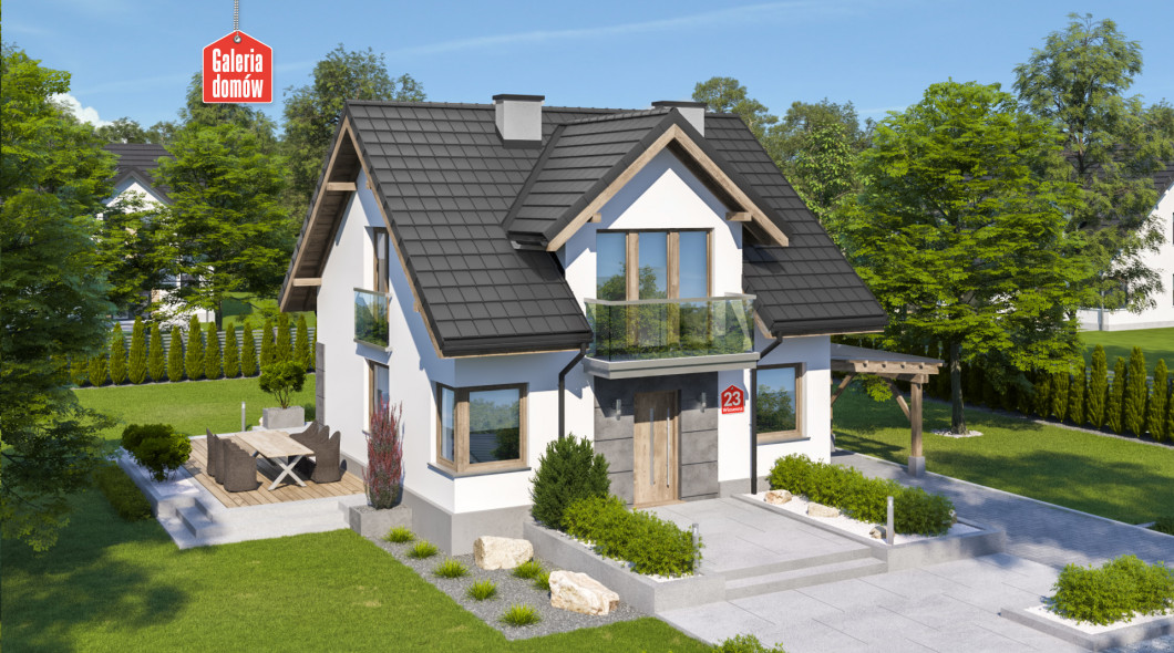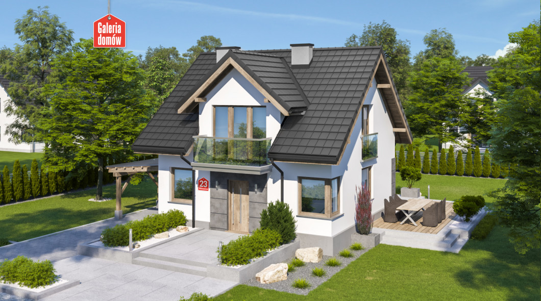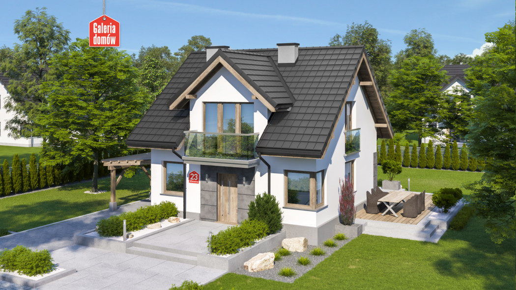 Dom przy Wiosennej 23 to niewielki budynek jednorodzinny, pasujący zarówno na wąskie działki oraz na większe parcele. Projekt domu z dachem dwuspadowym i kalenicą równoległą do drogi. Prosta konstrukcja i zwarta bryła gwarantują niskie koszty budowy, a dodatkowe projekty wentylacji mechanicznej z rekuperacją oraz instalacji solarnej umożliwiają ekonomiczne użytkowanie budynku.