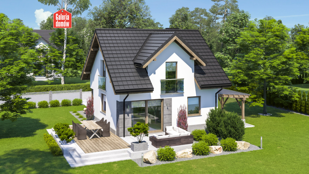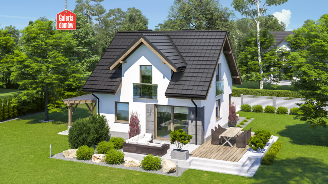 Na parterze zaprojektowano słoneczną strefę dzienną, składającą się z otwartej kuchni i salonu. Poza tym do dyspozycji mieszkańców oddano również dodatkowy pokój, łazienkę i kotłownię. Aby ograniczyć koszty budowy zastosowano lekką wiatę garażową, zamiast garażu w bryle budynku. Na poddaszu przewidziano trzy sypialnie oraz główną łazienkę. Przewidziano tu jeden balkon frontowy, natomiast pozostałe dwa zaprojektowano w stylistyce francuskiej, co również wpływa na obniżenie kosztów budowy.