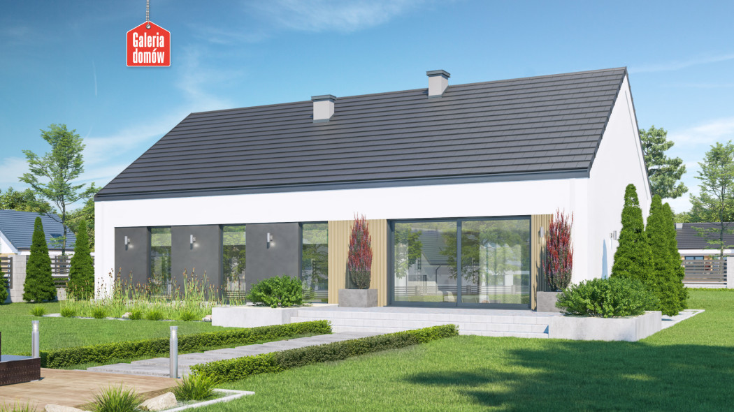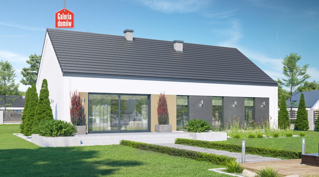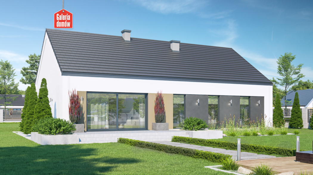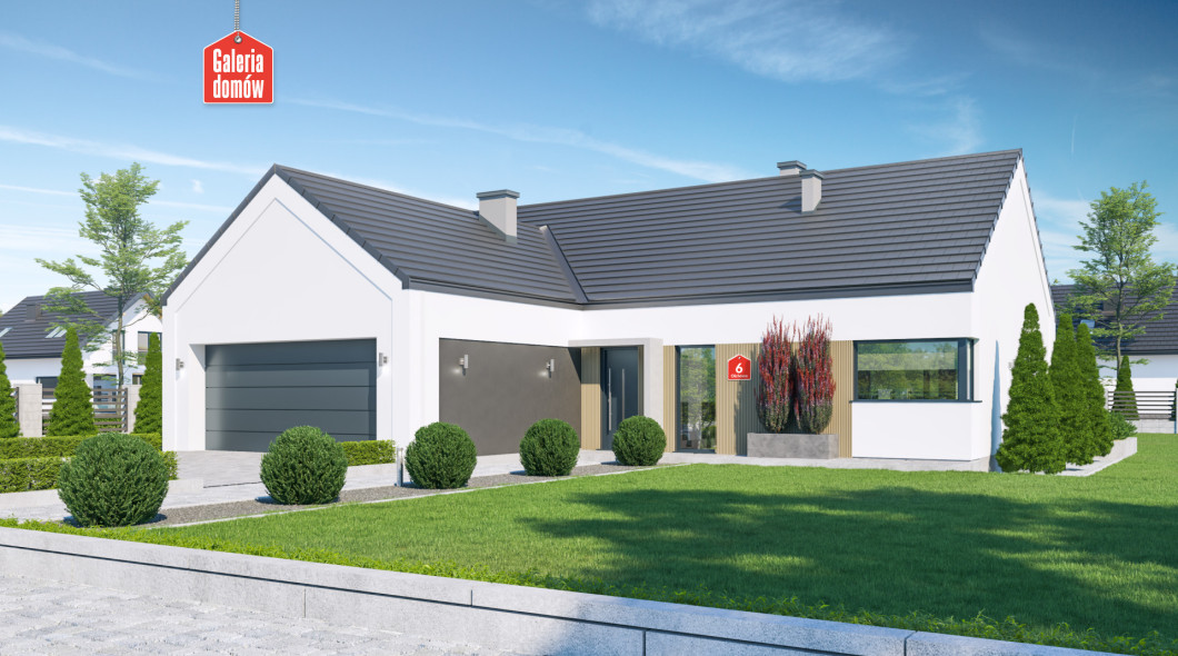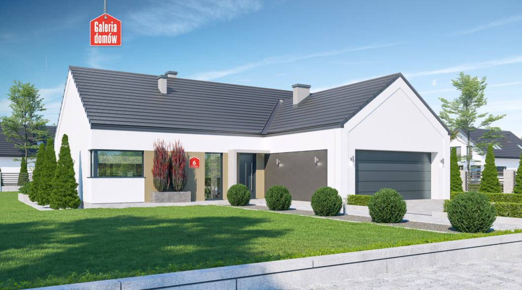 Dom przy Olchowej 6 to projekt domu jednorodzinnego z podwójnym garażem w bryle budynku. Dachem dwuspadowy, kalenica równoległa do drogi. Budynek parterowy o powierzchni użytkowej 120 m². Tani i szybki w budowie, oszczędny w użytkowaniu. Program użytkowy zawiera salon, otwartą kuchnię, 4 pokoje, łazienkę, toaletę, oraz kotłownię ze stanowiskiem na pralkę. Dach dwuspadowy, bezokapowy, biało-stalowa kolorystyka elewacji, stolarka w odcieniach inox . Projekt opracowany w oparciu o warunki techniczne WT 2021 i dostosowany do eurokodów. Budynek zaprojektowany w technologii tradycyjnej, murowanej. Olchowa 6 to energooszczędny projekt domu dla większej rodziny utrzymany w stylistyce „nowoczesnej stodoły”.