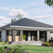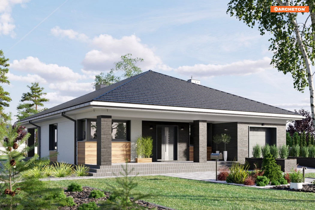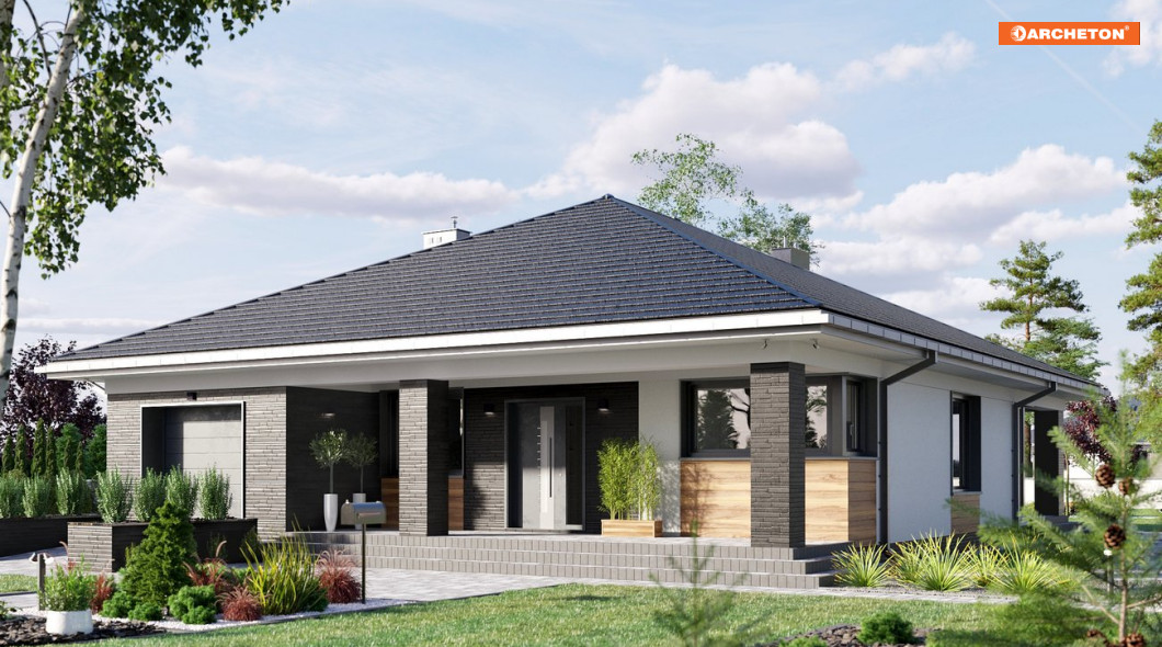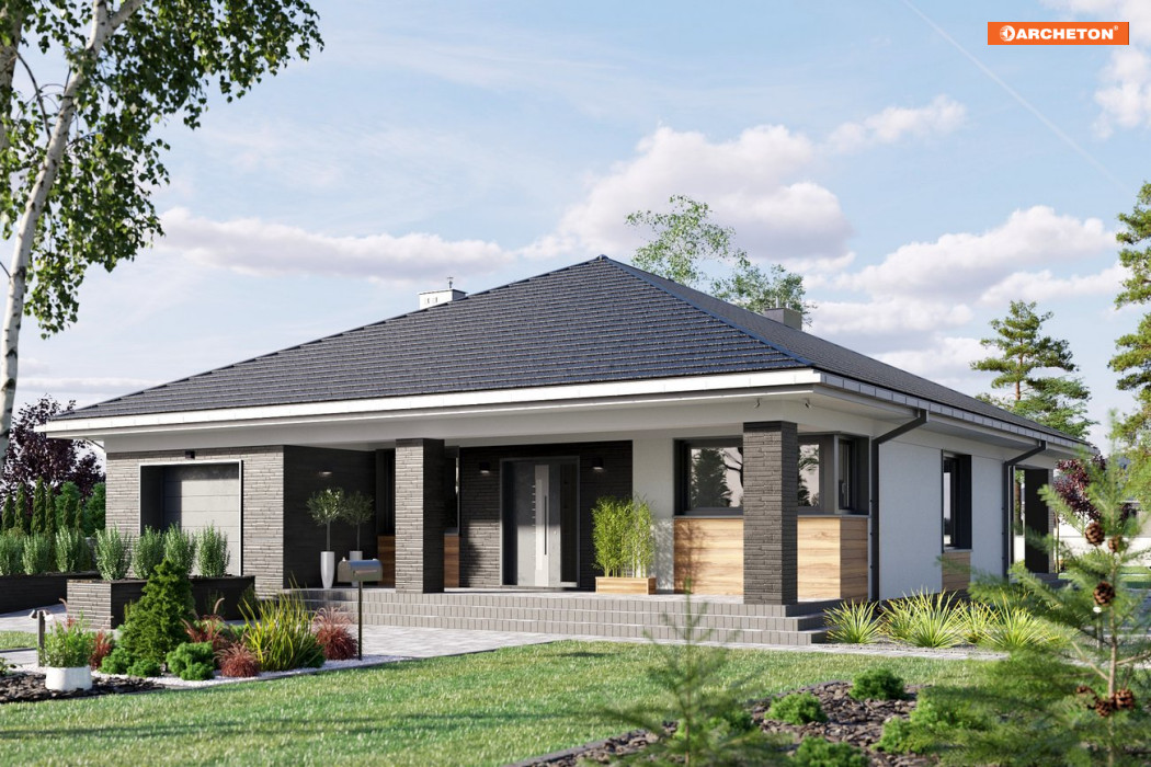 Dom parterowy dla 4-osobowej rodziny Ajaks Prima bardziej niż jego poprzednik nawiązuje do nowoczesnych trendów w architekturze. Dotyczy to przede wszystkim kolorystyki, bo dominują tu modne szarości i antracyty, które stanowią kontrastowe elementy na białej elewacji. Całość ocieplają akcenty drewnopodobne pod oknami.