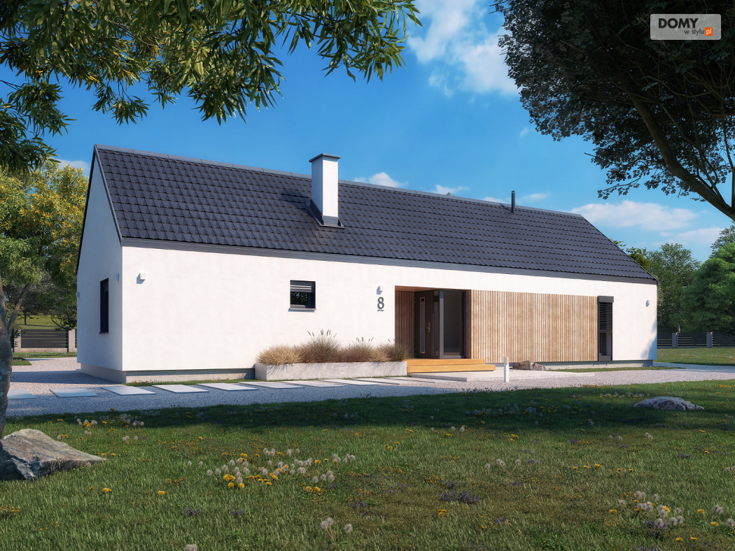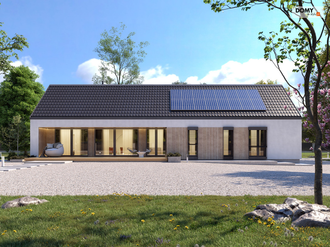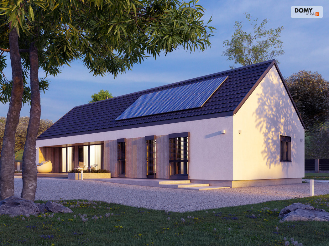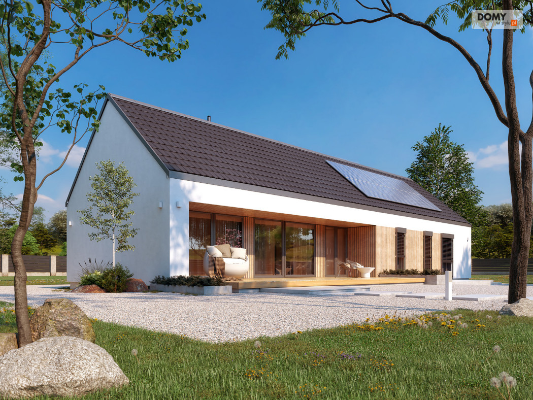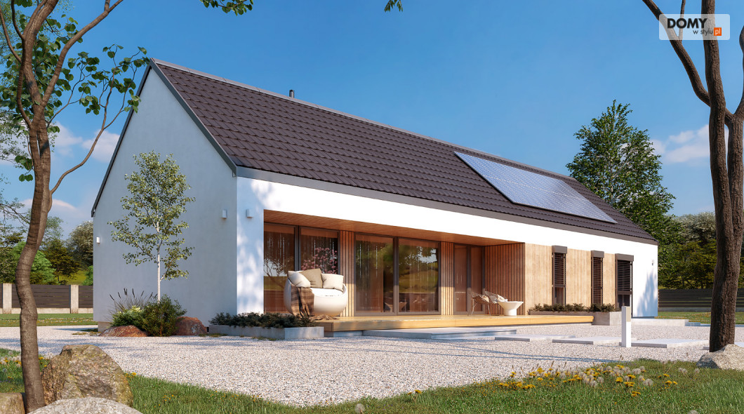 Paproć 5 to projekt domu parterowego zaprojektowany w stylu nowoczesnej stodoły. Projekt posiada prostą bryłę przykrytą dwuspadowym dachem z licznymi przeszkleniami. W domu przewidziano otwartą strefę dzienną z salonem, kuchnią i jadalnią. Mieszkańcy do dyspozycji mają trzy wygodne sypialnie oraz rodzinną łazienkę. Największa sypialnia zaprojektowana została jako apartament gospodarzy, posiada bowiem prywatną łazienkę oraz długi ciąg szafek garderobianych. Układ funkcjonalny domu dopełnia wiatrołap, niewielkie WC oraz pomieszczenie techniczne.