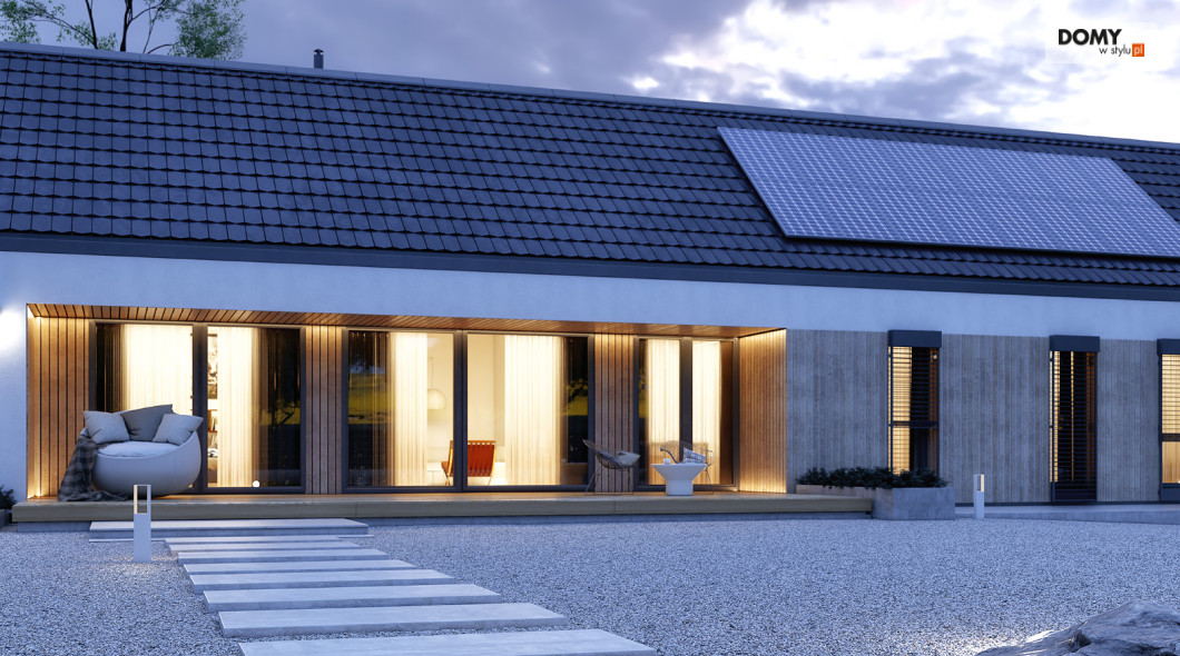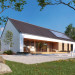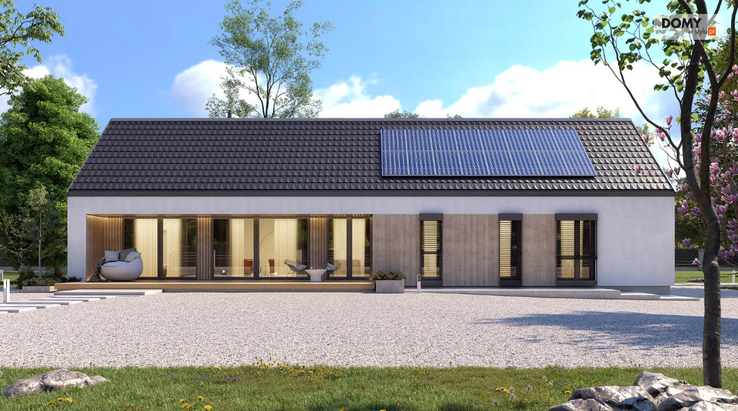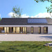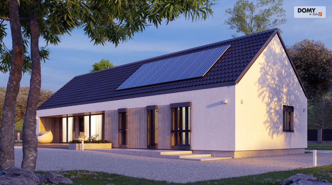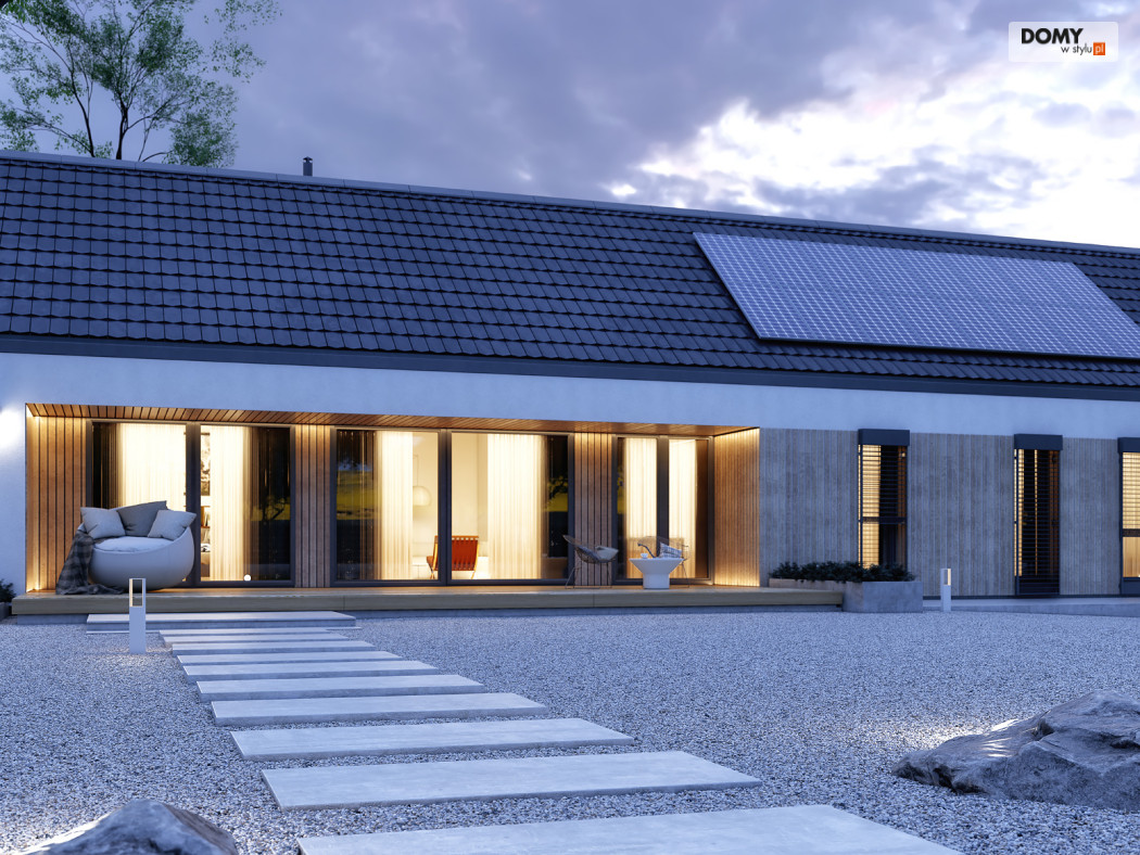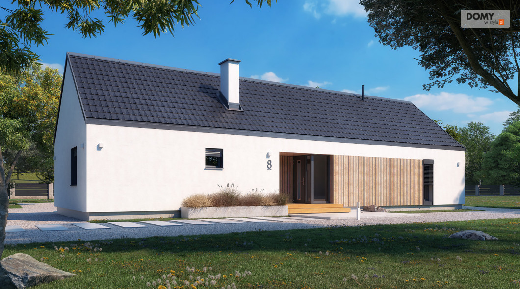Paproć 5 to projekt domu parterowego zaprojektowany w stylu nowoczesnej stodoły. Projekt posiada prostą bryłę przykrytą dwuspadowym dachem z licznymi przeszkleniami. W domu przewidziano otwartą strefę dzienną z salonem, kuchnią i jadalnią. Mieszkańcy do dyspozycji mają trzy wygodne sypialnie oraz rodzinną łazienkę. Największa sypialnia zaprojektowana została jako apartament gospodarzy, posiada bowiem prywatną łazienkę oraz długi ciąg szafek garderobianych. Układ funkcjonalny domu dopełnia wiatrołap, niewielkie WC oraz pomieszczenie techniczne.