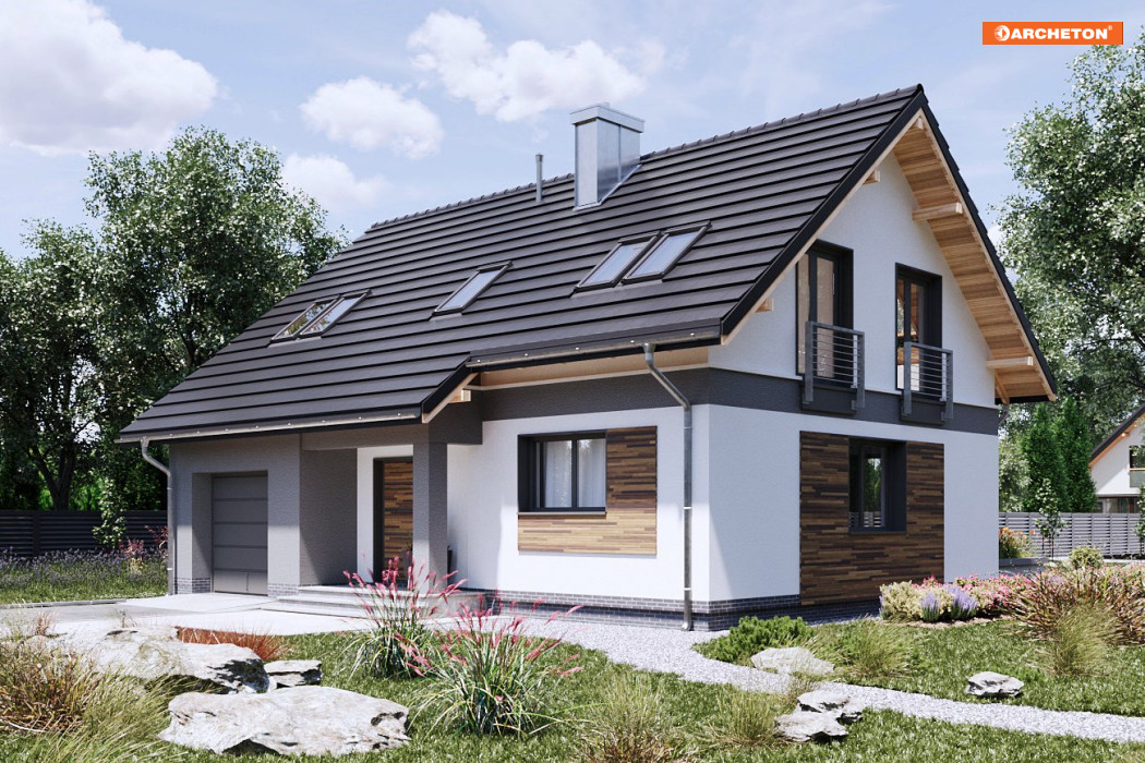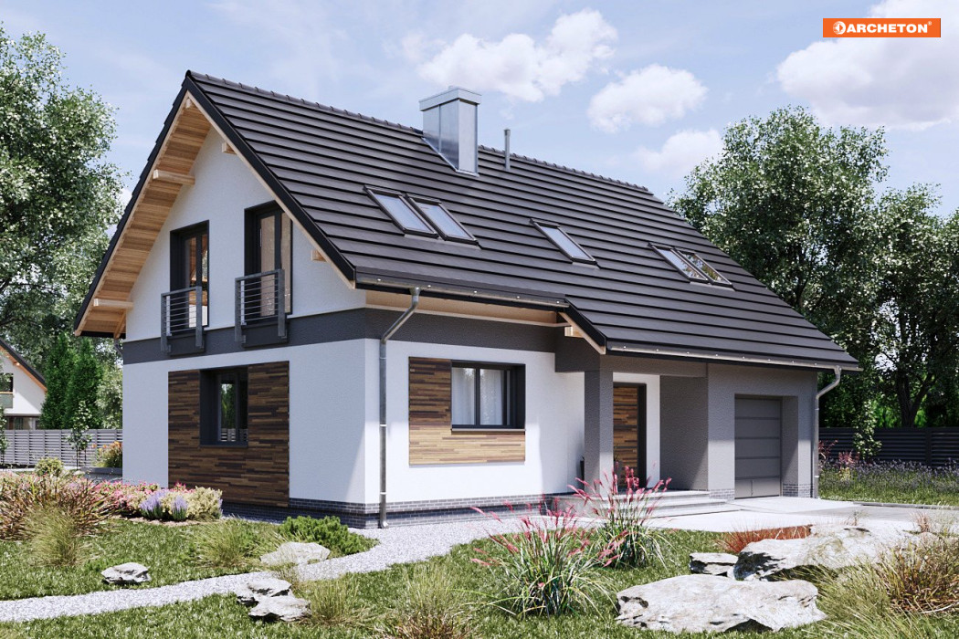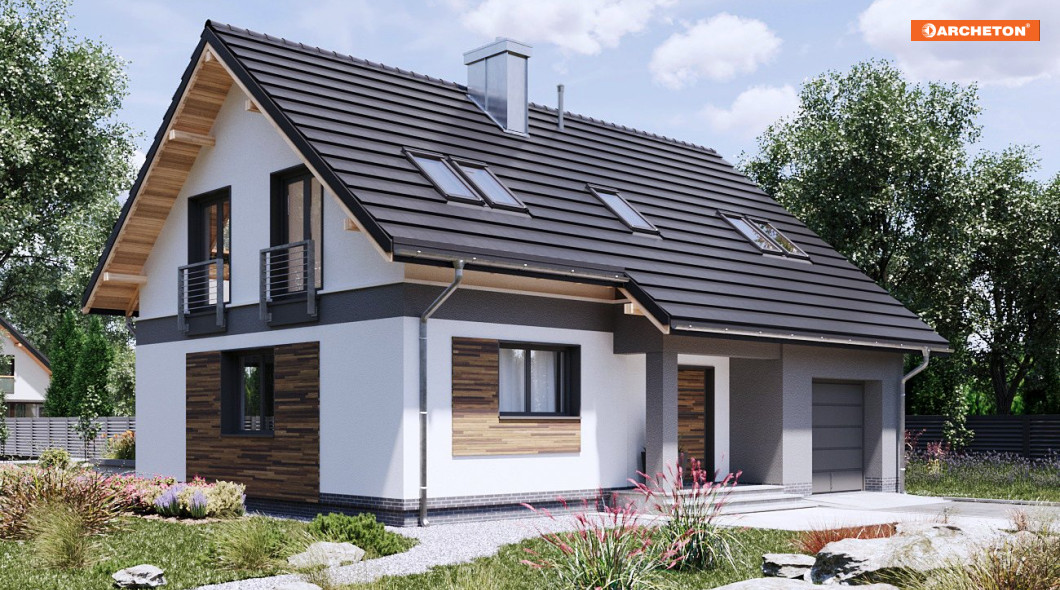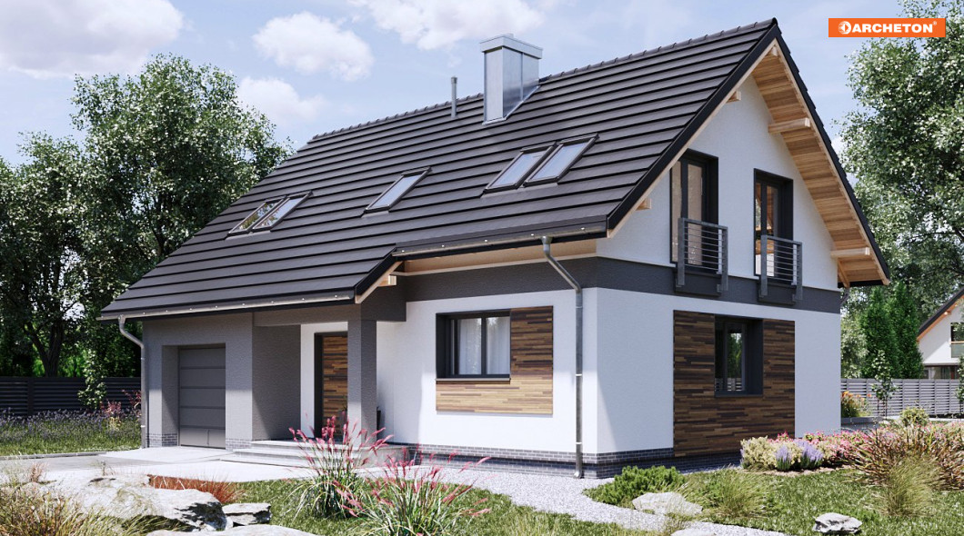 Projekty z rodziny Skarbka mają wszelkie cechy taniego, ładnego i funkcjonalnego domu. Zwarty prostopadłościan mieści mieszkanie i wysunięty ku frontowi garaż - wszystko pod dwuspadowym dachem. W Skarbku Neo Sol przy niedużej powierzchni na parterze powstało przestrzenne rozwiązanie z otwartym pokojem dziennym. Powierzchnia kuchni pozwala na wydzielenie spiżarni. Podobnie starannie rozplanowano użytkowe poddasze. Są tu cztery sypialnie, wygodna łazienka oraz pralnia. Aby pomieszczenia zyskały jeszcze większą ilość światła dziennego zastosowano nowy zestaw montażowy VELUX DUO, który daje możliwość zainstalowania obok siebie dwóch okien dachowych. Uzyskujemy panoramiczny widok, elegancki wygląd, ale również oszczędność, gdyż pomieszczenia nie muszą być doświetlane światłem elektrycznym.