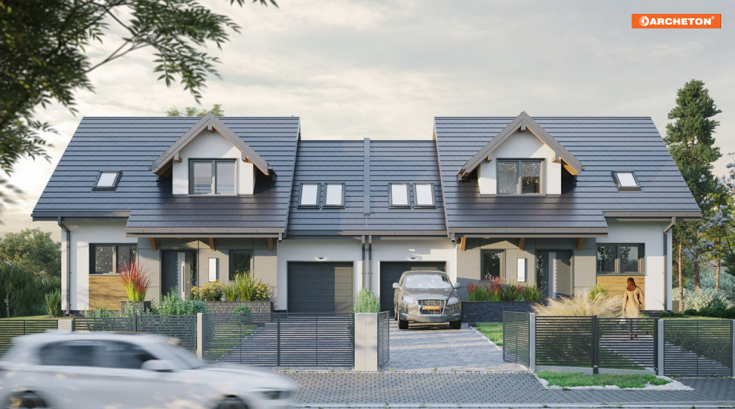 Efektowną ozdobą projektu bliźniaków połączonych garażem Tosia Nano Duo są m.in. lukarny, które dodają całości charakteru, przełamują płaszczyznę dachu i pozwalają na skuteczne doświetlenie pomieszczeń poddasza. Ciekawym akcentem jest też obniżenie dachu nad garażem, co daje wrażenie przenikających się, geometrycznych brył